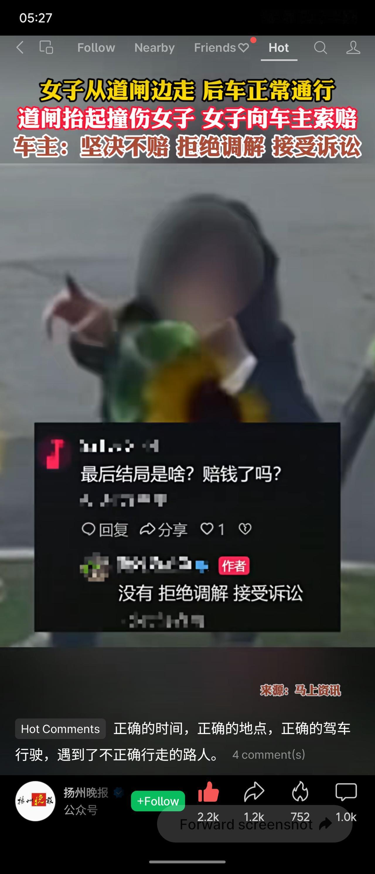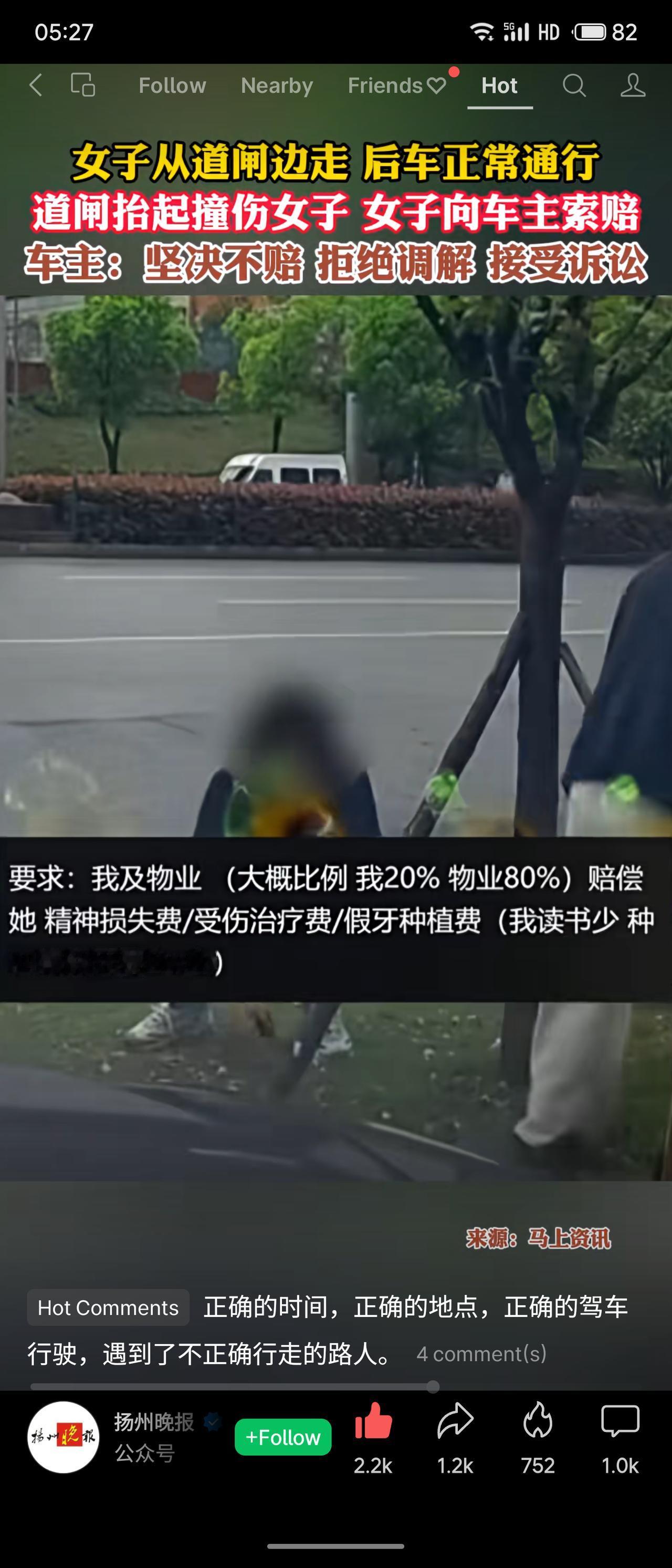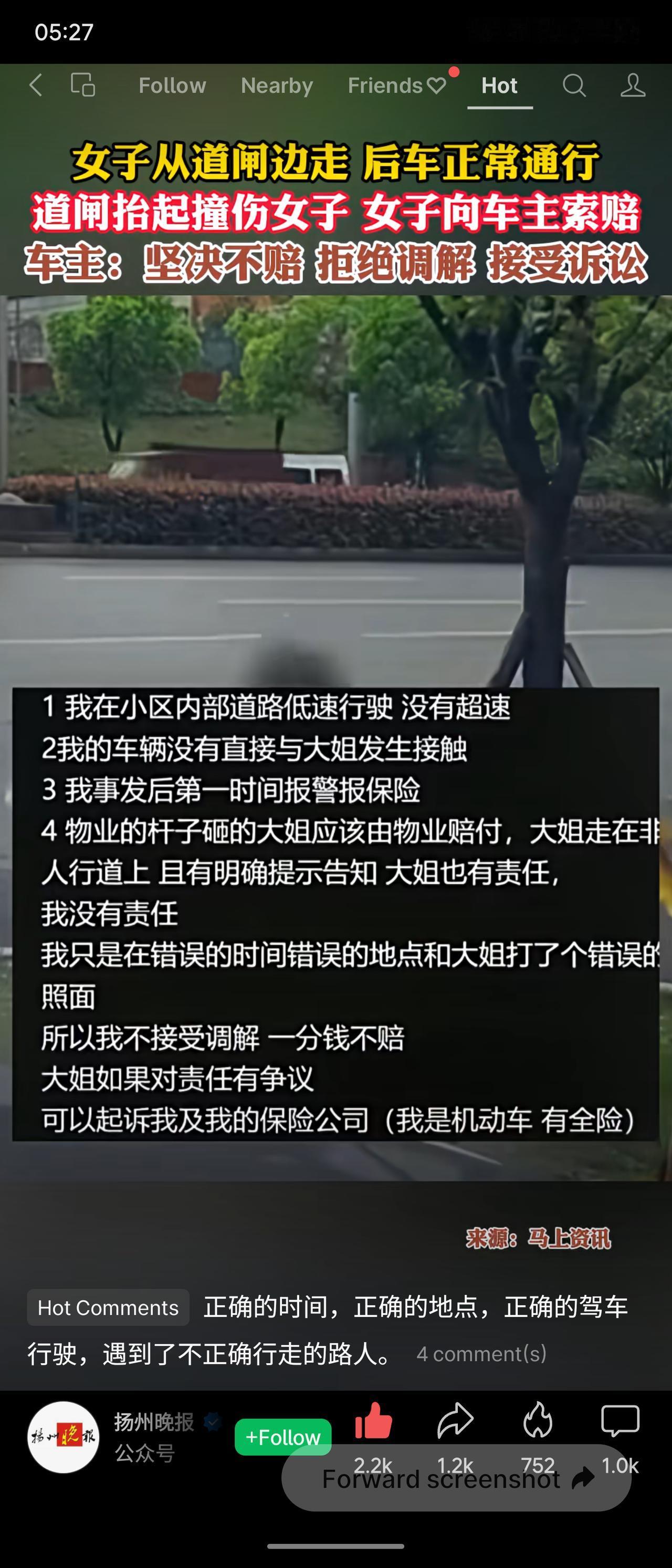 一位女子在小区道闸旁行走,后车正常通过,道闸抬起时将她撞伤。女子向车主索赔医疗费、假牙种植费等,要求车主与物业按20%和80%比例赔偿。车主以未超速、未直接接触、已报警保险为由拒绝,认为应由物业负责,女子自身也未走人行道。车主坚决不接受调解,表示“一分不赔,接受诉讼”。从法律看,道闸管理责任主要在物业,行人也有过错,车主无直接责任。车主态度理性合法,拒绝不合理索赔值得肯定。