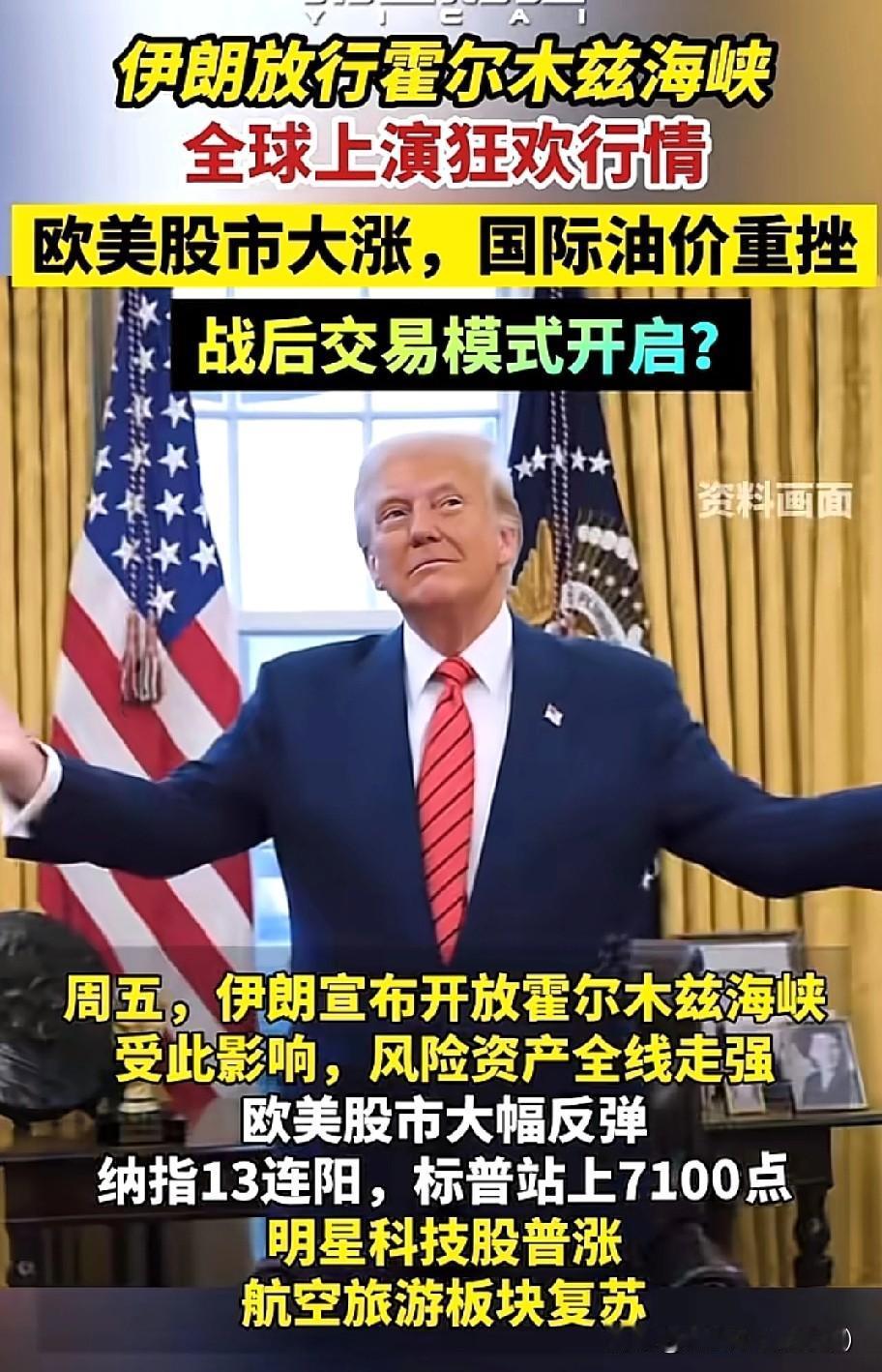 特朗普公开喊话感谢伊朗! 周五,伊朗宣布在停火期间全面开放霍尔木兹海峡,这一句话直接引爆了全球市场的狂欢行情。 国际油价应声暴跌,WTI原油日内一度跌超11%,彻底抹平了中东冲突带来的“战争溢价”。而另一边,欧美股市全线大涨,纳斯达克指数冲击13连阳,标普500站上7100点关口,科技股、航空旅游板块集体走强,避险情绪瞬间退潮。 作为全球石油运输的“咽喉要道”,霍尔木兹海峡承载着全球近30%的海运原油贸易,此前冲突升级的担忧一直像悬在市场头顶的利剑。如今通航恢复,不仅让油价大幅回落,更让全球风险资产迎来一波集体反弹。 不过也要提醒,这波“战后交易模式”的开启,前提是停火协议的稳定。一旦局势反复,市场情绪随时可能再次逆转,现在的狂欢里,藏着不少不确定性。
