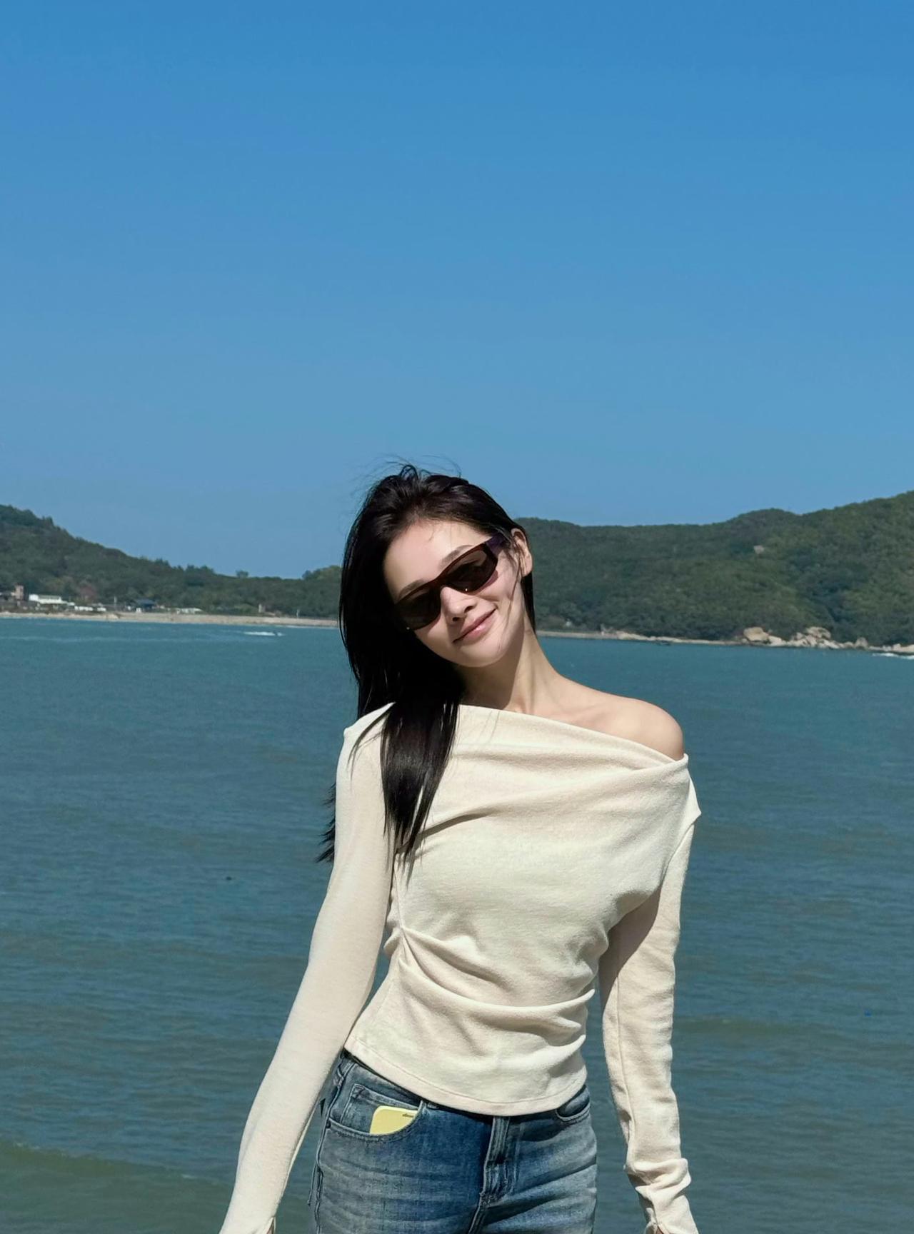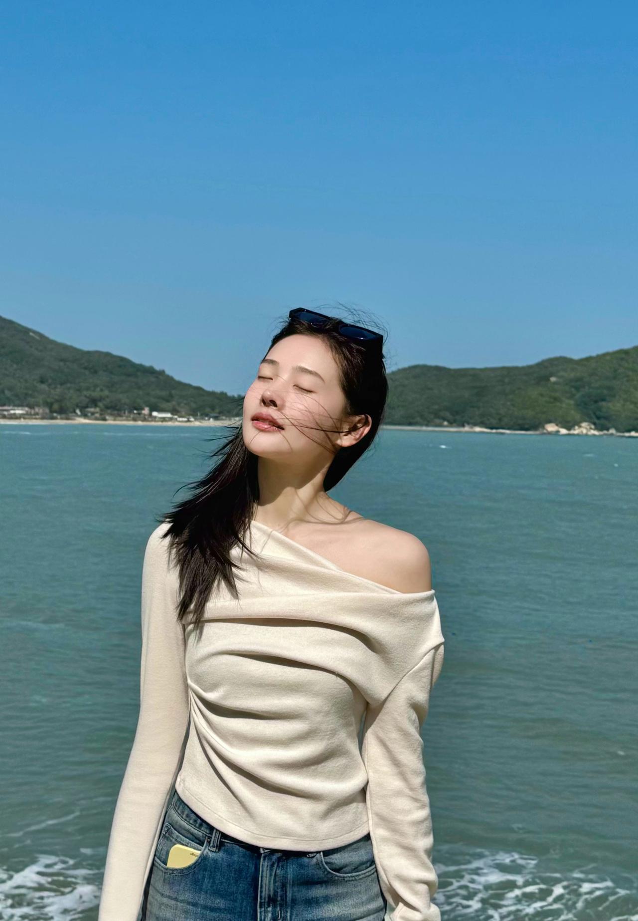 首尔街头的风,带着阳光的温度。浅粉针织衫搭配牛仔裤,把温柔和松弛感都穿在了身上,