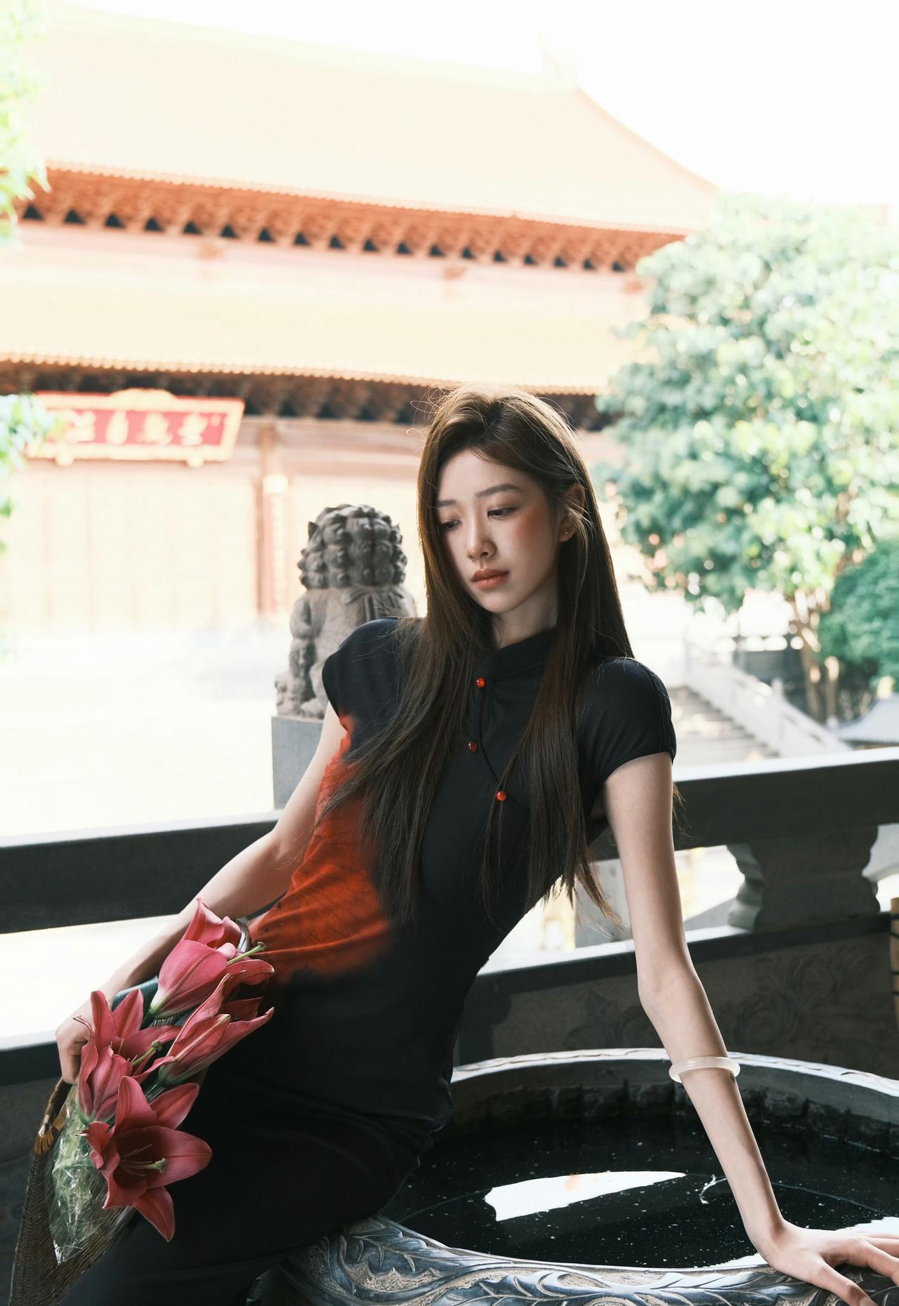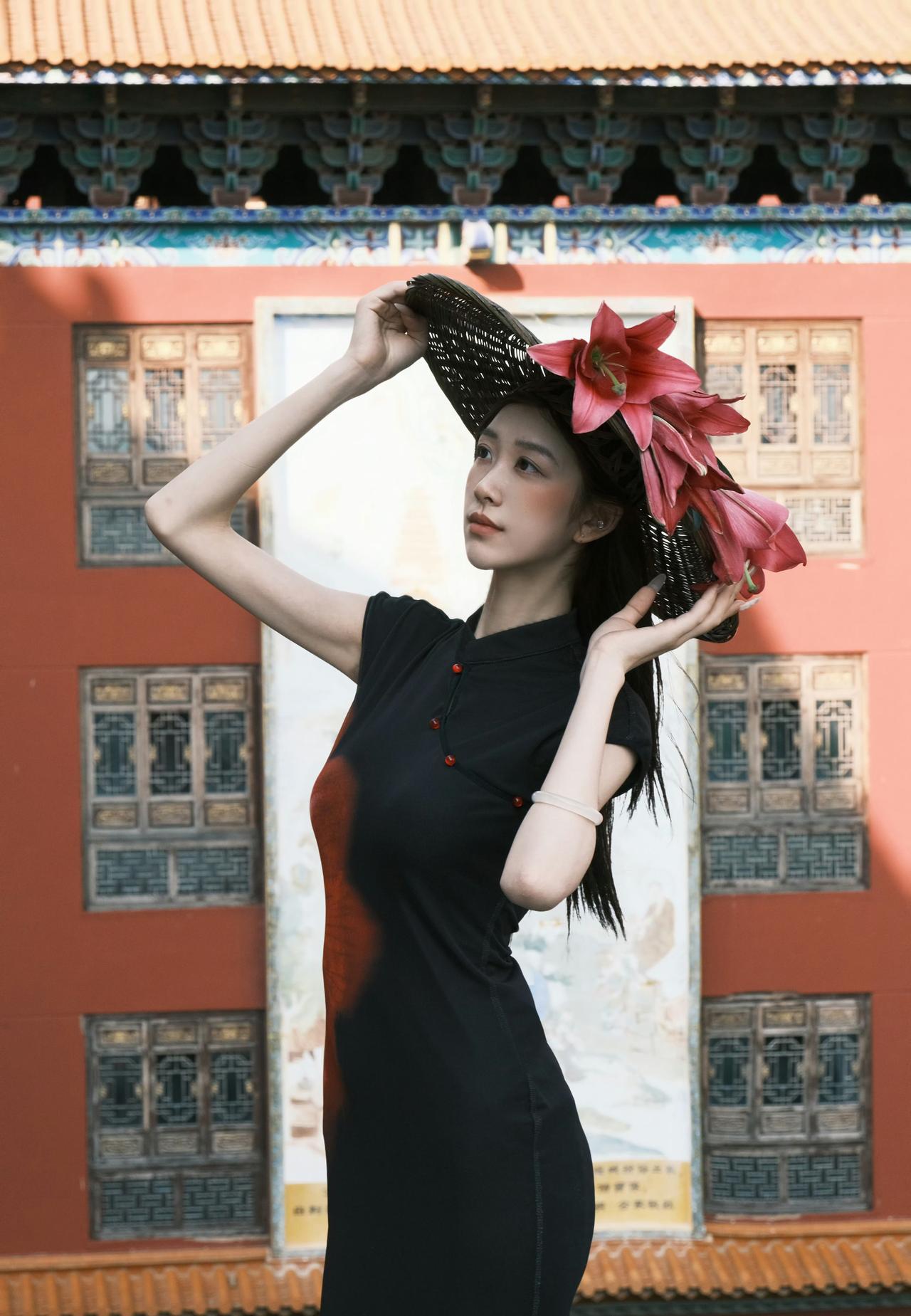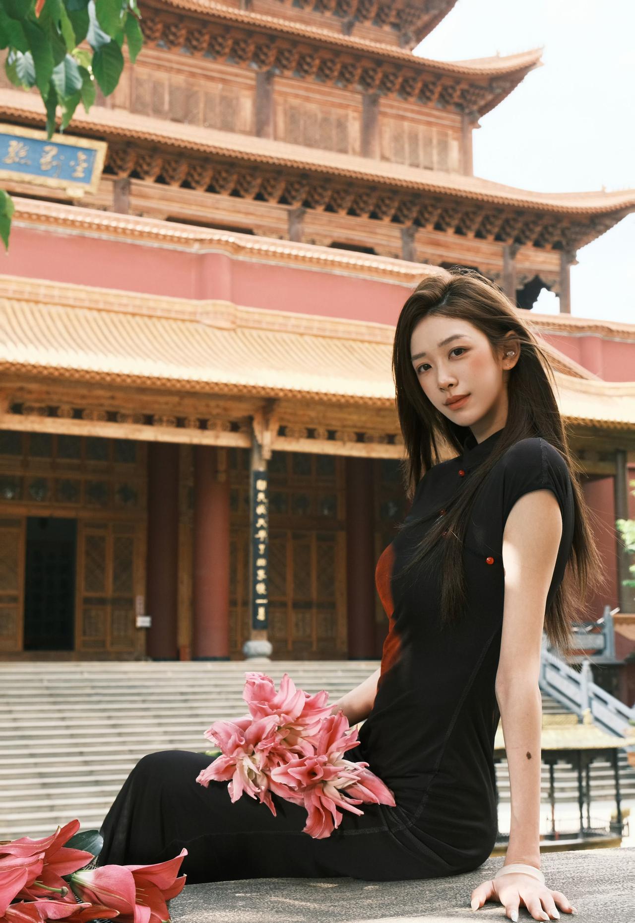 红墙黛瓦,光影斑驳。一袭墨色旗袍,携半捧嫣红,在古寺的飞檐下,赴一场东方美学的邀约。