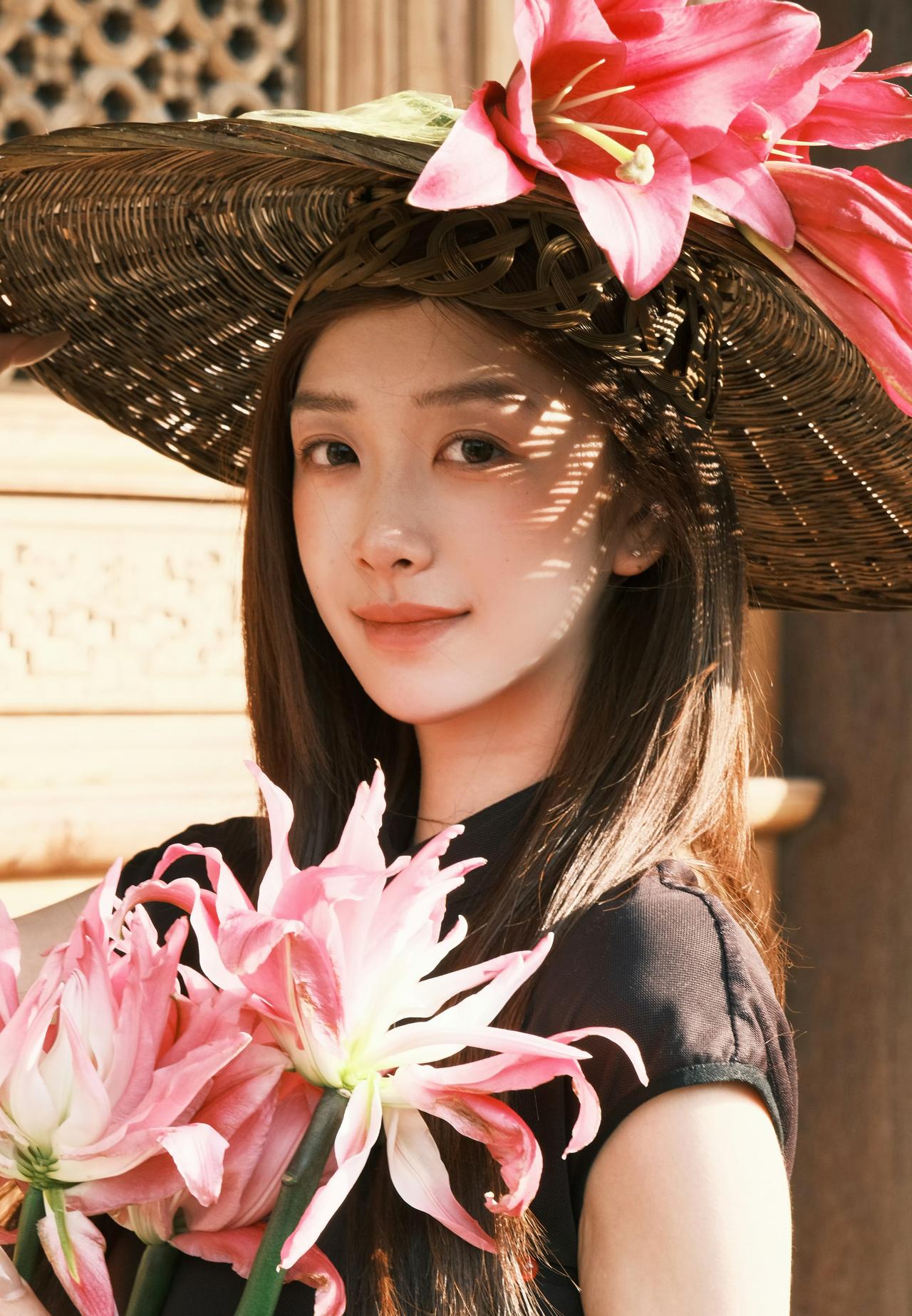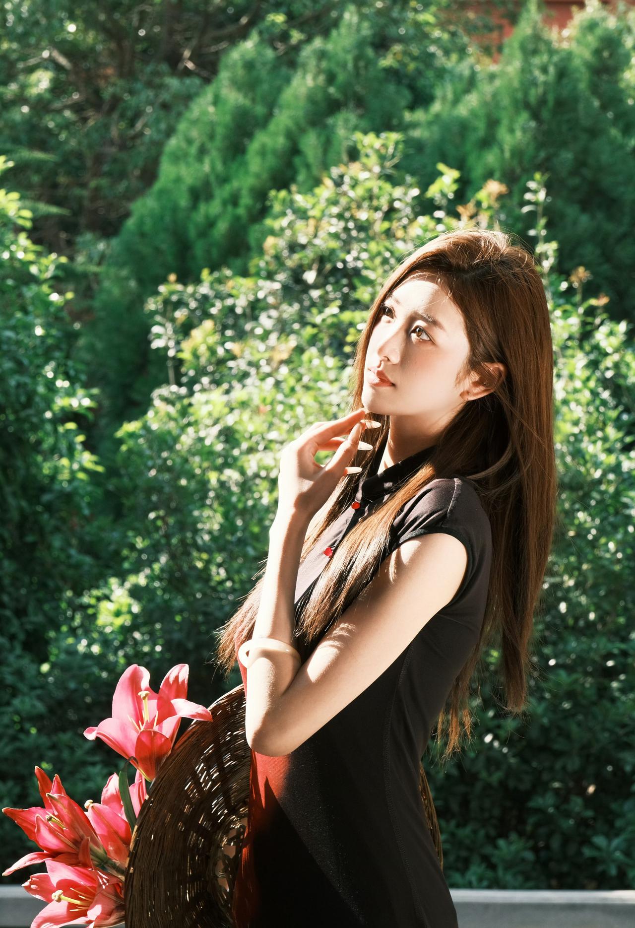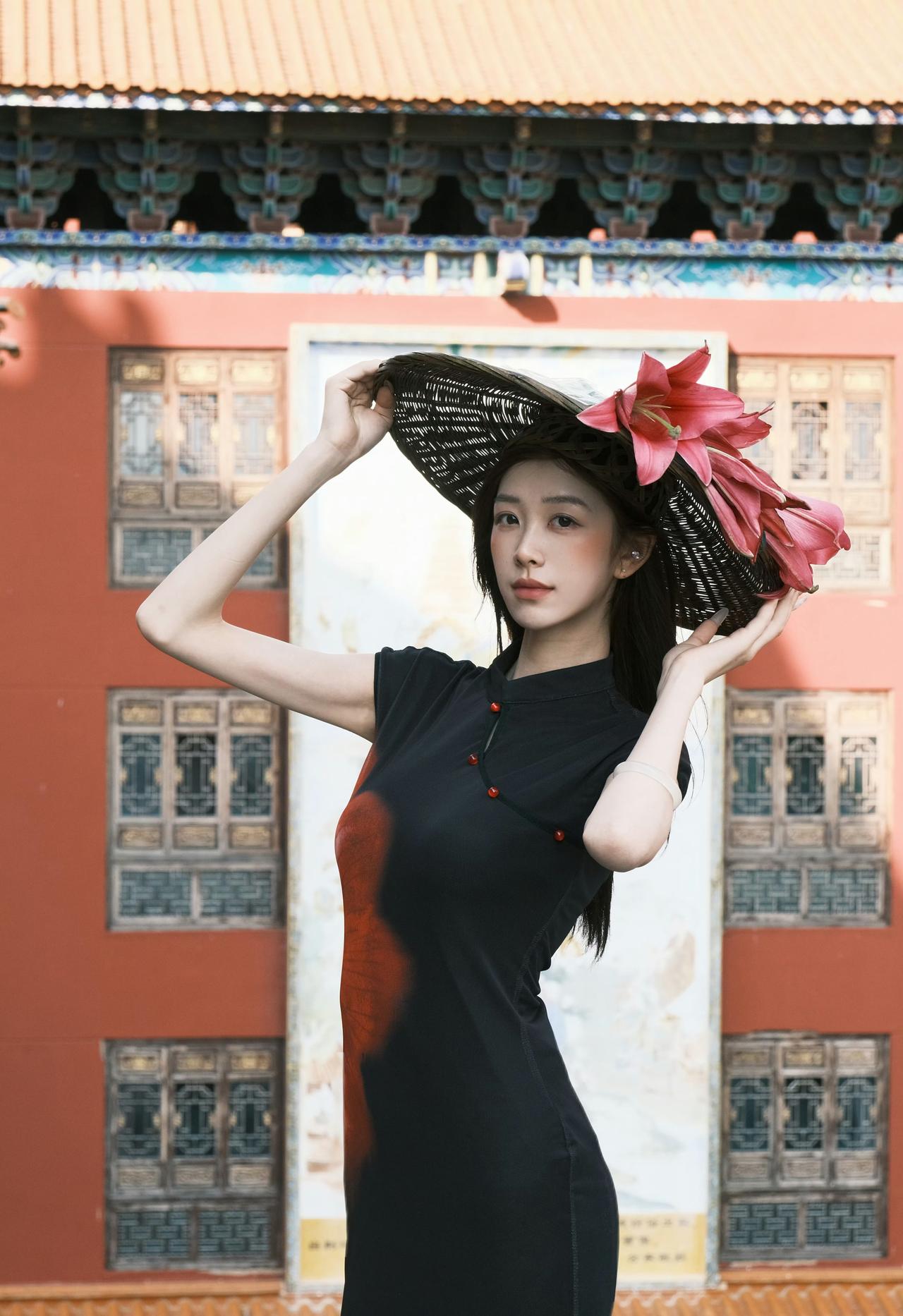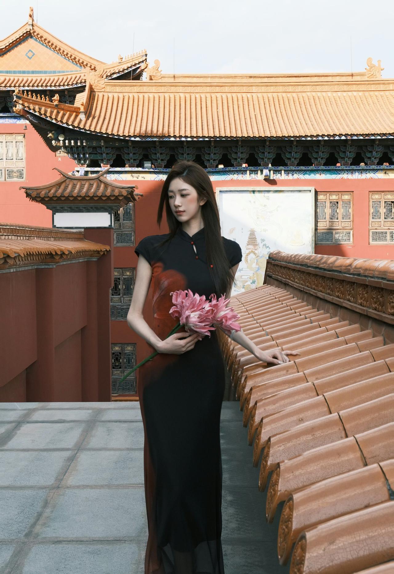 红墙黛瓦,光影斑驳。一袭墨色旗袍,携半捧嫣红,在古寺的飞檐下,赴一场东方美学的邀约。