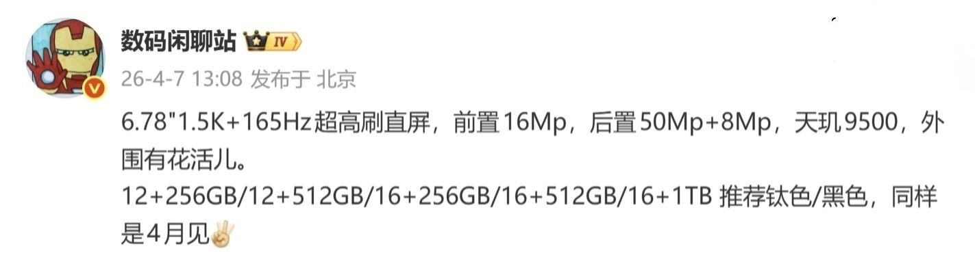 据博主 数码闲聊站 此前爆料,某厂 4 月新机将搭载 6.78 英寸 1.5K+165Hz 超高刷直屏,前置摄像头 1600 万像素,后置摄像头是 5000 万像素 +800 万像素,配备天玑 9500 芯片,外围“有花活”。结合来看,这款曝光新机预计为一加 Ace6 至尊版。