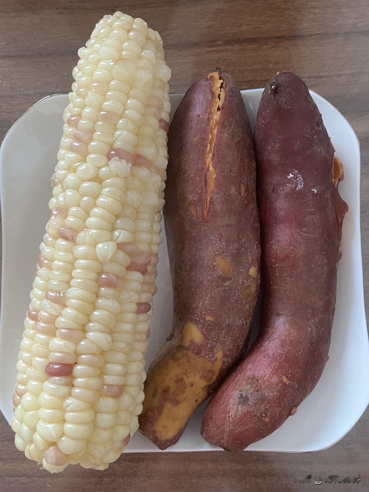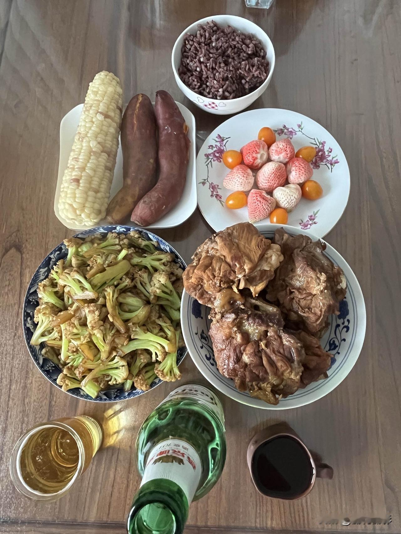 好友们晚上好!周末愉快,晚餐香香!今天的晚餐: 酱梅花骨 素炒菜花 红薯玉米 杂粮饭 果盘 今天早晨去批发市场买面条,顺便买了牛奶和玉米。今儿买的玉米是十块钱四根,后来又看到一家卖十块钱五根,我就又买了一份。 中午回来吃了午饭,我就把九根玉米给煮了。煮出来的玉米吃不了的我就冻起来,吃的时候热热就能吃了。 下午先生酱了梅花骨焖了杂粮饭,晚上我炒的菜花弄的果盘,一顿美味的晚餐就齐了。时间不早了,话不多说,开饭啦![大笑][大笑][大笑][大笑][大笑][大笑]