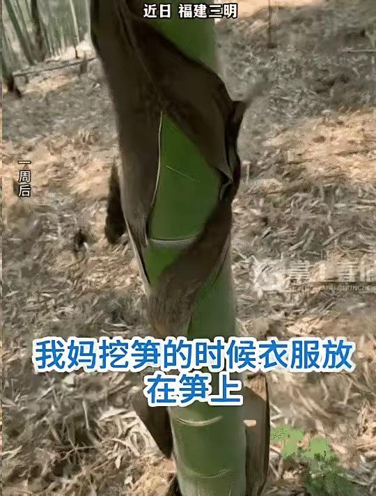 [月亮]万万没想到,福建,一阿姨在竹林挖笋,挖了一会有点热就把外套脱了,随手放在了地上,回家时就忘了,没过几天来找时却找不到了,不料,抬头一看,直接懵了,衣服竟然“穿”在了竹子身上。 阿姨当时站在竹丛里愣了半天,伸手摸了摸裹着外套的竹秆,布料被撑得紧绷,牢牢卡在竹节中间,根本扯不下来。她怎么也想不通,好好放在地上的衣服,怎么会跑到半空中,还像量身定做一样穿在了竹子上。 周围挖笋的乡亲们都围过来看稀奇,大家你一言我一语,都说在竹林里待了半辈子,从没见过这么邪门的事。有人说是不是竹林里有蹊跷,还有人打趣,说这竹子是看上阿姨的外套,自己拿来穿上了。 当地林业站的工作人员听说后,专门赶到这片竹林查看,一眼就看出了门道。这不是什么怪事,是春天毛竹进入疯长期,靠着惊人的生长力量,把地上的外套顶起来、裹在了身上。 清明前后的福建雨水足、气温暖,正是毛竹拔节的黄金期。这个阶段的毛竹,一天能往上长半米到一米,每一节的细胞都在同时分裂,生长速度在植物里算得上是顶尖水平。 阿姨丢外套的地方,刚好有一根刚破土的嫩笋,外套轻飘飘盖在了笋尖上。嫩笋的穿透力极强,就算是压着布料,也能不停向上蹿,没几天就长成了挺拔的小竹子。 竹子不光往上长,竹秆还会慢慢增粗,原本松垮搭在笋上的外套,被不断变粗的竹节撑满,紧紧裹在竹身上。从地面被顶到半空,看着就像竹子自己主动穿上了这件外套。 很多人觉得竹子长得快是天生的,其实不然,毛竹在破土前,会在地下长好几年的竹鞭。竹鞭密密麻麻铺开,把土壤里的养分全都攒起来,就为了春天这一波爆发式生长。 竹鞭就像竹子的“营养仓库”,能把整片竹林的养分,集中输送给正在长个的春笋。这也是春笋能顶着障碍物疯长,连布料都能轻松顶起来、裹住的根本原因。 工作人员现场给乡亲们演示,嫩竹的生长力量大到能顶动小石块,更别说轻薄的外套了。只要物体压在笋尖上,春笋就会顶着它向上长,这是竹子最本能的生长状态。 这件事被拍成视频发到网上后,很快就火了,全国各地的网友都来看热闹。不少有竹林的网友留言,说自己也遇到过类似的事,只是没这次这么形象,刚好把衣服穿得整整齐齐。 有植物学爱好者专门做了科普,竹子属于禾本科,和水稻是近亲,它的生长结构和树木完全不同。每一节都有独立的生长组织,多节同时发力,生长速度自然远超普通树木。 普通树木只靠顶端生长,一年也长不了多少,竹子却能在短短十几天里,从不起眼的笋芽,长成好几米高的竹秆。这样的生长速度,造就了外套穿在竹上的奇景。 阿姨后来也没再强行扯这件外套,就把它留在了竹秆上,当成了竹林里的一处小景致。路过的挖笋人都会多看两眼,也算是用一件外套,见识到了大自然最神奇的力量。 不少网友看完都感慨,大自然的奇妙永远超出想象,一件被遗忘的外套,都能遇上这么巧的事,也让大家对身边常见的竹子,多了一份全新的认识。 各位读者你们怎么看?欢迎在评论区讨论。 信源:国家林业和草原局毛竹生长科普资料、福建当地林业站现场勘查说明