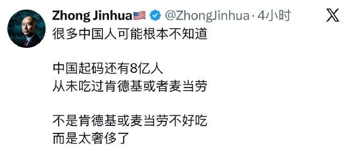 还有8亿中国人觉得吃麦当劳或者肯德基很奢侈? 难怪不得为啥有些人总在攻击ZWW哦。 因为他说了就算是普通农民工的午餐都比美国中产好,贫困家庭都能吃上三菜一汤。 所以这些人就认定张是在撒谎…… 但问题是张是亲自去看过扶贫工作的,去过中国偏远山村调查过的。 而这些张口就来的人,十多年前就跑到美国去了,或者在一线城市里呆着连乡村都不愿意去一下。 友友们来说一下,让我看看有多少人觉得吃麦当劳肯德基是奢侈的。 现在移动网络覆盖所有偏远山村,所以不要拿这个来说事,而且了解胡焕庸线的都知道中国人口分布。 来说说。 这些跑到美国去傻子以为现在中国大陆还在上世纪8、90年代呢。 点右上角关注我,我们一起去看这个魔幻的世界