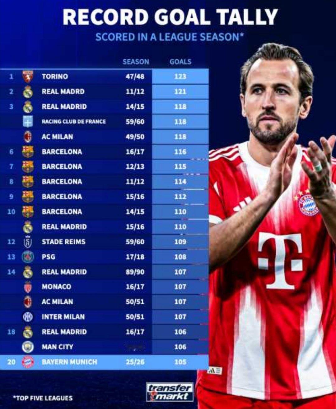 五大联赛单赛季进球纪录,拜仁这季有望打破