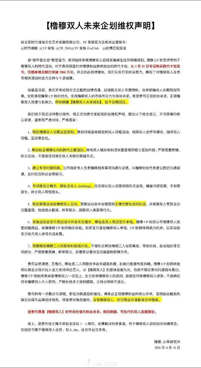 橹穆cp粉维权声明橹穆CP粉发布维权声明,称已为双人消费超3500万元,要求公司制定长期运营规划、保障双人同框互动等七项诉求,否则将引发舆论反噬。 橹穆粉丝晒单