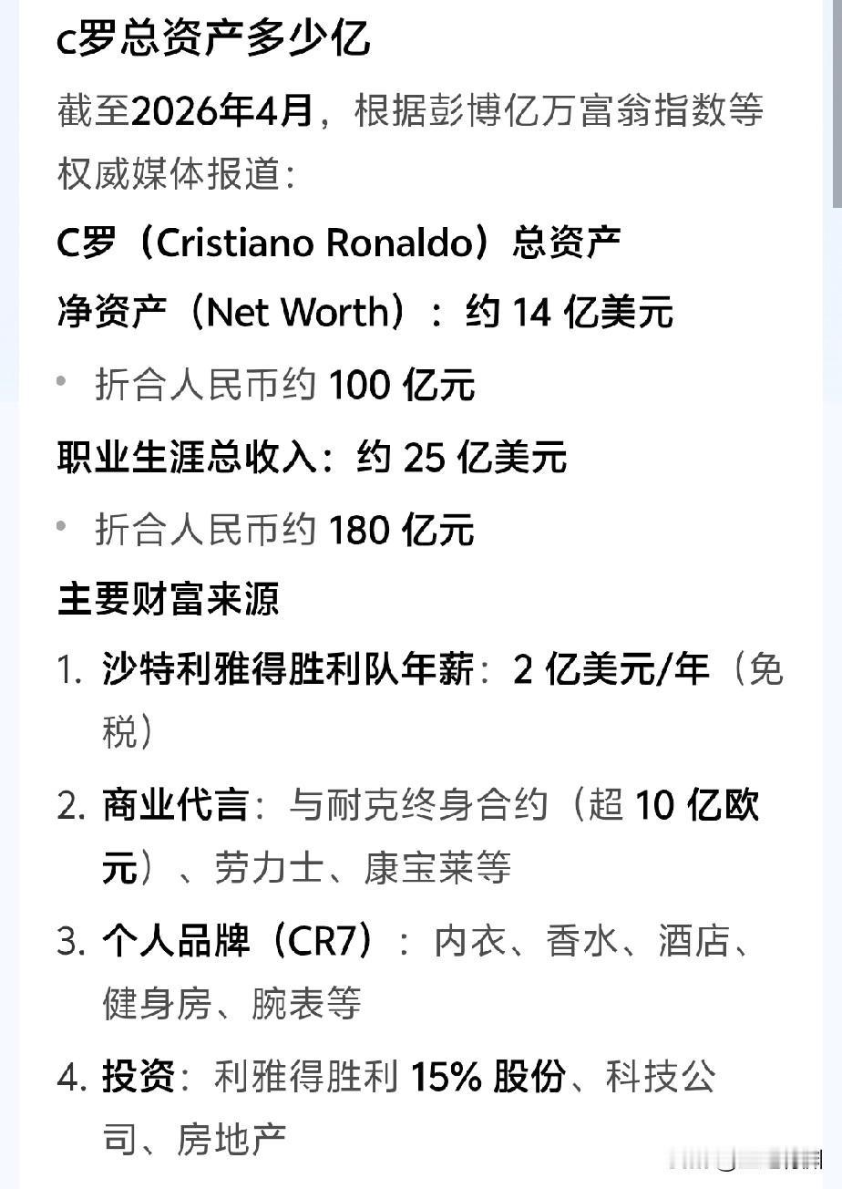 40岁的C罗不容易,运动的巅峰这个年龄的人基本都结束了。但他还在努力创造奇迹!很多人羡慕他职业生涯挣了太多的钱,这是事实。但他的自律和投资理财意识,也是很多职业运动员不具备的。 C罗确实是挣钱容易,开个玩笑,他睡一觉,就能把自己卡里的钱多出很多普通人一辈子挣的钱。因为他的收入渠道太多了,利雅得胜利的合同,基础年薪就2亿美金还是税后,比赛每进一球,奖励8万,助攻一个,4万。耐克一份终身合同就超10亿美金,还有其他各种代言,再加上自己的CR7品牌,从内裤卖到酒店,估值8.5亿欧,还有投资各种房产。 钱对于C罗来说已经花不完,也许不是最重要的,自律和对足球的态度才是他获得全球球迷认可的地方。[赞][比心]