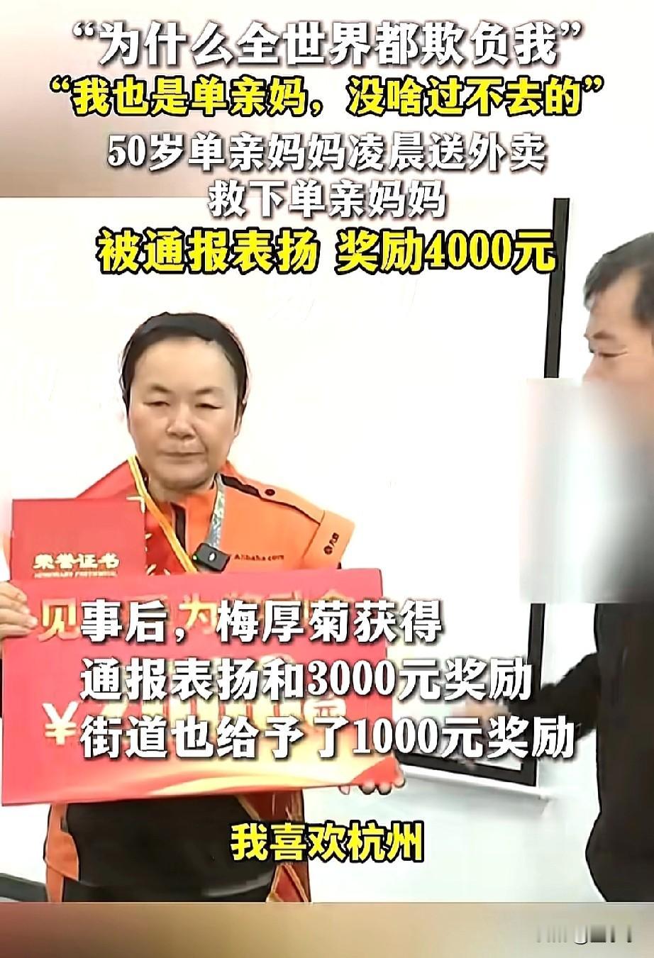 只有穷苦人,理解穷苦人! 浙江杭州,一位50岁的单亲妈妈凌晨送外卖,救下了另一位单亲妈妈,用自己的经历来劝解着。 梅大姐也是可怜人,一个人拉扯着3个孩子,十年前因为前夫因为赌博欠下巨款,两人离婚后,梅大姐一个人带着三个孩子在杭州生活。 没有工作的她生活特别的困难,也有想要轻生的想法,好在社区的帮助,让她又燃起了希望,因为要照顾孩子,跑外卖是最佳的首选。 梅大姐就开启了外卖之路,直到在4月10日凌晨,梅大姐也是照常在送单,在路上遇到了一位女子想要轻生。 经询问后得知,女子也是单亲妈妈,离婚后前夫不给孩子生活费,又被要好的朋友背叛,一下子积压的委屈涌了上来。 梅大姐因为知道单亲妈妈的不易,用拿自己的经历来劝慰为着。 可能,只有穷苦人,才能理解穷苦人的心酸和无奈吧。 人生啊,有多少如意? 又有多少不如意? 看淡了,努力了,相信一切都会好起来的。 尤其,是梅大姐自己淋过的雨,还想着努力给别人打伞,这种份善良和勇气更让人动容!