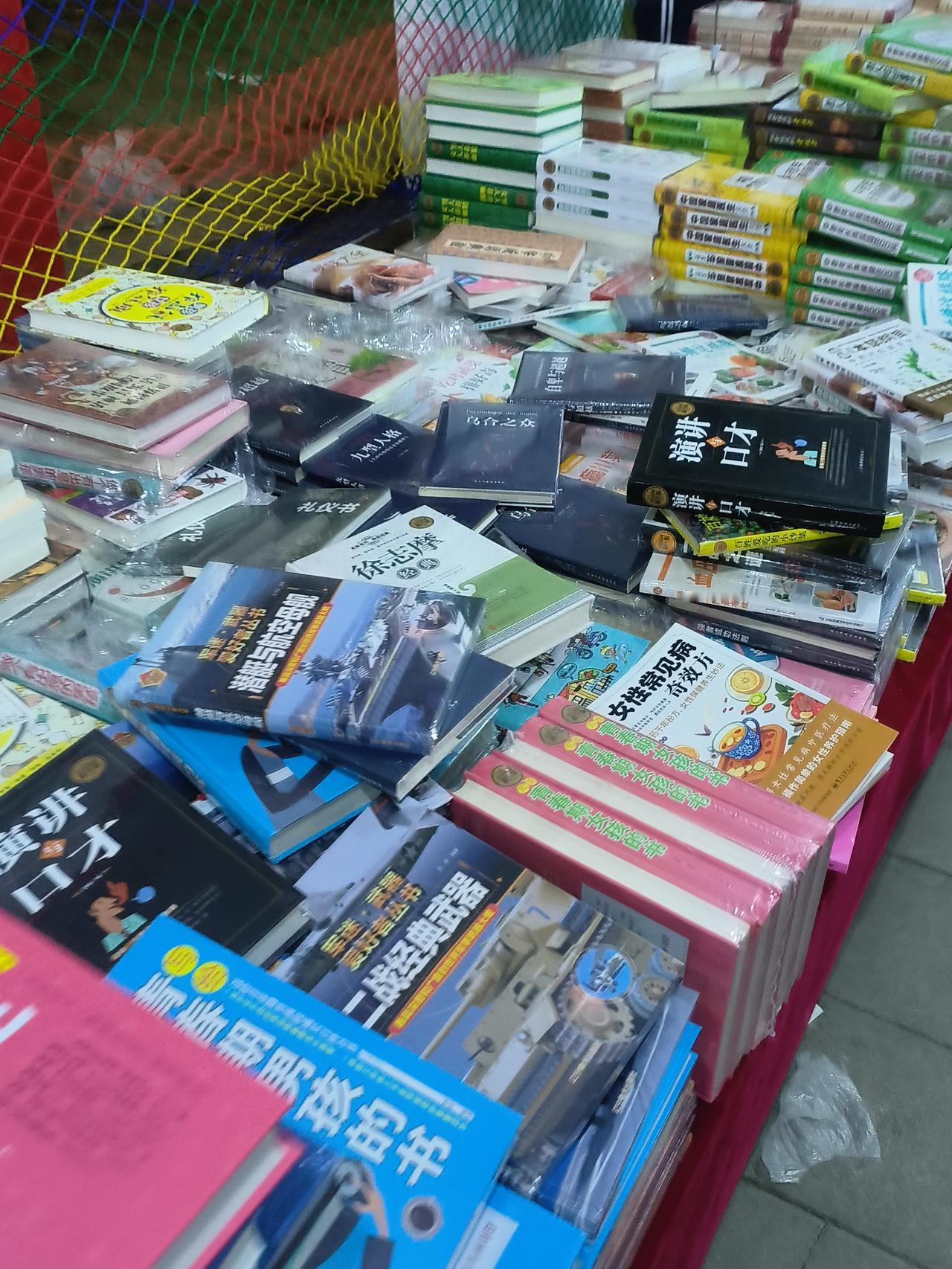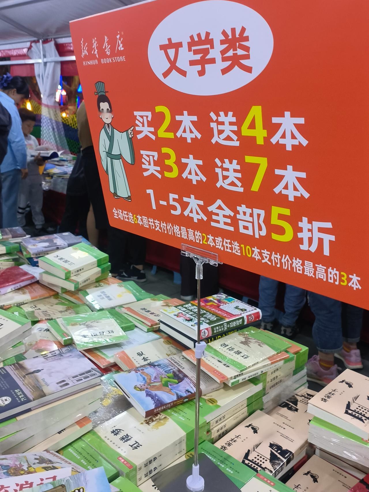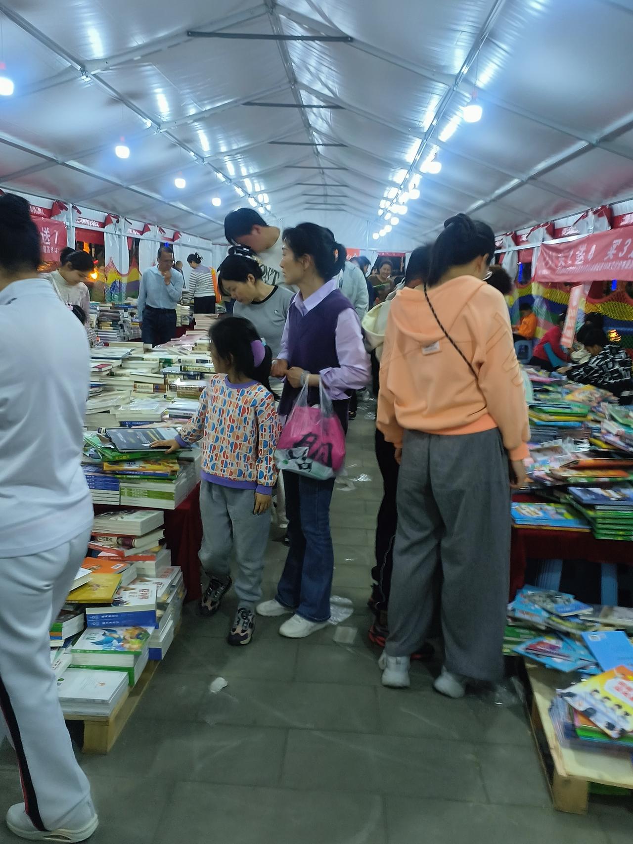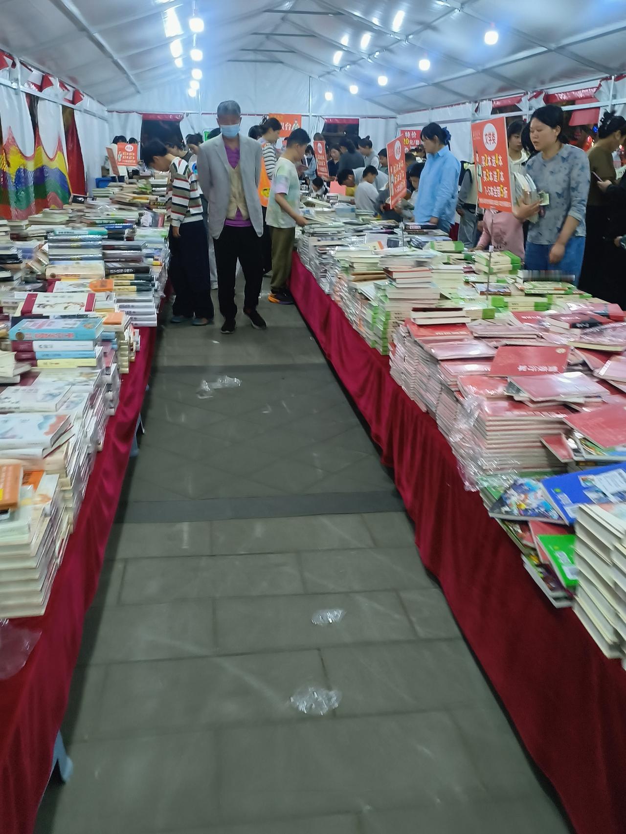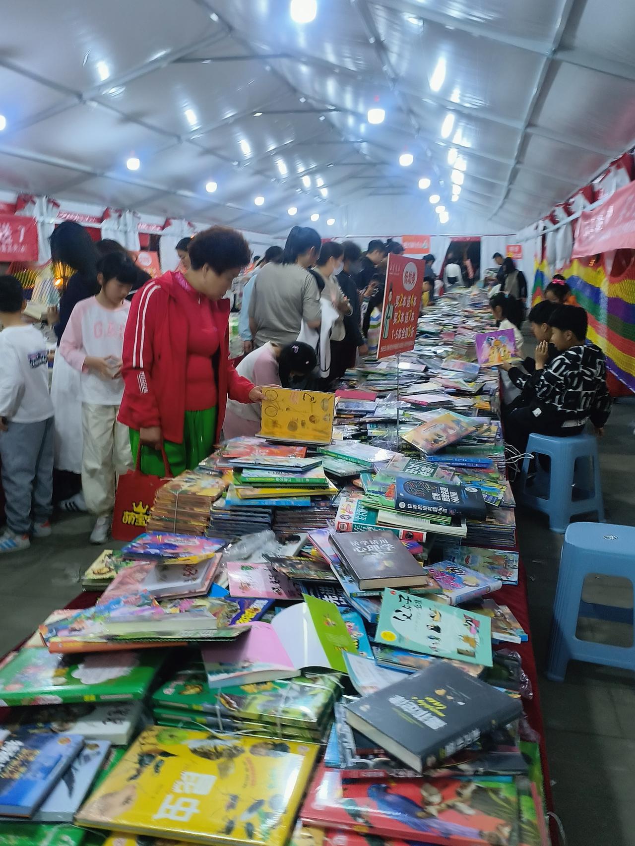 今天是星期六,新华书店在洞山公园内办书展,许多家长带孩子来看书购书,书的品种繁多