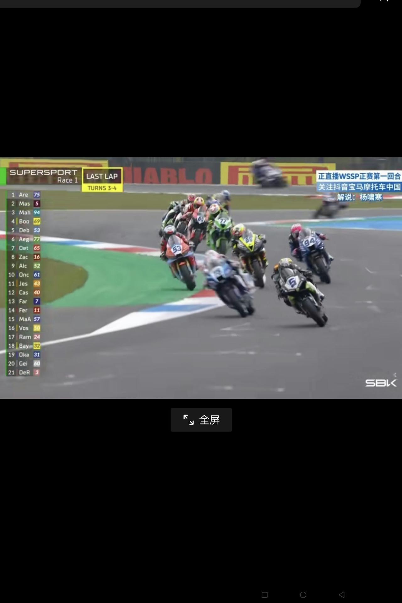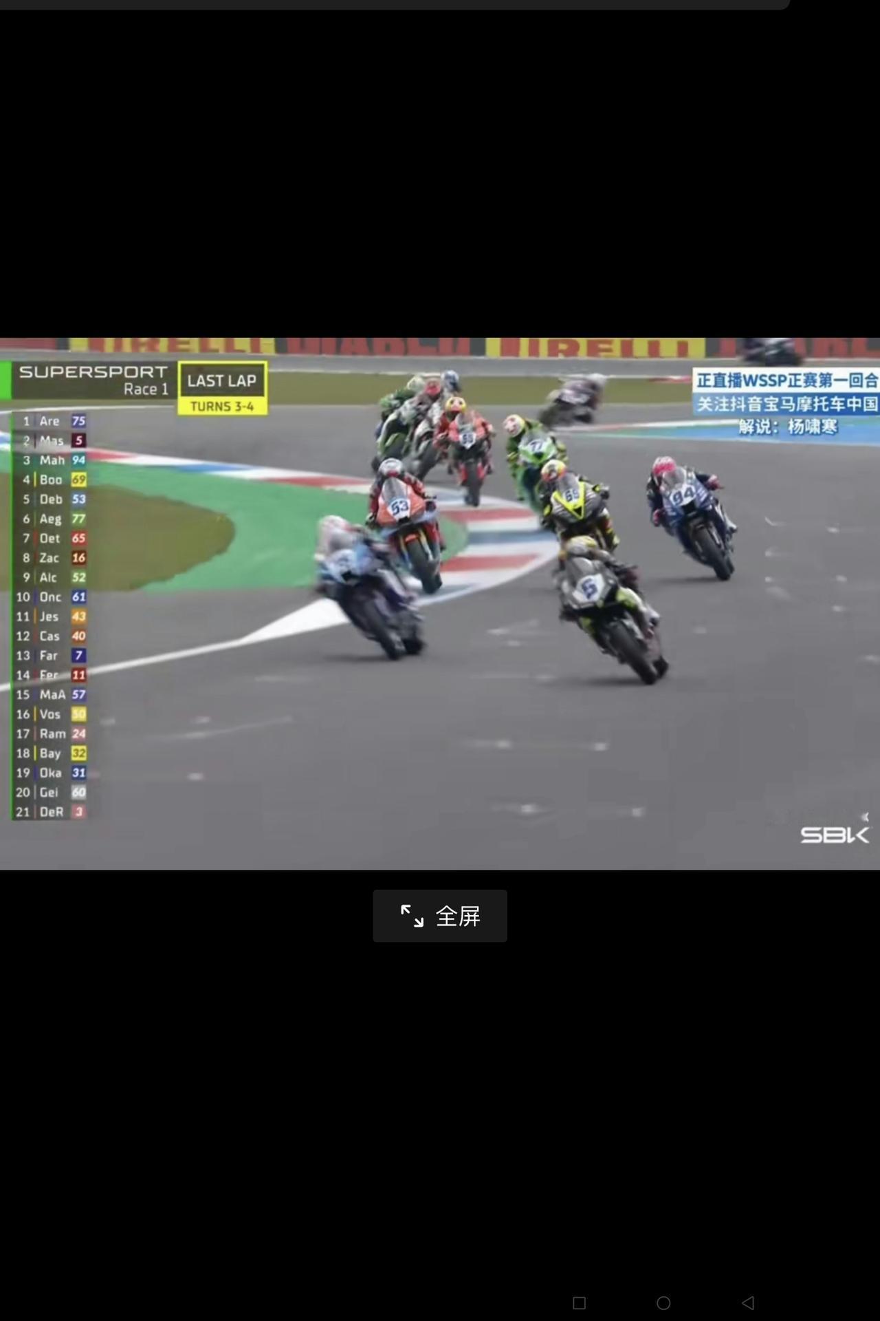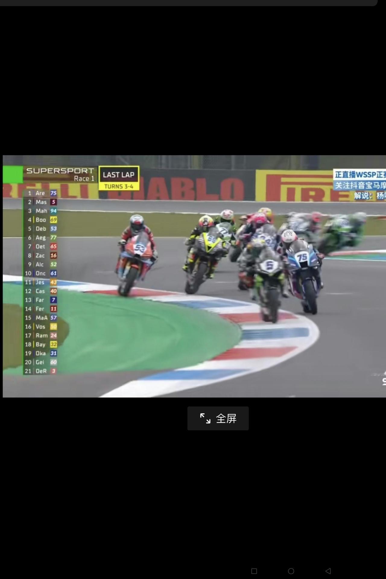 好可惜,“张雪机车”荷兰站正赛获第三名被罚成为第四名! 今天(4月18日)晚上8时18分,“张雪机车”820RR-RB由法国车手瓦伦丁再次驾驶53号机车,参加“世摩赛”荷兰站正赛第一个回合获得第三名,但由于即将冲线时拐弯压了绿道被处罚(见下图),获得了第四名。 不能不说,这是一次好可惜的事情!但是,车手已经非常努力了,也说明“张雪机车”技术性能仍是最棒的,这也没有什么遗憾的! 相信明天(4月19日)正赛的第二个回合,“张雪机车”一定会取得更好的成绩!