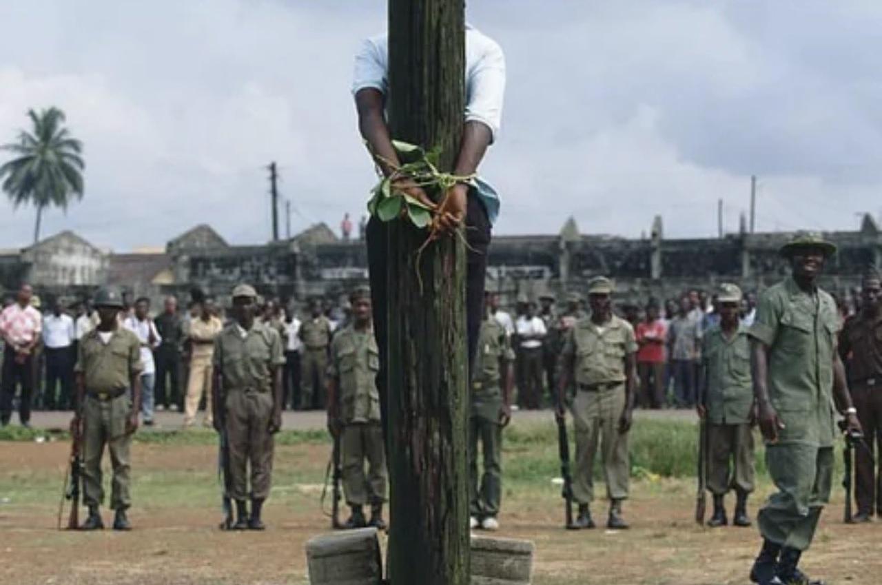 一张摄于 1992 年 11 月利比里亚蒙罗维亚的照片。照片中,一名年轻的利比里亚武装部队(AFL)士兵正被藤蔓捆绑在一根电线杆上,即将面临行刑队的公开处决。 这名士兵因谋杀一名他怀疑是反叛分子的平民以及实施抢劫而被定罪;此次处决是军方领导层在动荡的第一次利比里亚内战期间,为整肃 AFL 军纪而采取的措施之一。 在 1989 年至 1997 年的这场冲突中,各派别普遍犯下暴行,导致逾 20 万人丧生、更多人流离失所;像这样公开处决的手段,正是当时被用作“以儆效尤”的典型案例。