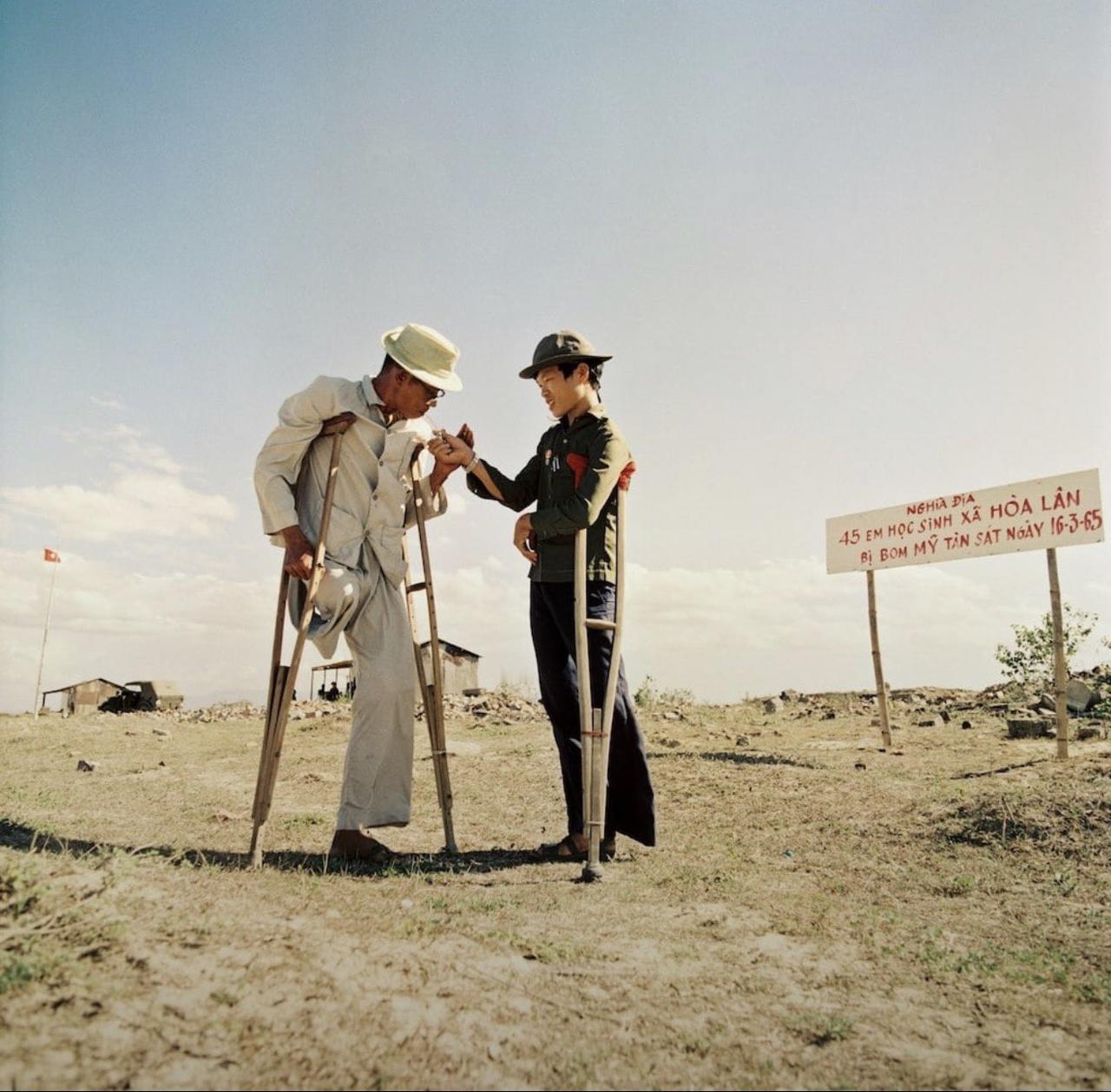 一名年轻的北越士兵在墓地为一位老人点燃一支烟。两人都失去了一条腿。他们旁边的牌子上写着:“1965年3月16日,45名学生被美军炸弹屠杀,此地安葬于此。” 河内,1970年