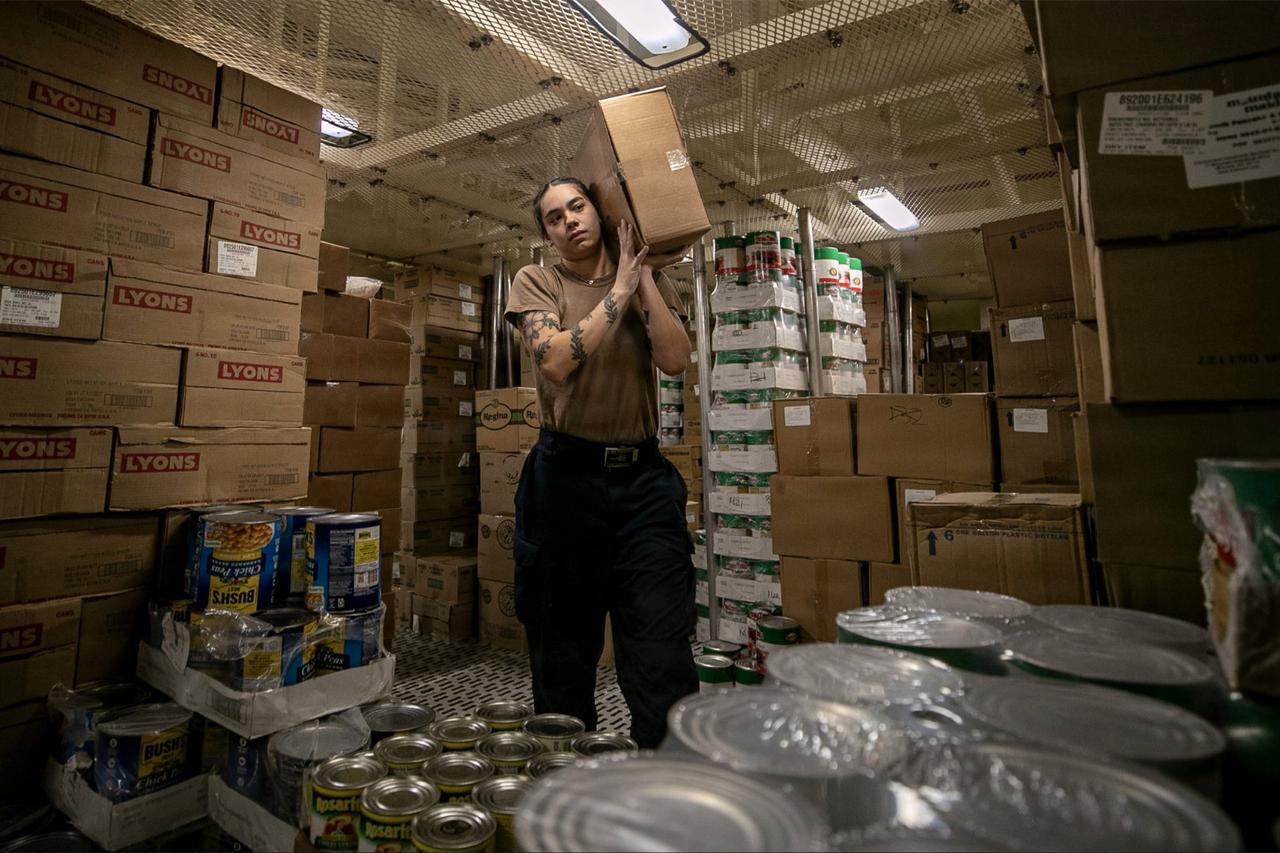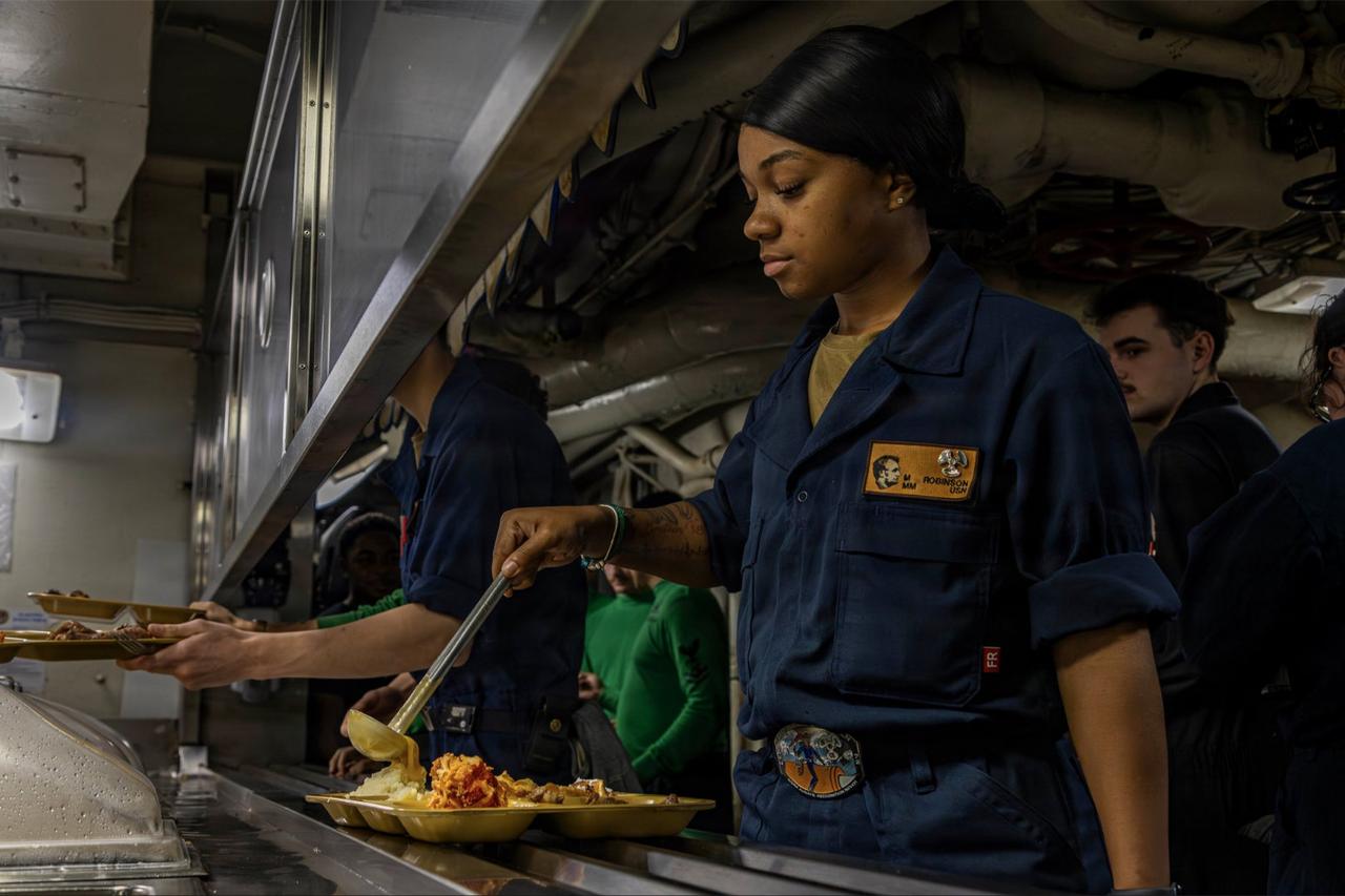 美国海军自证,林肯号航母和的黎波里号两栖攻击舰,都没有出现食物紧缺。 而且还放出了四张厨房的照片。 照片里的食物,看着还是挺丰盛的。但就是出境的这几位“演员”,太不专业了。看着这么丰盛的食物,怎么能够一直板着脸呢? 那不得脸上洋溢着笑容吗?