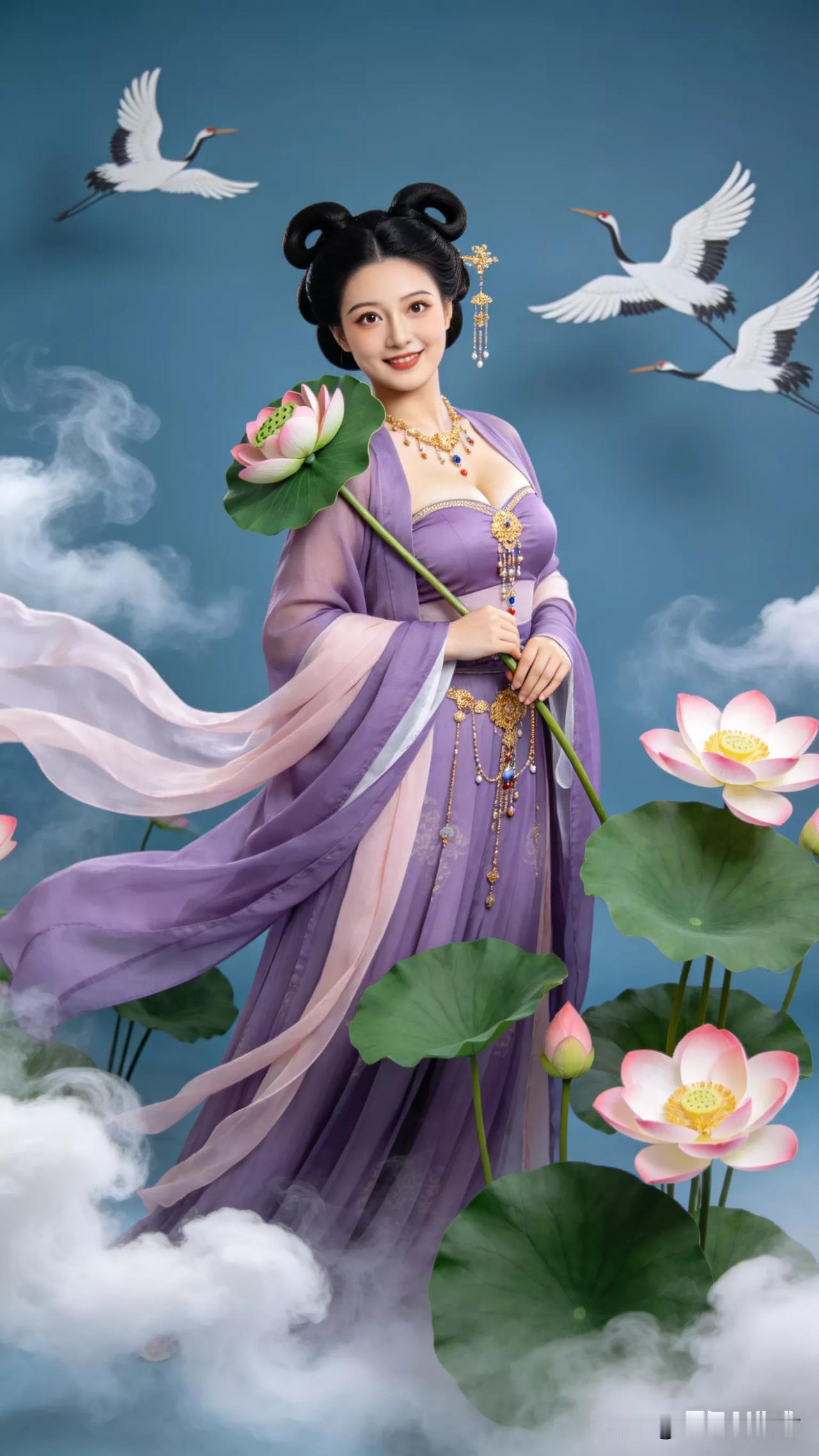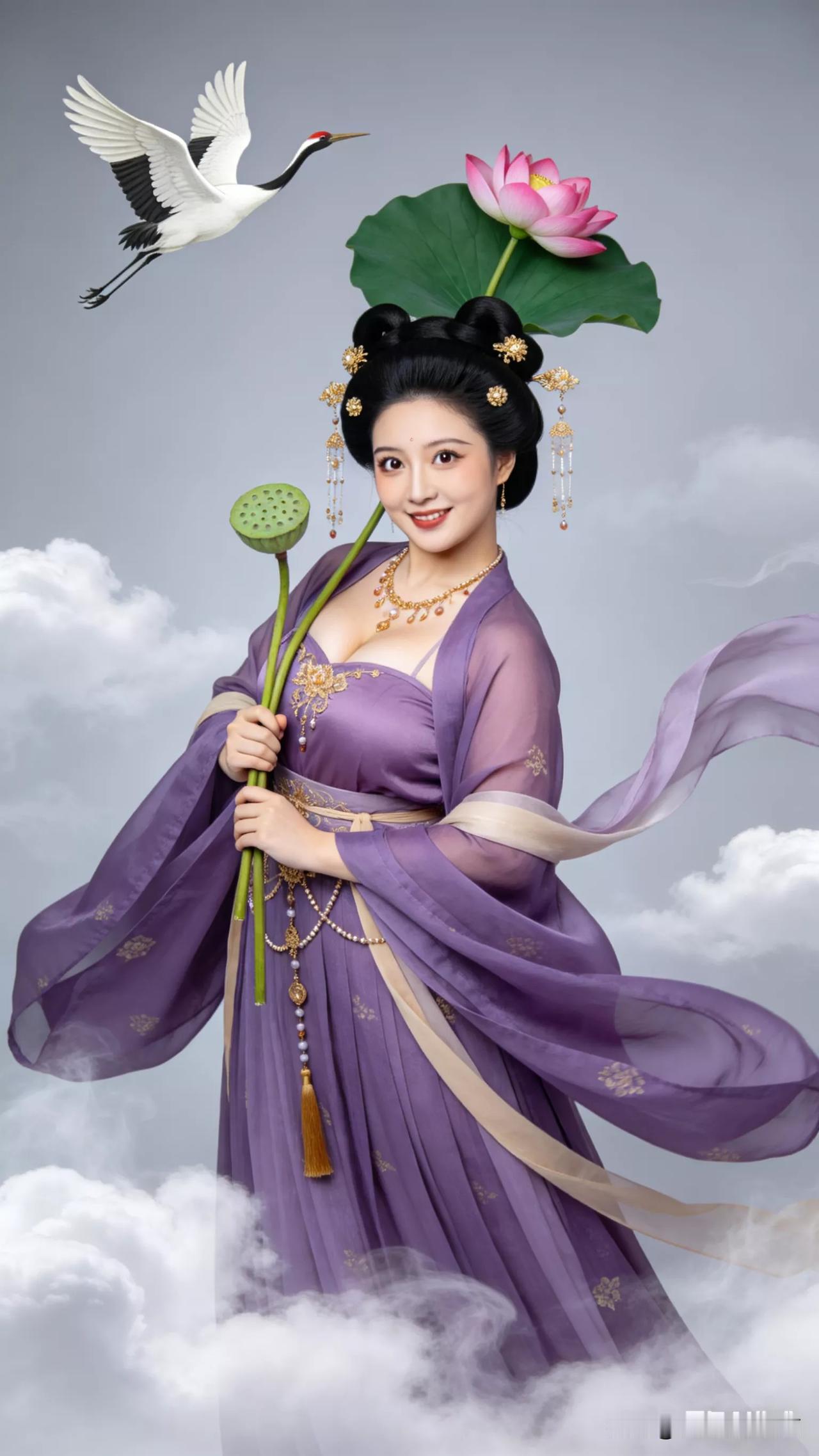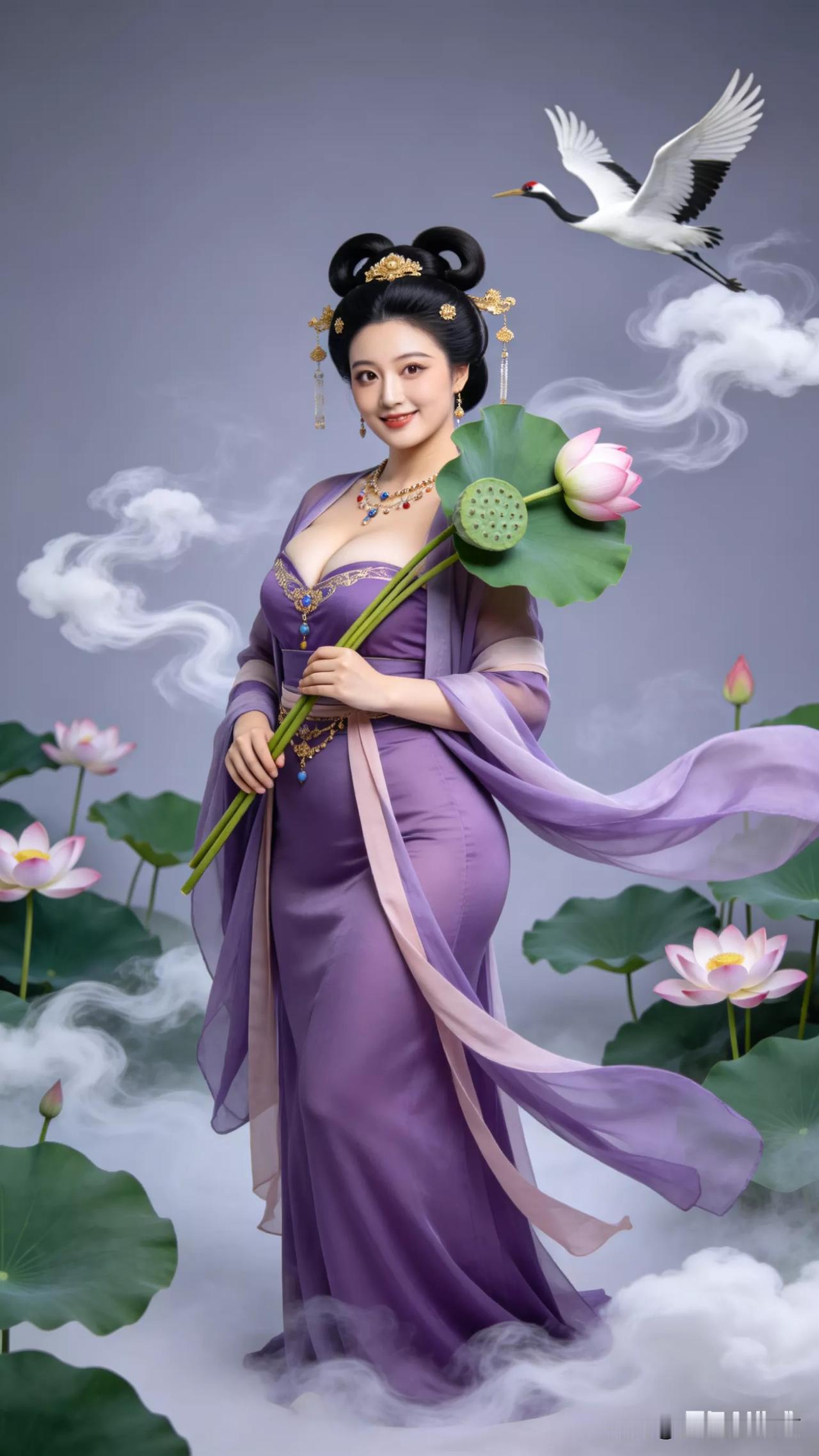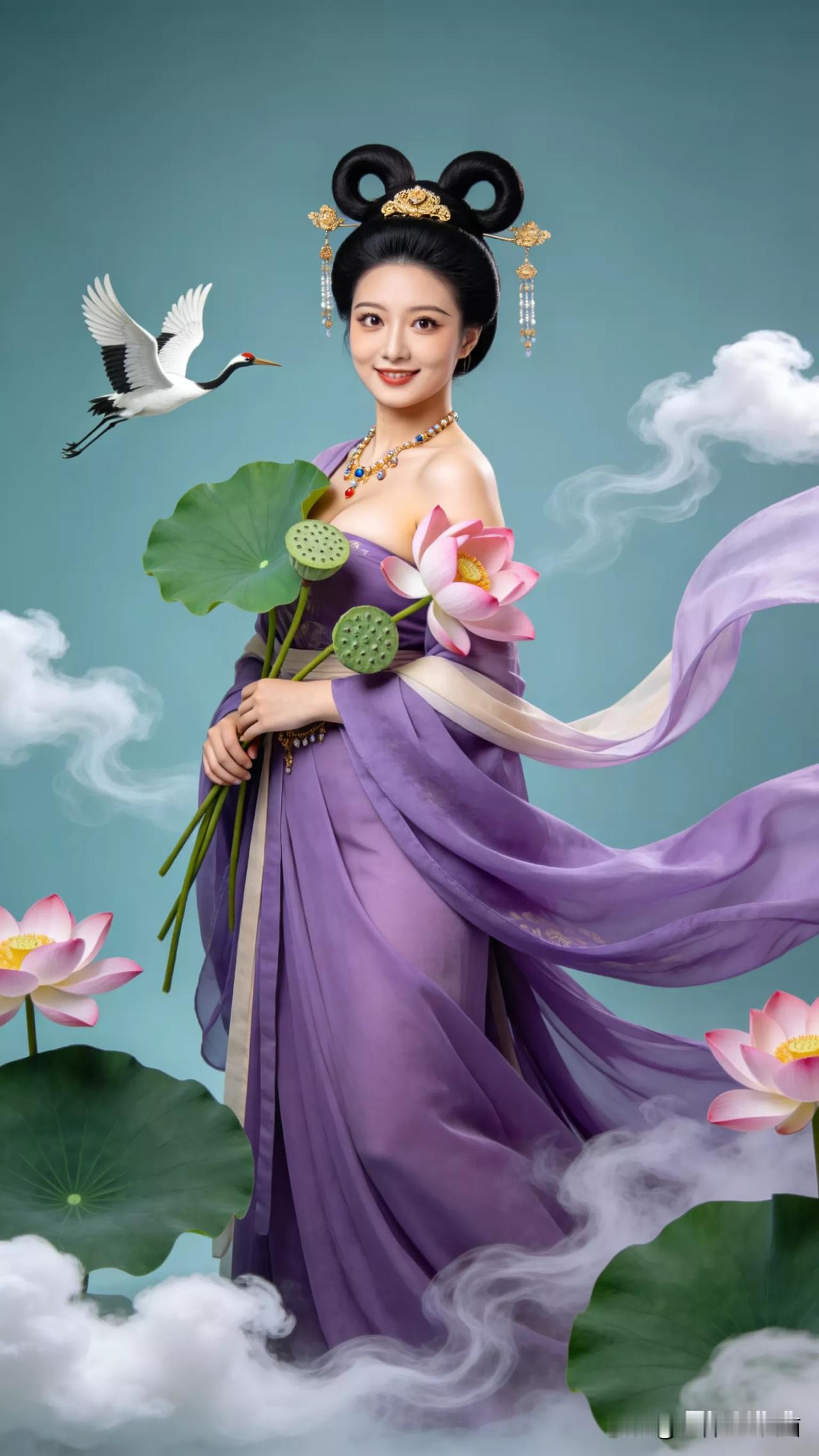 仙子手持莲花,鹤舞云间。张立启原创书画AI作品古仕女发髻服饰集锦首发第702期ai中式工笔 AI绢衣工笔画 AI牡丹仕女图 AI工笔仕女图 ai画工笔 ai唐韵仕女照 AI中式写意照 ai花鸟仕女图 古风仙女大片 张立启原创书画AI作品首发 张立启原创书画 汉服纱衣古仕女