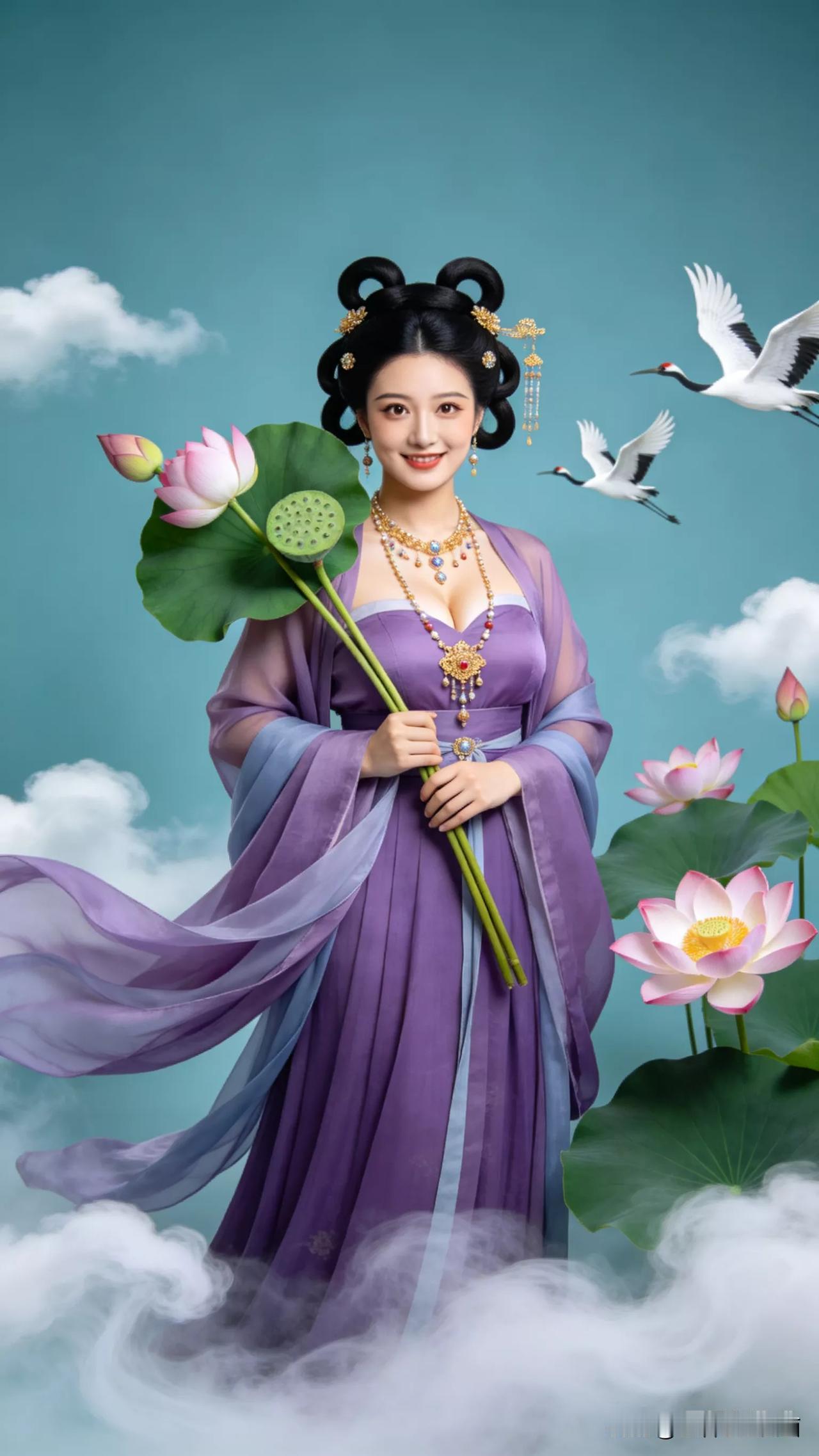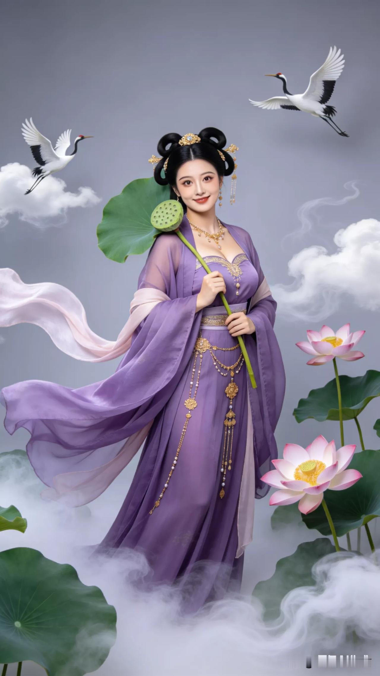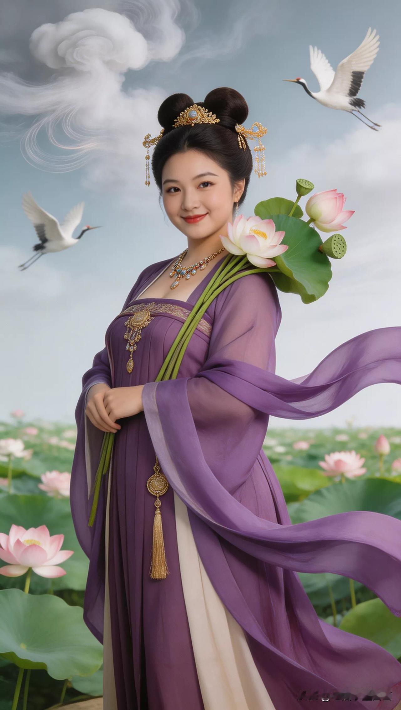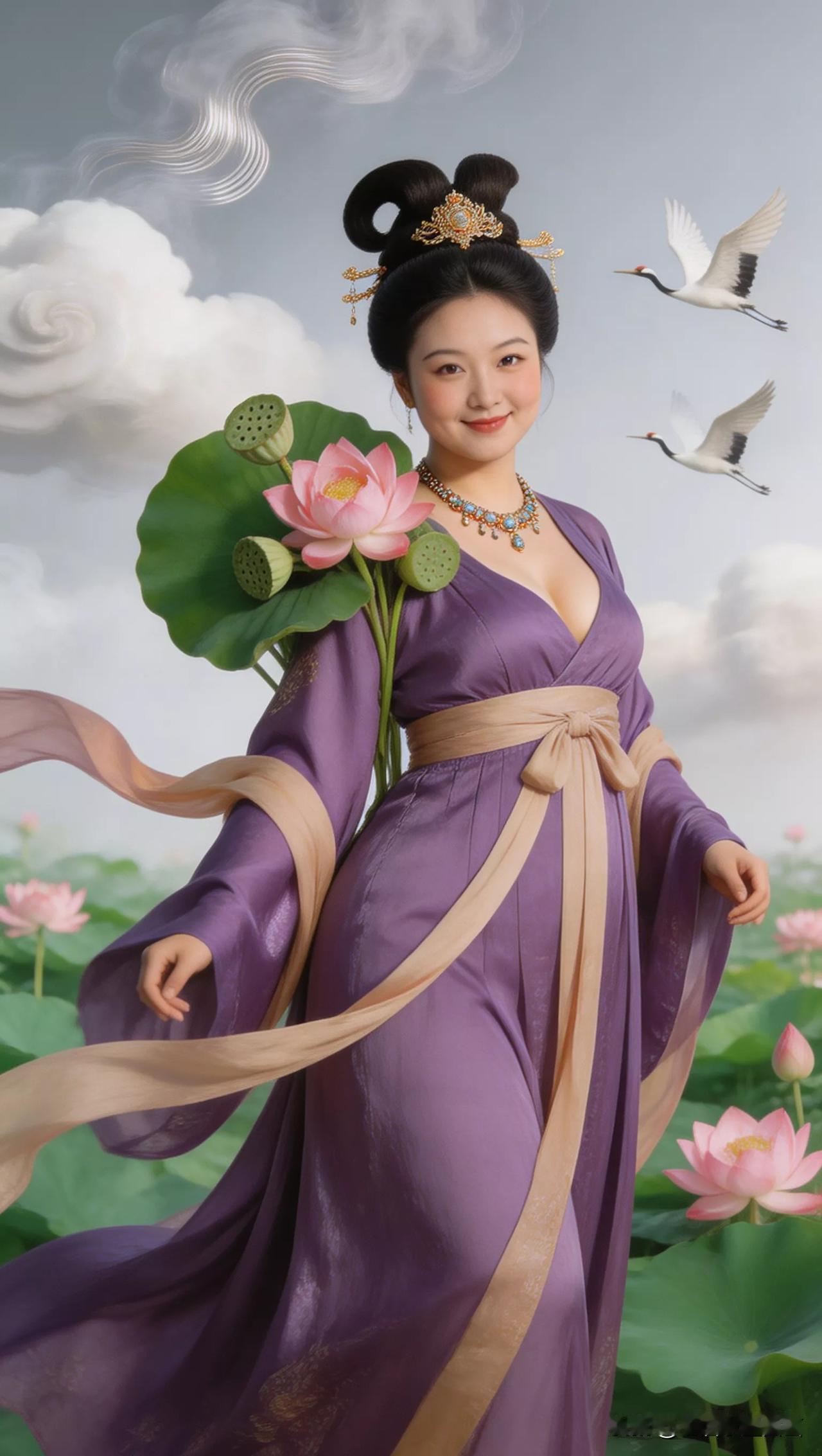 仙子手持莲花,鹤舞云间。张立启原创书画AI作品古仕女发髻服饰集锦首发第702期ai中式工笔 AI绢衣工笔画 AI牡丹仕女图 AI工笔仕女图 ai画工笔 ai唐韵仕女照 AI中式写意照 ai花鸟仕女图 古风仙女大片 张立启原创书画AI作品首发 张立启原创书画 汉服纱衣古仕女