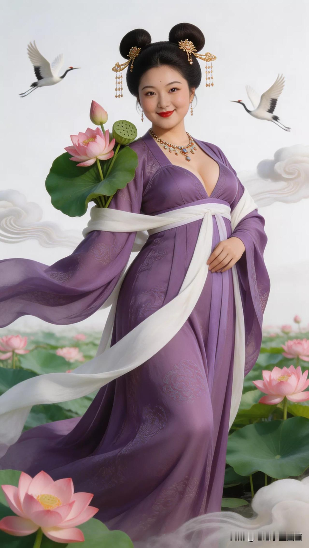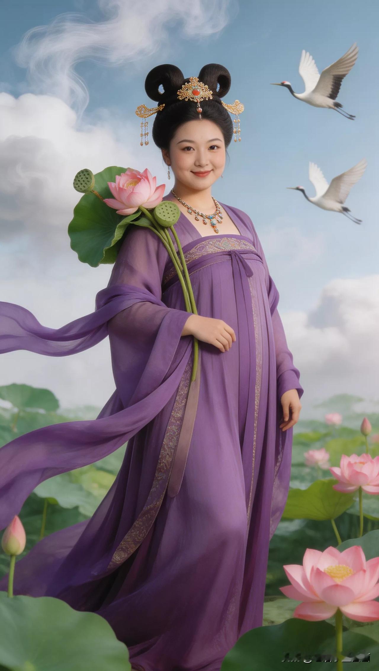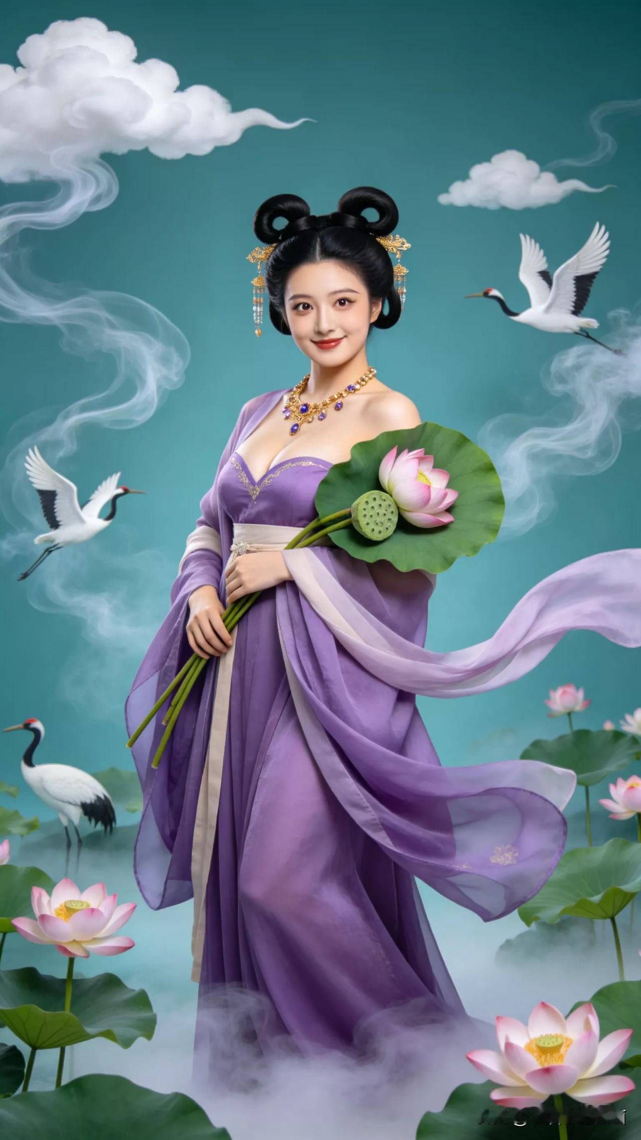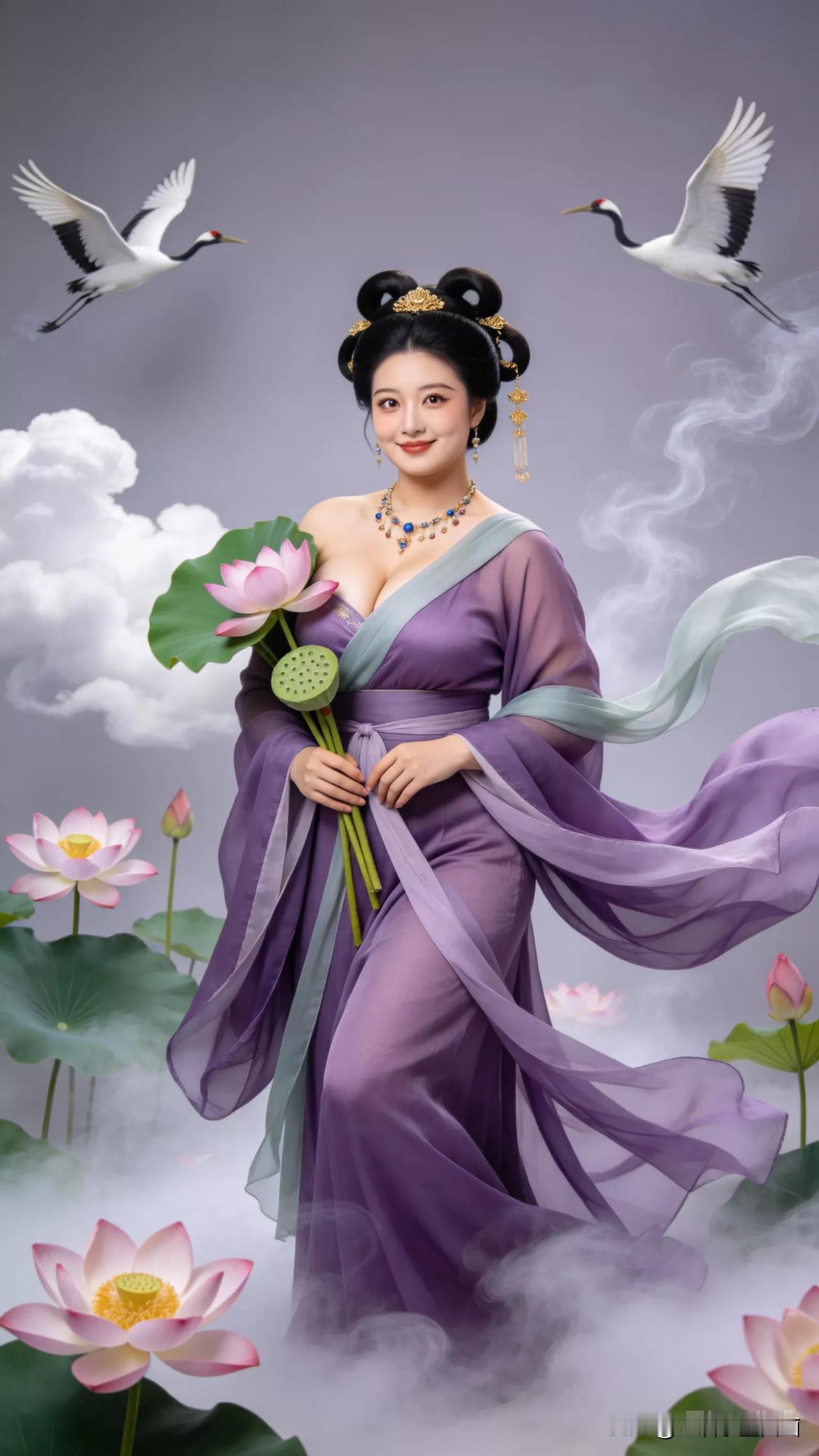 仙子手持莲花,鹤舞云间。张立启原创书画AI作品古仕女发髻服饰集锦首发第702期ai中式工笔 AI绢衣工笔画 AI牡丹仕女图 AI工笔仕女图 ai画工笔 ai唐韵仕女照 AI中式写意照 ai花鸟仕女图 古风仙女大片 张立启原创书画AI作品首发 张立启原创书画 汉服纱衣古仕女