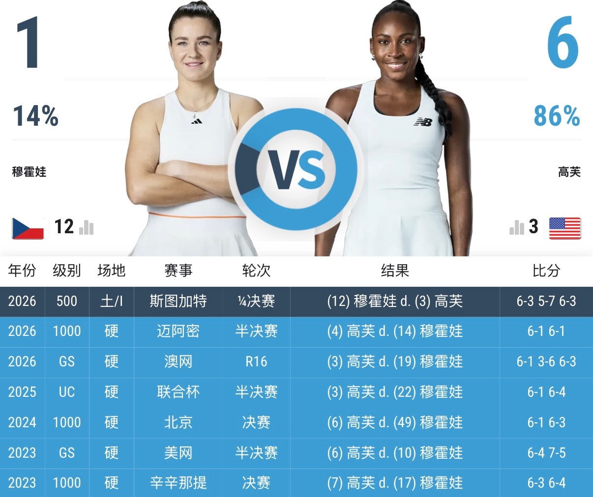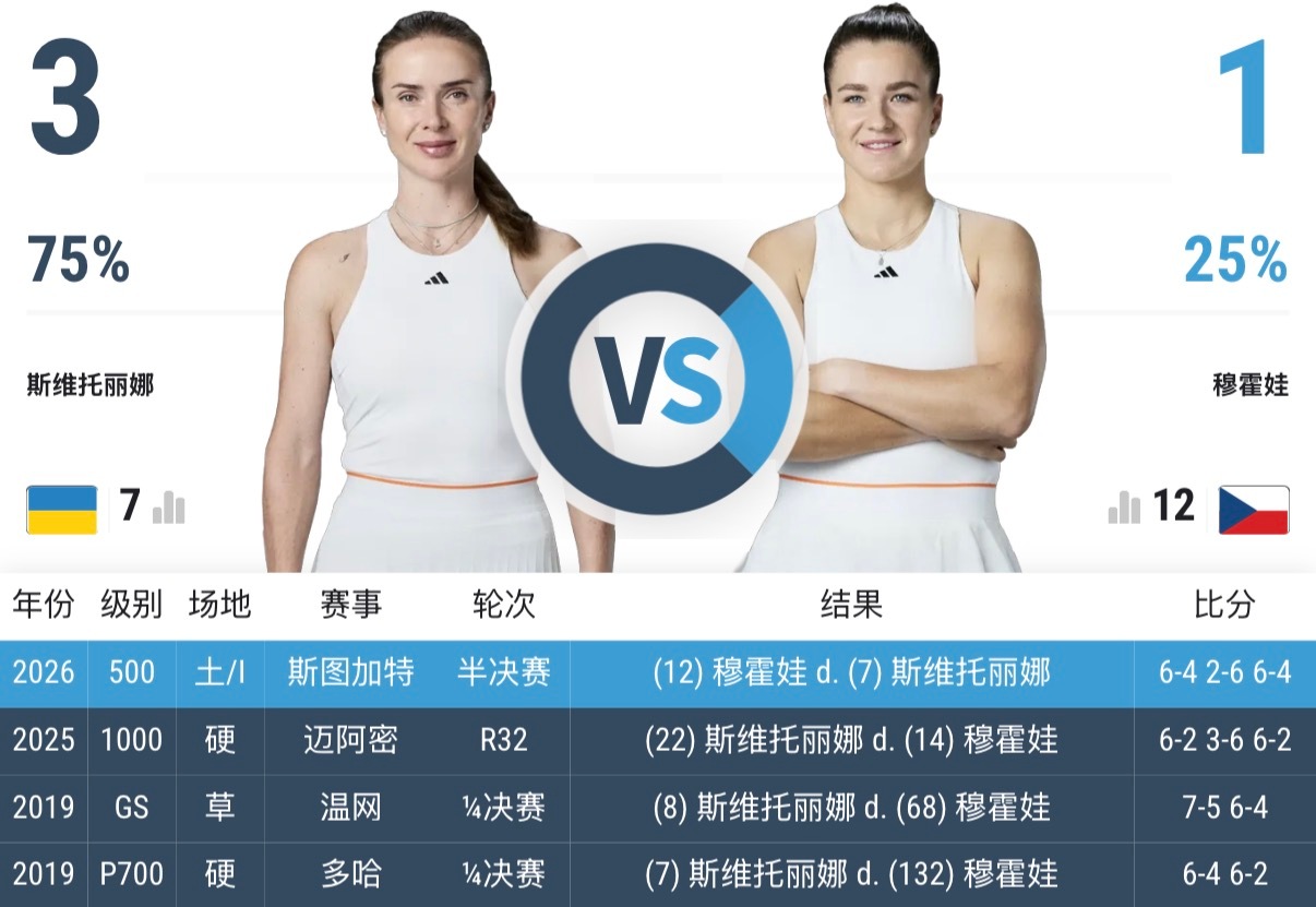 1/4决赛击败高芙,0:6➡️1:6半决赛击败斯维托丽娜,0:3➡️1:3今年不错哟,多哈冠军➕迈阿密四强,红土赛季大概率能重返前十网球 穆霍娃晋级斯图加特站决赛