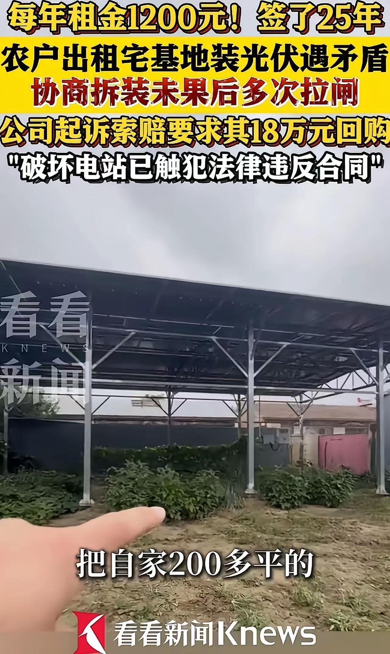 🌙“贪小便宜吃大亏!”河北廊坊,一男子将自家200多平的宅基地租出去安装光伏,对方承诺租金每年1200元,可这钱还没捂热,却赔了18万还被拘留。网友:天上没有掉馅饼的事! 霍先生在当地村里有一块200多平的空置宅基地,一直闲着没人用,他看着心里也觉得可惜,总想找个办法让这块地发挥点作用,赚点零花钱补贴家用。去年九月份,有一伙人找上门来,自称是当地一家新能源公司的工作人员,专门来推广光伏安装业务。 对方工作人员说得天花乱坠,说只要霍先生把宅基地租给他们安装光伏板,不用他出一分钱,不用操心任何事,每年就能稳稳拿到1200元租金,一签就是25年,算下来总共能拿3万元。还说光伏板安装不影响后续盖房子,要是以后想翻盖房屋,他们可以免费拆装一次,霍先生一听就动了心。 他想着,宅基地闲着也是闲着,不用投入任何成本,每年就能白拿1200元,何乐而不为?当时对方拿出一份厚厚的租赁合同,催着他签字,说名额有限,错过就没机会了。 霍先生没多想,也没仔细翻看合同里的条款,只听着对方的口头承诺,就匆匆签了字,甚至没让家里人帮忙看看合同里有没有猫腻。 签完合同没几天,对方就带着施工队来到霍先生的宅基地,很快就把光伏板安装好了,还当场给了他第一年的1200元租金。 拿着到手的钱,霍先生心里美滋滋的,觉得自己捡了个大便宜,还跟邻居炫耀,说自己不用干活就能赚钱。可他不知道,这份看似划算的租赁合同,背后藏着他承担不起的陷阱。 光伏板安装好一个多月后,邻居找到霍先生,说光伏公司的线路从自家墙上经过,影响自家使用,让霍先生赶紧联系对方整改。霍先生这才注意到,安装光伏时,对方为了图方便,确实把线路搭在了邻居家的墙上,之前对方压根没跟他提过这件事。 霍先生赶紧联系当时对接的工作人员,想让对方过来拆除光伏板,等他和邻居协商好线路问题,或者等他以后盖房子时,再重新安装,毕竟合同里也约定了,他如需翻新房屋,对方可免费拆装一次。可没想到,之前态度热情的工作人员,此时却变了脸,说自己已经辞职,让他联系公司客服。 霍先生接连打了好几次公司客服电话,每次对方都承诺会安排人联系他处理,可左等右等,始终没人上门,也没人主动给他回电话。 邻居那边催得越来越急,甚至说要是再不解决,就自己拆了线路,霍先生被逼得没办法,只能想到一个笨办法——拉电闸,想以此逼着公司出面解决。 他以为只要拉了电闸,光伏电站无法正常发电,公司就会着急,就会主动联系他协商。可他没想到,每次他拉了电闸,没过多久就有人偷偷合上,依旧没人来跟他沟通线路和拆装的事。反复几次后,对方不仅没出面,反而直接报了警,说他故意破坏光伏设备。 去年十月份,霍先生被当地警方拘留了十天,理由是故意毁坏他人财物。走出拘留所的那一刻,霍先生又气又悔,他只是想解决问题,怎么就成了破坏财物?可更让他崩溃的还在后面,今年二月份,他收到了法院的传票,那家新能源公司竟然把他告上了法庭。 公司的诉讼请求很明确,要求解除双方的租赁合同,让霍先生支付18万多元回购光伏电站,还要赔偿电费损失、维修损失等共计一万多元。 直到这时,霍先生才拿出当初签的租赁合同仔细翻看,这才发现合同里全是“陷阱”条款,里面明确写着,他不得擅自拉闸、破坏光伏设备,否则就要承担巨额赔偿。 霍先生说,他根本没注意到这些条款,对方当初也没跟他解释过,而且他拉电闸只是为了督促公司解决问题,并没有真的破坏设备,所谓的损坏,只是拧下了一个几十块钱的采集器,并不影响电站正常发电。目前,法院已经开过一次庭,还没有作出最终判决,霍先生只能等着结果,心里满是悔恨。 这件事传到网上后,很快就引发了网友的热议,有人说霍先生太贪心,想着白拿租金,没仔细看合同,活该吃大亏;也有人说光伏公司套路太深,故意用低价租金诱导农户,合同里藏着霸王条款,太不地道。还有网友感慨,天上真的没有掉馅饼的事,看似划算的买卖,背后往往都是陷阱。 不知道大家怎么看这件事?光伏公司的做法合理吗?面对低价租金的诱惑,我们该如何避免落入类似的陷阱?