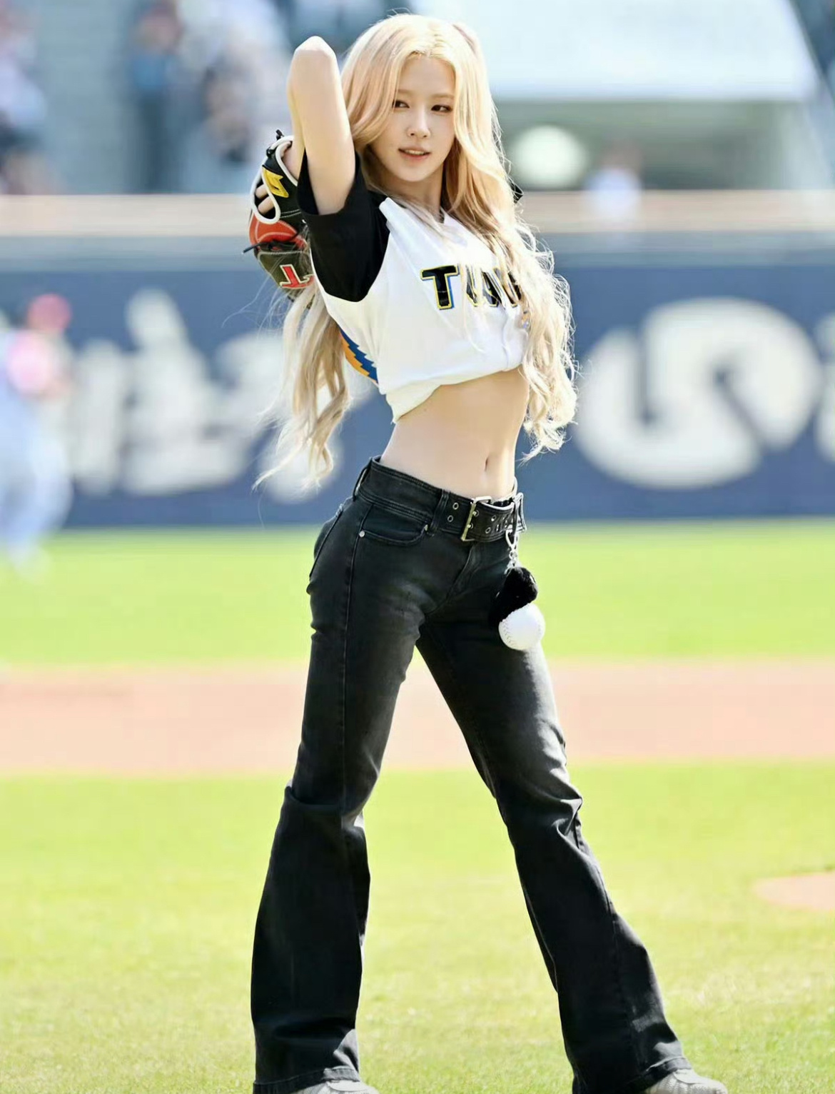 当天,林允儿一身斗山熊队专属白色棒球服搭配深蓝色棒球帽,长发披肩温柔又元气,手上戴着粉色棒球手套,造型清爽又充满活力。她先是和现场观众热情挥手互动,又和斗山熊队的吉祥物来了一波可爱互动,对着镜头比出招牌大拇指,笑容明媚治愈,完全看不出岁月痕迹,被现场观众和网友疯狂夸赞“冻龄女神”“和11年前一模一样”。开球环节中,她的动作流畅又专业,从助跑到挥臂投球一气呵成,姿势标准利落,投球的瞬间眼神专注又认真,完全看不出是时隔多年再尝试这项运动,流畅的动作和稳定的表现,让不少球迷直呼“又帅又飒,这状态也太能打了”。