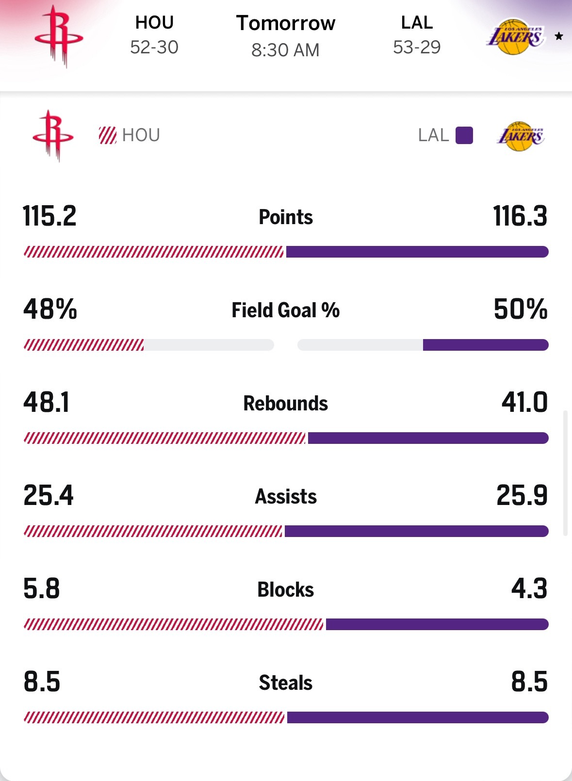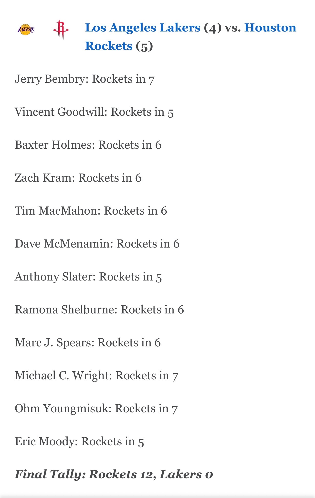 有意思的是ESPN首轮预测唯一支持湖人队的Marc J. Spears已经改变了注意,现在他认为火箭六场终结湖人。目前12位专家都支持火箭队。詹姆斯得分+助攻+篮板高达41.5,大包大揽是肯定的。