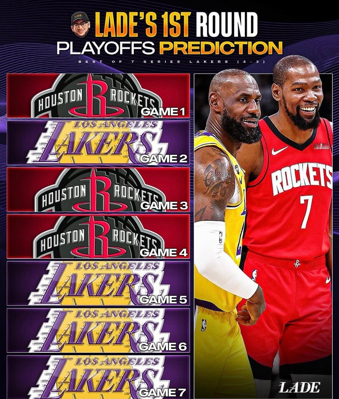 我并不反对他们支持火箭,确实承认火箭获胜的概率现在比湖人大。但我认为湖人也能赢2场比赛,那么就看是哪两场了。