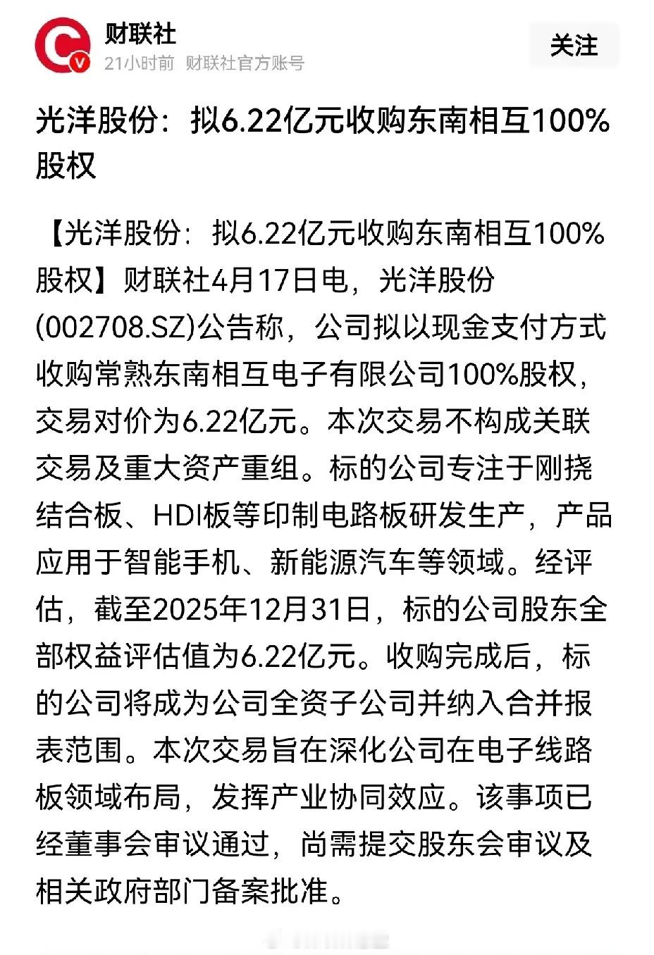光洋股份收购东南相互100%股权,这是不是利好?股价走势,近期四根阳线,上涨幅度也不小,从11.2元涨到14.7元,30%的涨幅与这个利好是否关联?后量超前量,走势蛮流畅。如果此公告被资金认可,周一会继续高歌一曲。如果此公告不被资金认可或者说资金选择利好兑现,则有可能短期回调一下。