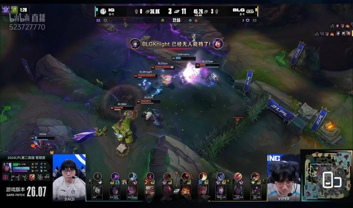 BLG对战iG其实现在BLG状态也挺低迷的,和IG打了个二比一,姜大哥走了之后IG的热度也大降了。