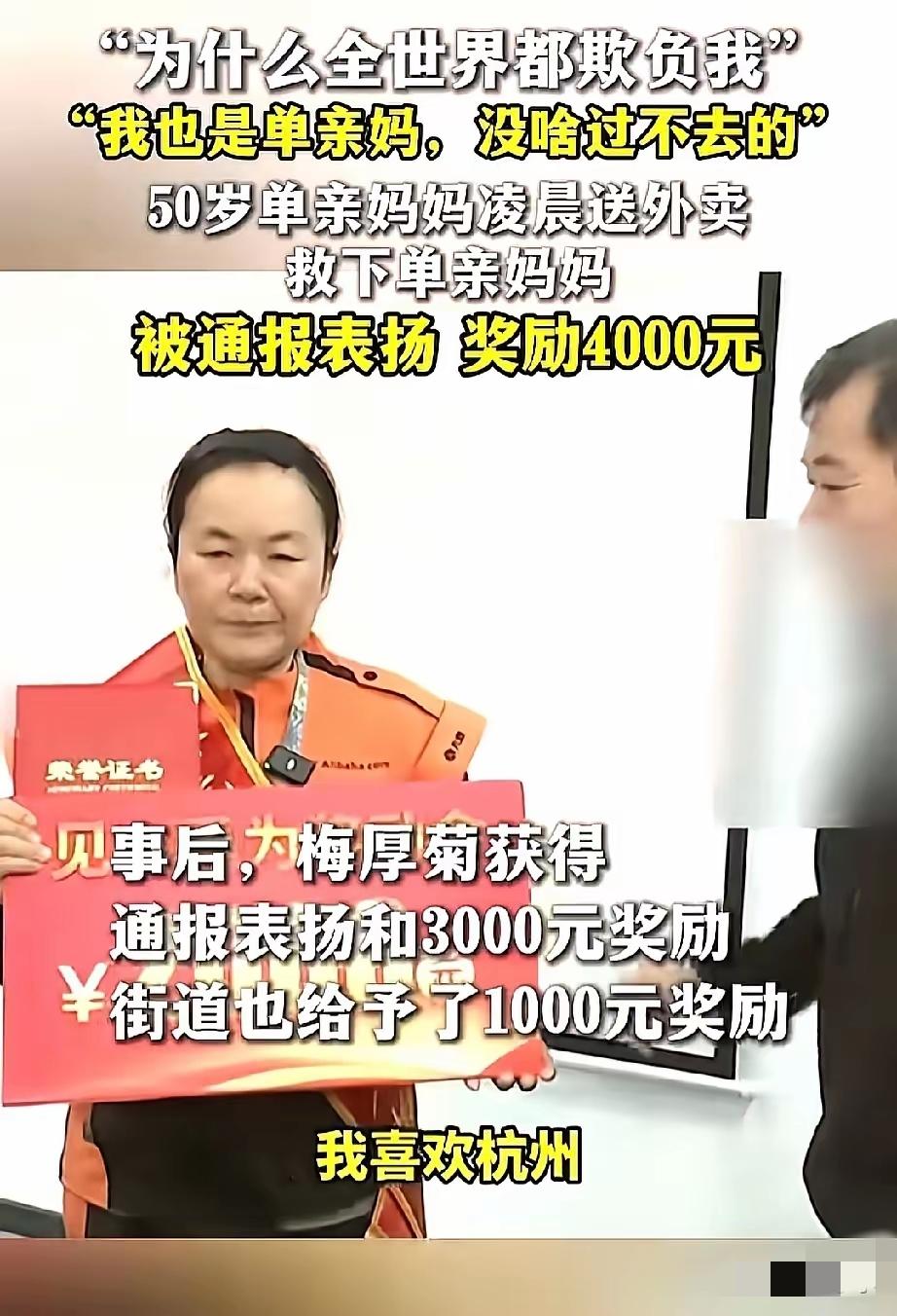 只有穷苦人,才最懂穷苦人的难!杭州这位50岁外卖单亲妈妈, 凌晨送餐途中救下轻生的单亲妈妈,用自己的苦难经历暖心劝解,看哭无数人。 她独自拉扯三个孩子,十年前也动过轻生念头,靠着社区帮扶和咬牙坚持才熬出头。 同为底层妈妈,她最懂生活的委屈与绝望,宁愿订单超时也要拉对方一把。 自己淋过雨,却拼命为别人撑伞,这份底层互助的善良,比任何鸡汤都动人 。生活再难,熬过去就有希望,别轻易放弃自己。 你被这份平凡的善意打动了吗?