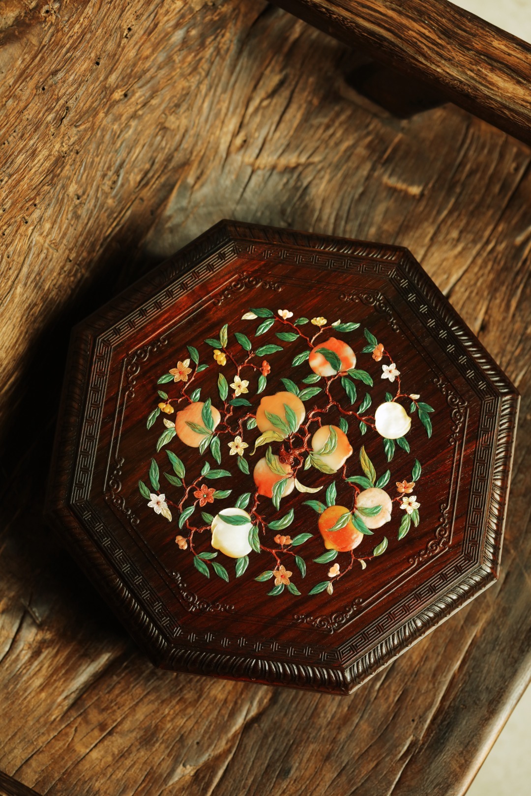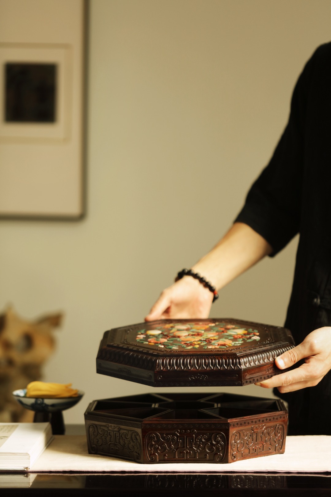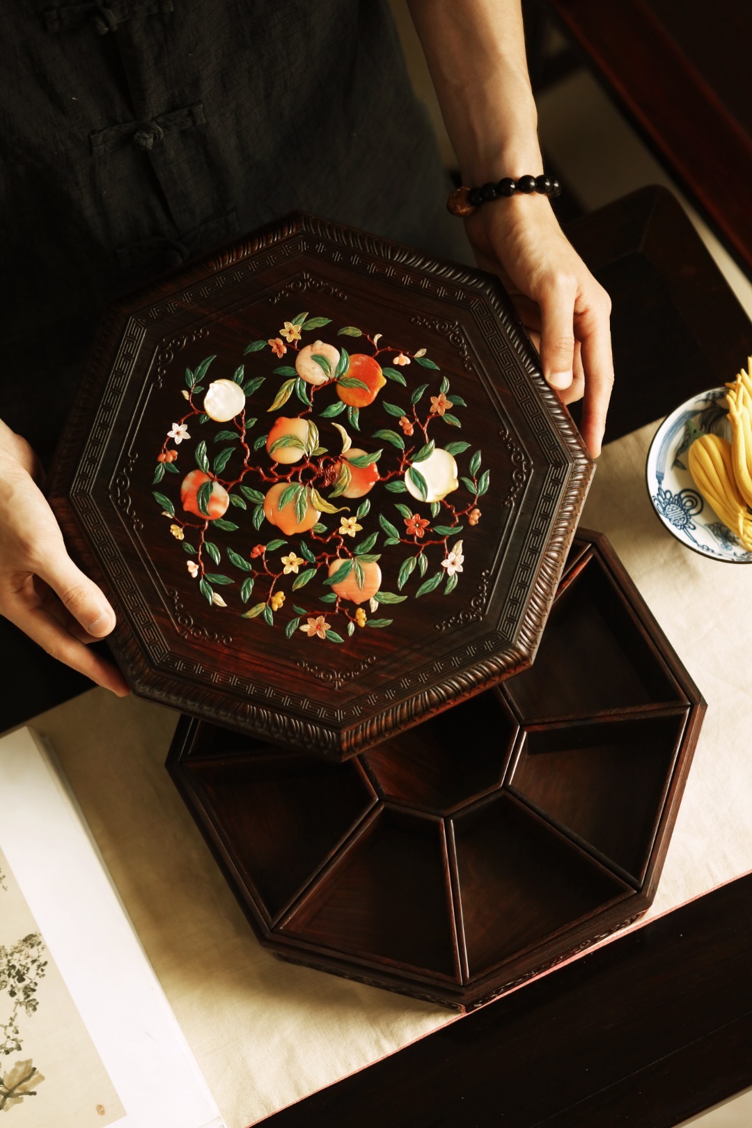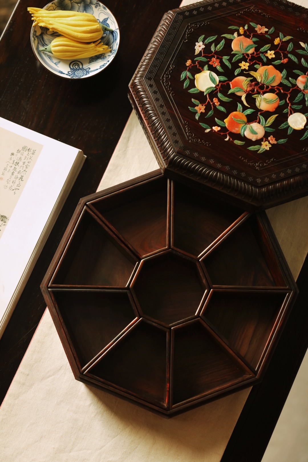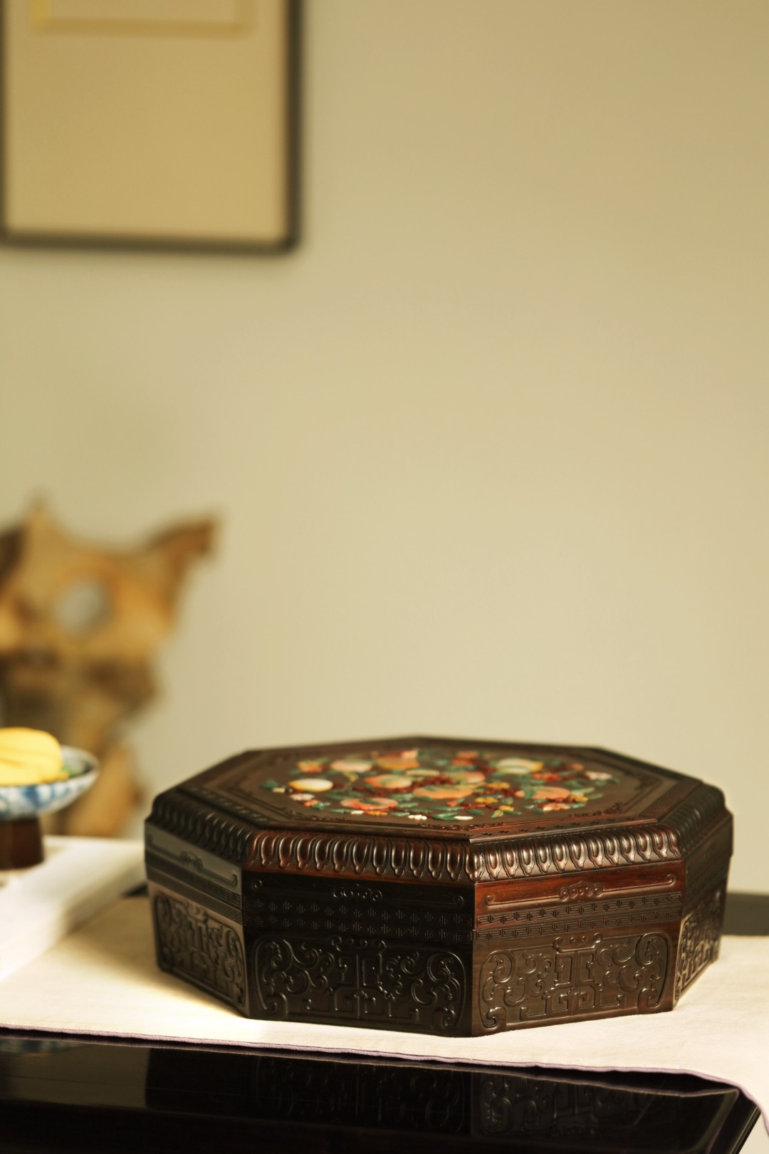 大红酸枝老料制作,盒盖百宝镶嵌,内入九格,可独立拆出作小果盘,周边浮雕如意缠枝纹,象征多福多子,祈福祝愿,寓意吉祥。