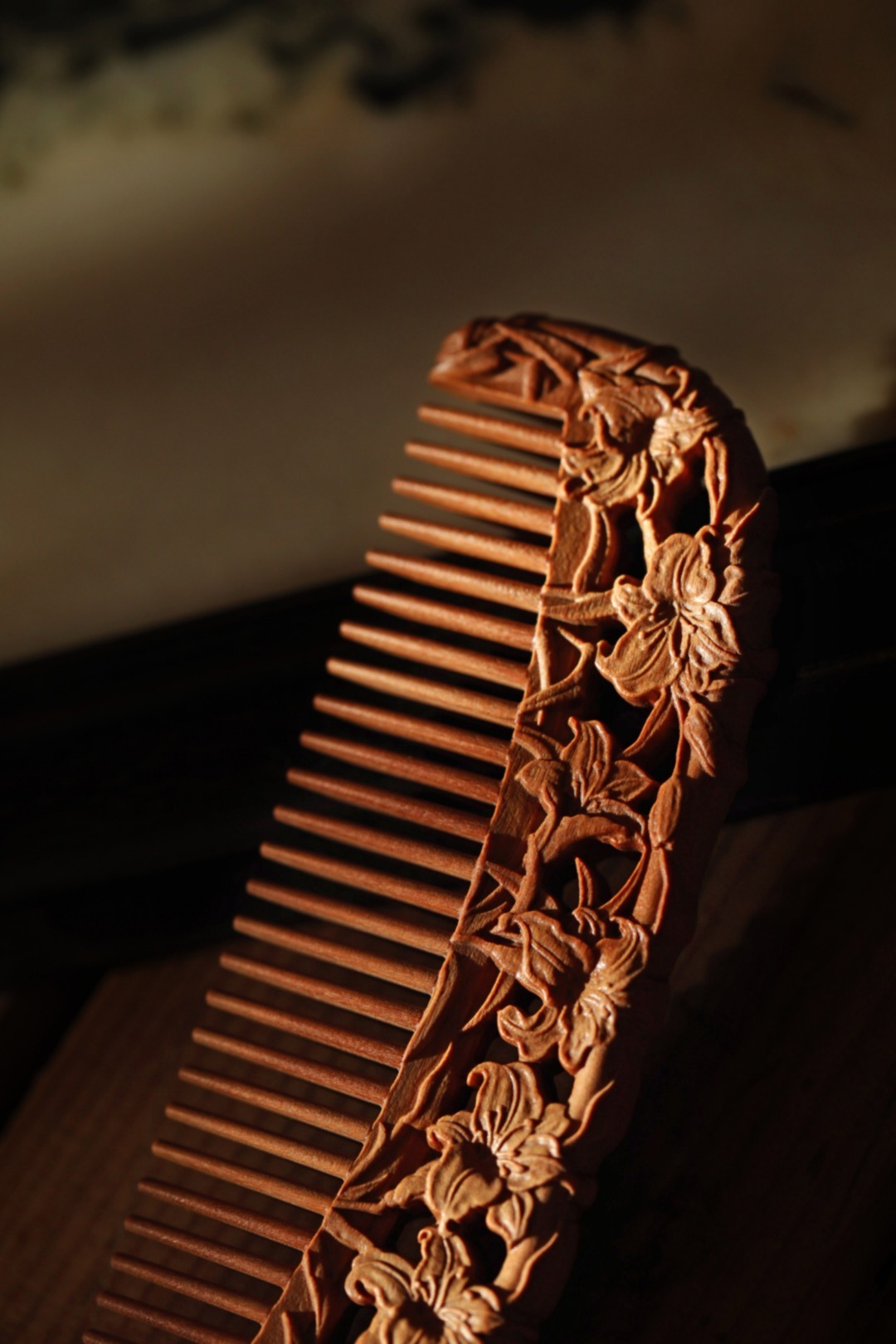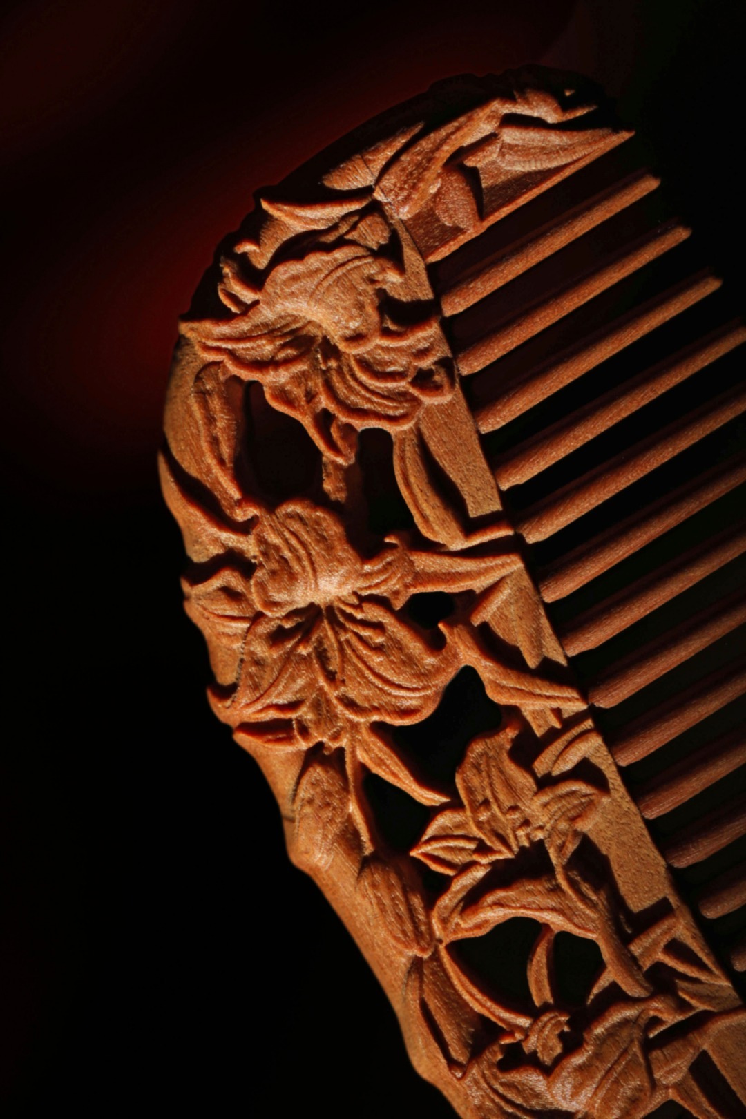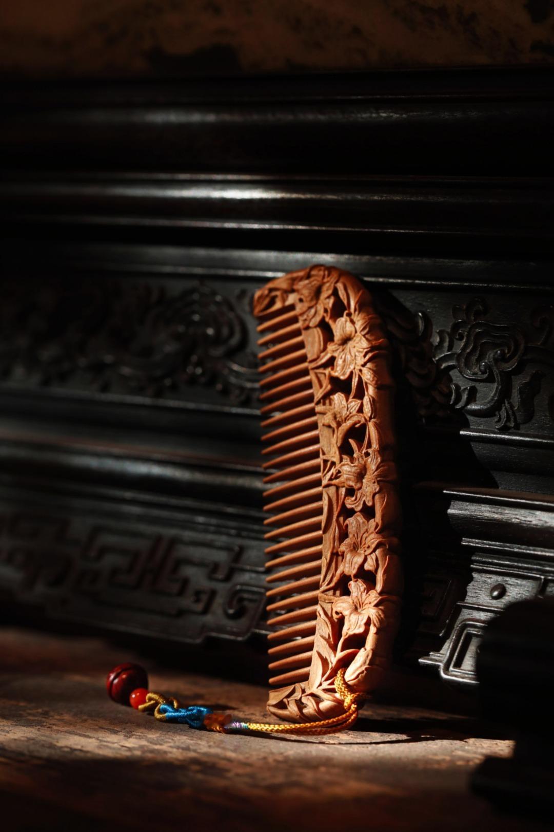 木梳,亦是雕花艺术品;镂空雕刻百合花,立体感强;百年好合,把一生都梳给你!