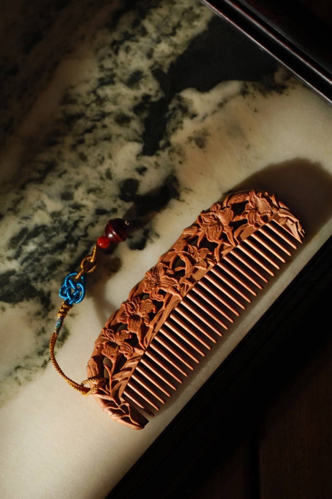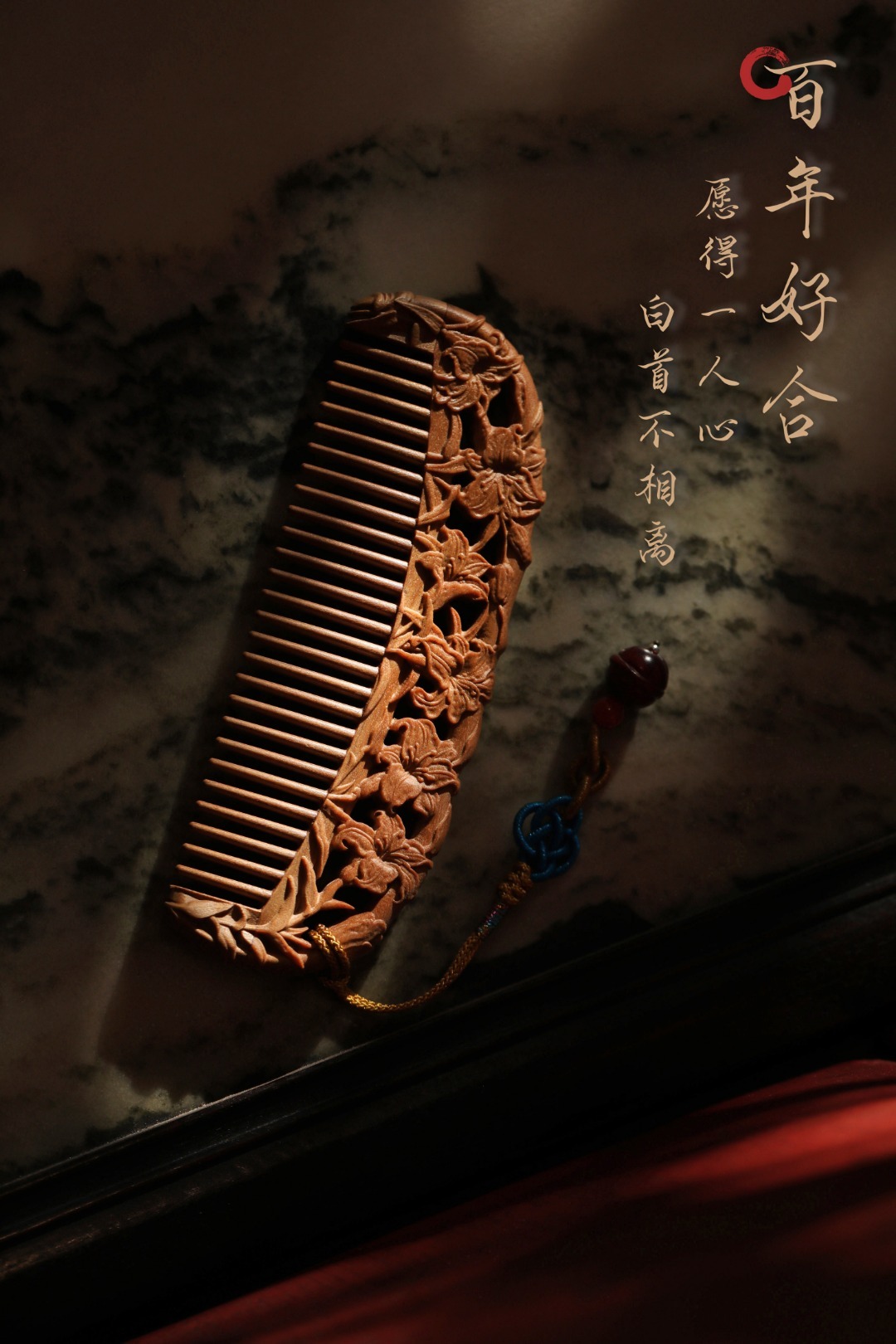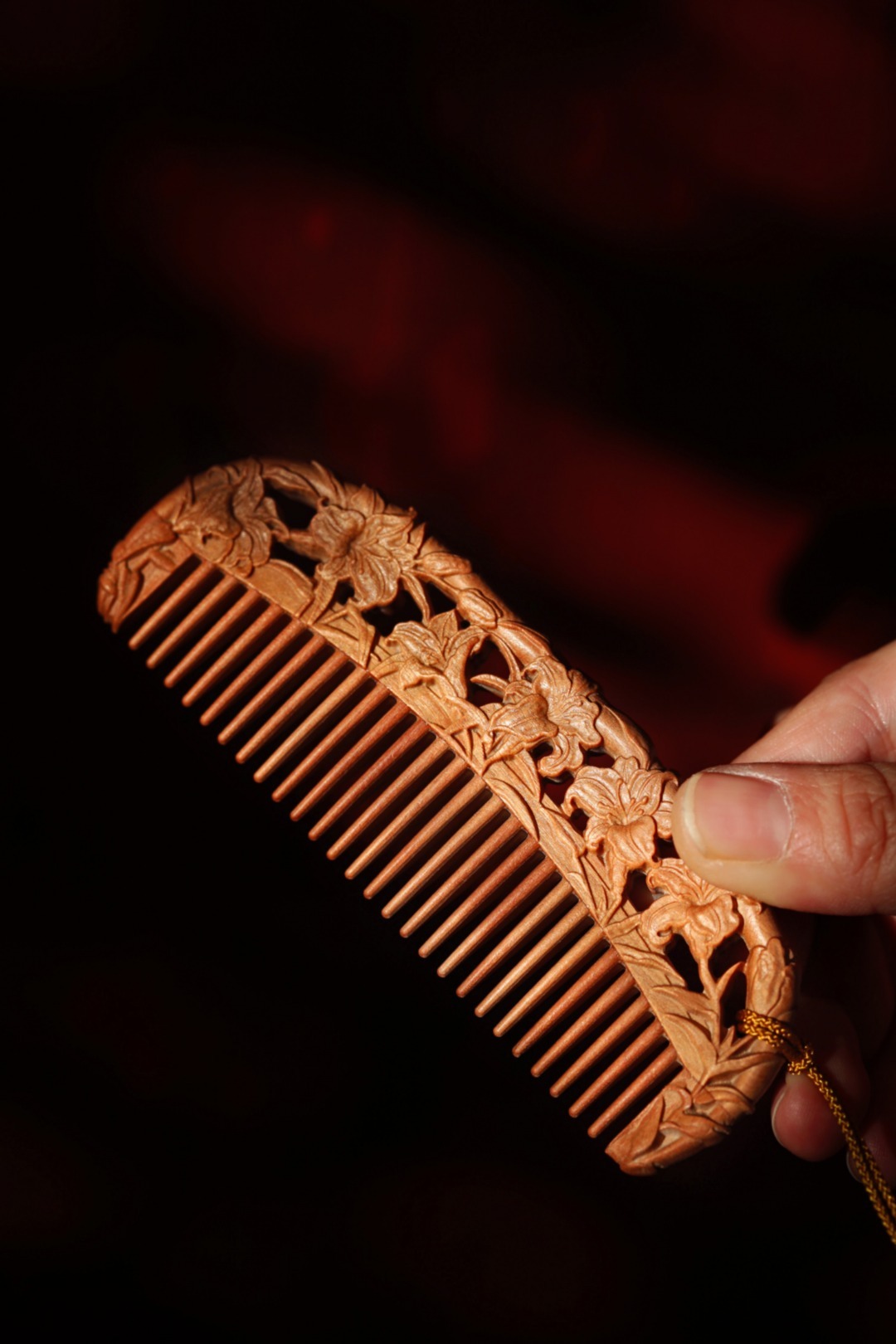 木梳,亦是雕花艺术品;镂空雕刻百合花,立体感强;百年好合,把一生都梳给你!