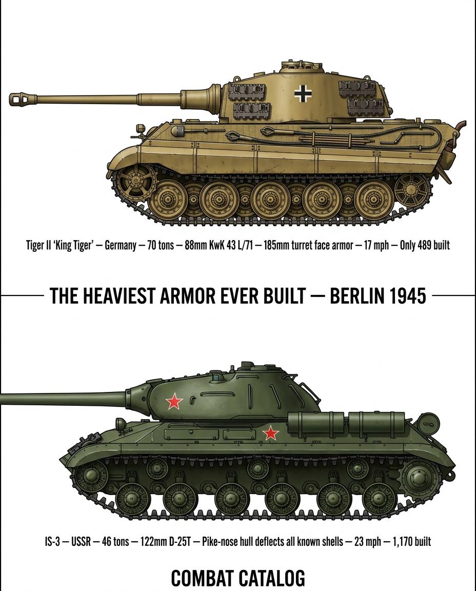 这张图直接对比了二战末期两大 “重甲王者”—— 德国虎王和苏联 IS-3 坦克,它们代表了两种完全不同的装甲设计哲学。 🐯 虎王:用厚度堆出来的 “纸面无敌” 虎王是德国装甲的巅峰之作,思路简单粗暴:把最厚的钢,装在最猛的炮上。它的炮塔正面装甲厚达 185 毫米,理论上免疫所有盟军坦克炮的正面攻击。搭载的 88mm KwK 43 炮,能在 3000 米外击穿任何盟军坦克的装甲,堪称 “二战最强反坦克炮” 。 但它也是后勤的噩梦:70 吨的重量压垮了几乎所有桥梁,迈巴赫发动机和复杂的传动系统故障频发,很多虎王不是被敌人打坏,而是被自己的车组因机械故障放弃。整个战争只造了 489 辆,造一辆虎王的钢,够造三辆 T-34。 ⚡ IS-3:用角度玩出的 “魔法装甲” IS-3 则代表了苏联截然不同的思路:装甲角度比厚度更重要。革命性的 “箭簇型” 车体(俗称 “ Pike-Nose”),两块倾斜装甲在中心交汇成尖锐的棱线,没有任何一块装甲能让炮弹垂直命中,大大提升了等效防护。 主炮是 122mm D-25T,虽然穿深不如虎王的 88 炮,但巨大的炮弹哪怕不击穿,也能靠冲击波在敌方坦克内部造成致命超压,震死车组成员、破坏设备。 46 吨的重量比虎王轻了 24 吨,机动性和可靠性强得多,最终造了 1170 辆,产量远超虎王。 最终的时代答案 当 IS-3 在 1945 年柏林胜利阅兵式上驶过,西方观察员都被它的设计震撼了,这也直接推动了战后主战坦克的发展。虎王的 “堆厚度” 思路被淘汰,而 IS-3 开创的 “倾斜装甲” 设计,成了后世坦克的标配。 春日生活打卡季战争雷霆坦克世界