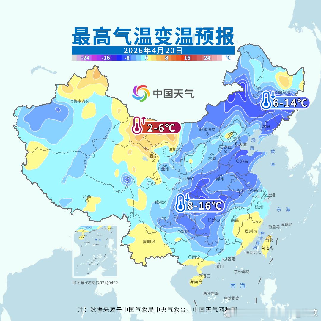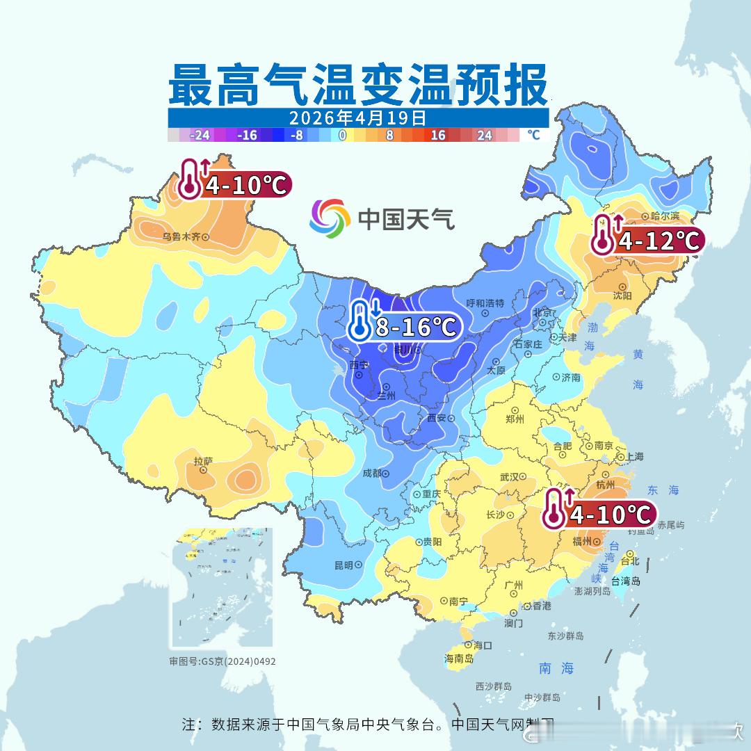 【气温大幅波动】今天海南无高温,4月5日以来的高温过程,彻底结束。今天有10个省会首府直辖市气温创新高,兰州和银川都是今年首次上30℃。具体为(℃):银川30.4、兰州30.1、呼和浩特(51463站)24.6、太原(53772站)27.4、石家庄28.2、天津西青29.7、济南28.9、西宁24.2、武汉28.5、重庆沙坪坝31.8。