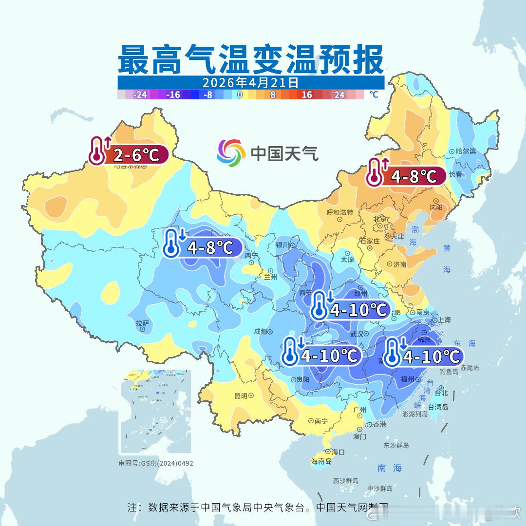 未来3天冷空气将东移南下,使得多地气温经历从大幅偏高转为明显偏低的极大反差。短短1-2天,北方多地到长江流域,气温就会下降10℃以上。由于晚间预报的某日气温是按照前一天20时-当天20时,因此当有阴雨+冷空气,导致气温倒降,会使得最高气温出现在前一晚,而当天下午气温低,实际气温降幅比预报显得更猛烈。