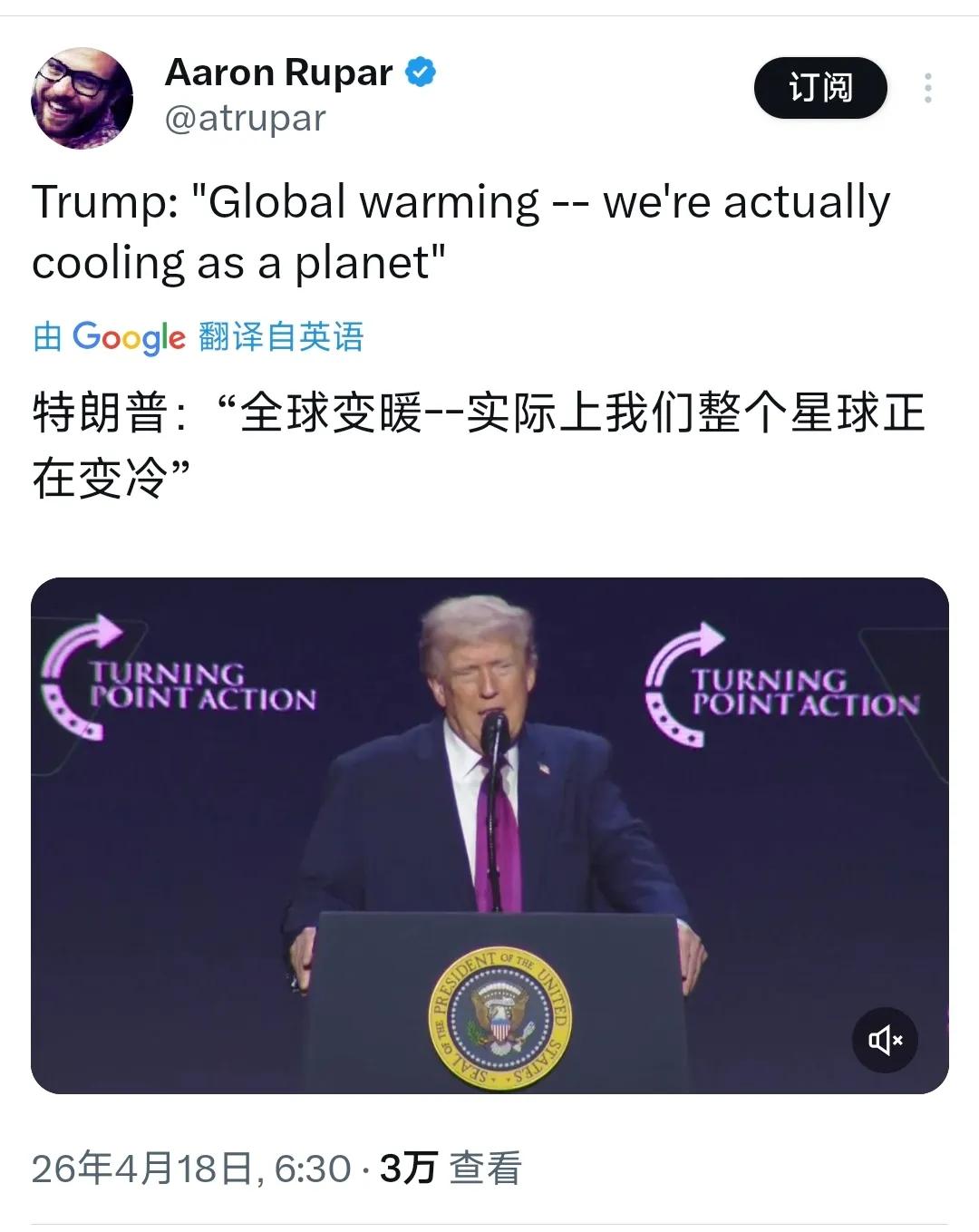 特朗普今天(4月18日)接受采访时表示:“全球变暖——实际上我们整个星球正在变冷。” 世界气象组织今年发布的数据显示,2024年是1850年有气象记录以来最热的一年;2015-2025年这11年,包揽了历史上最热的11个年份。特朗普的全球变冷论是在为大量使用化石能源、两次退出《巴黎协定》编造谎言。