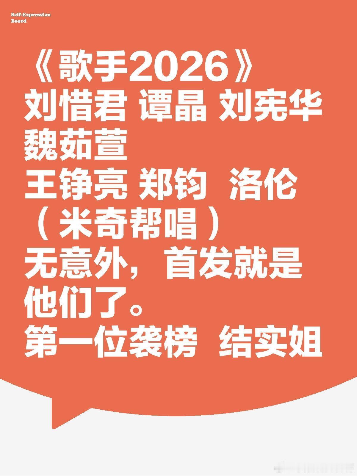 《歌手2026》刘惜君 谭晶 刘宪华 魏茹萱王铮亮 郑钧 洛伦(米奇帮唱)无意外,首发就是他们了。第一位袭榜 结实姐