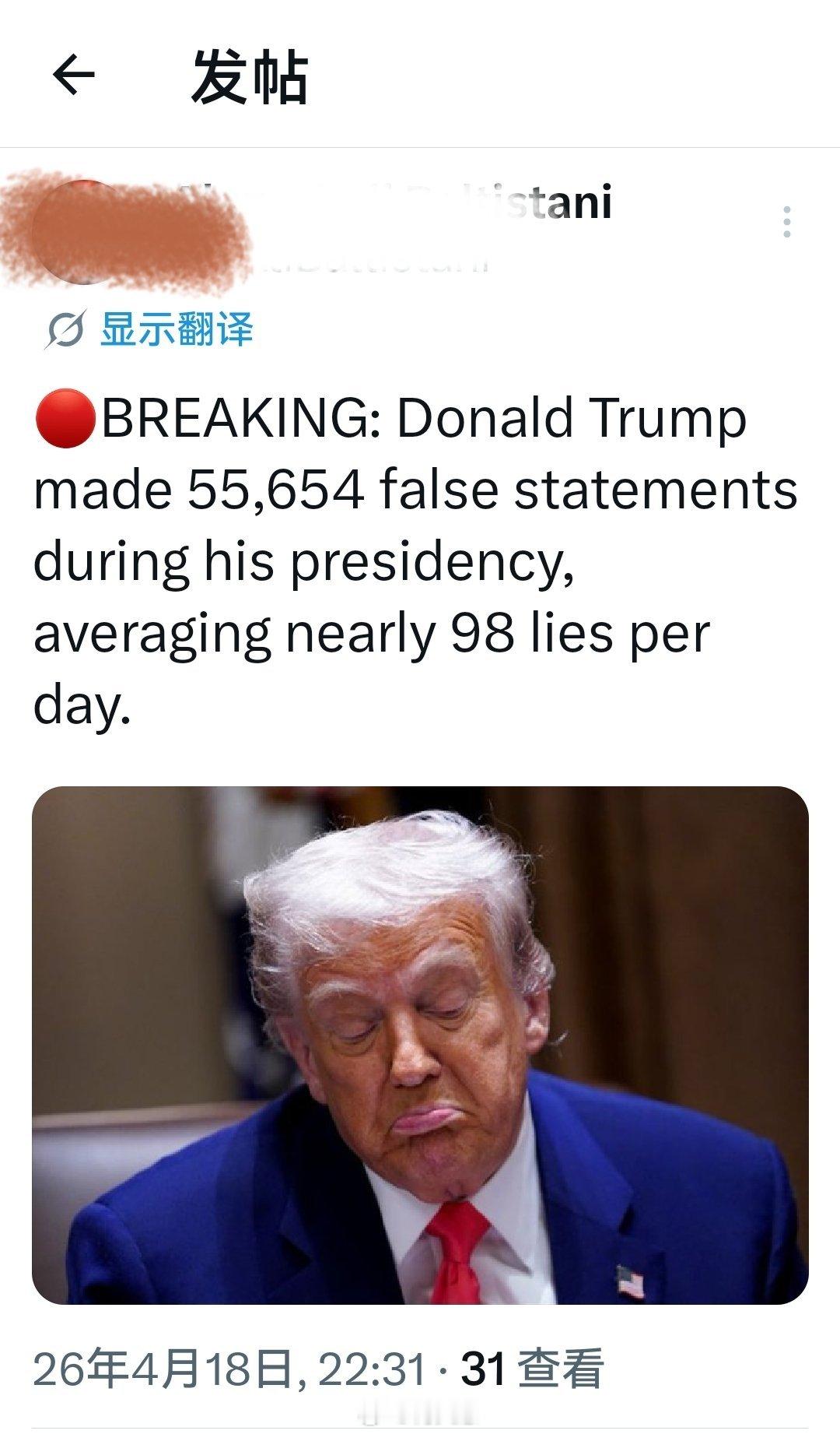 最新消息:唐纳德特朗普在其总统任期内发表了55,654条虚假信息,平均每天发布近98条谎言。