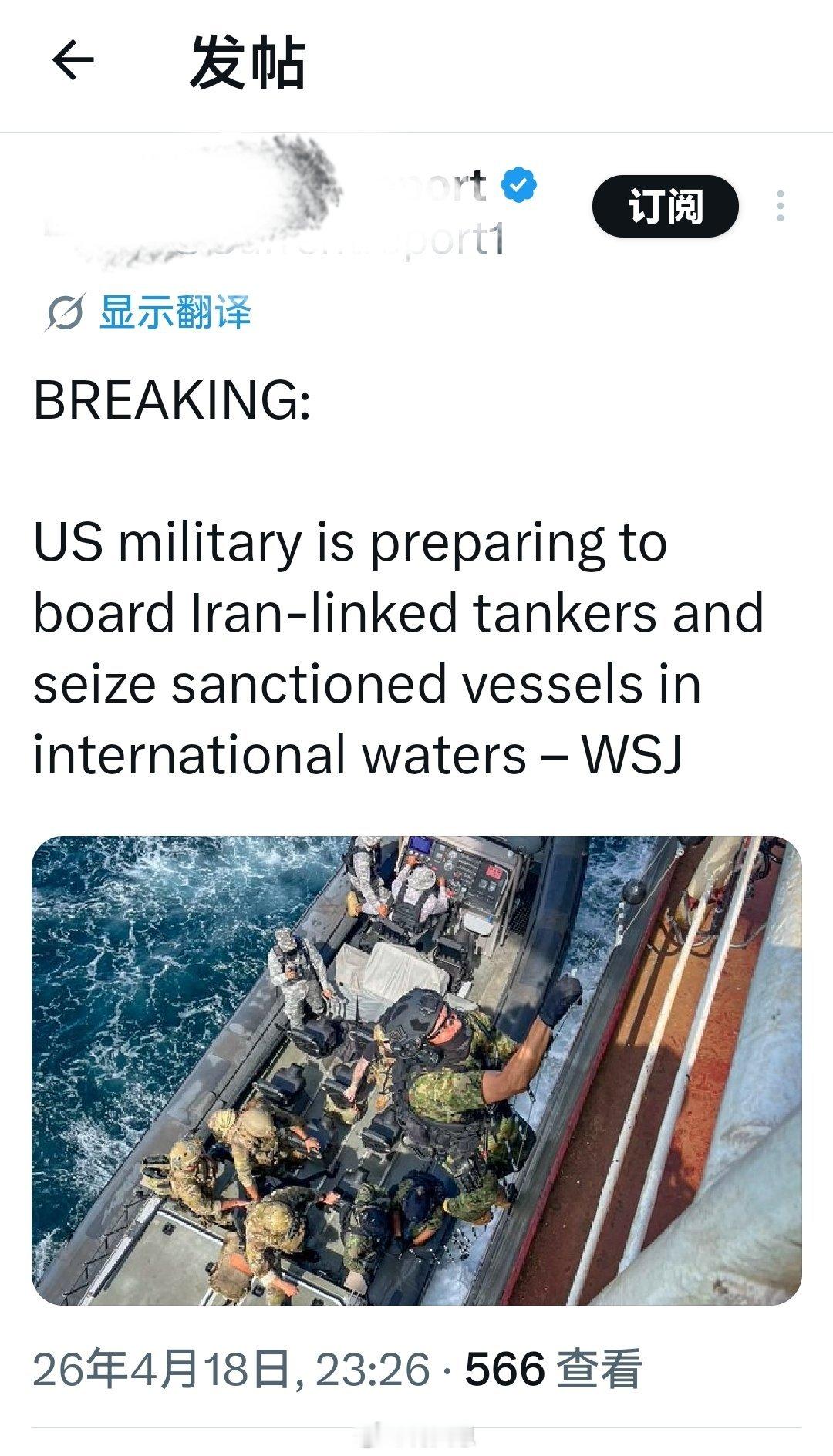 突发新闻:美国军方正准备登上与伊朗有关的油轮,并在国际水域扣押受制裁船只——《华尔街日报》