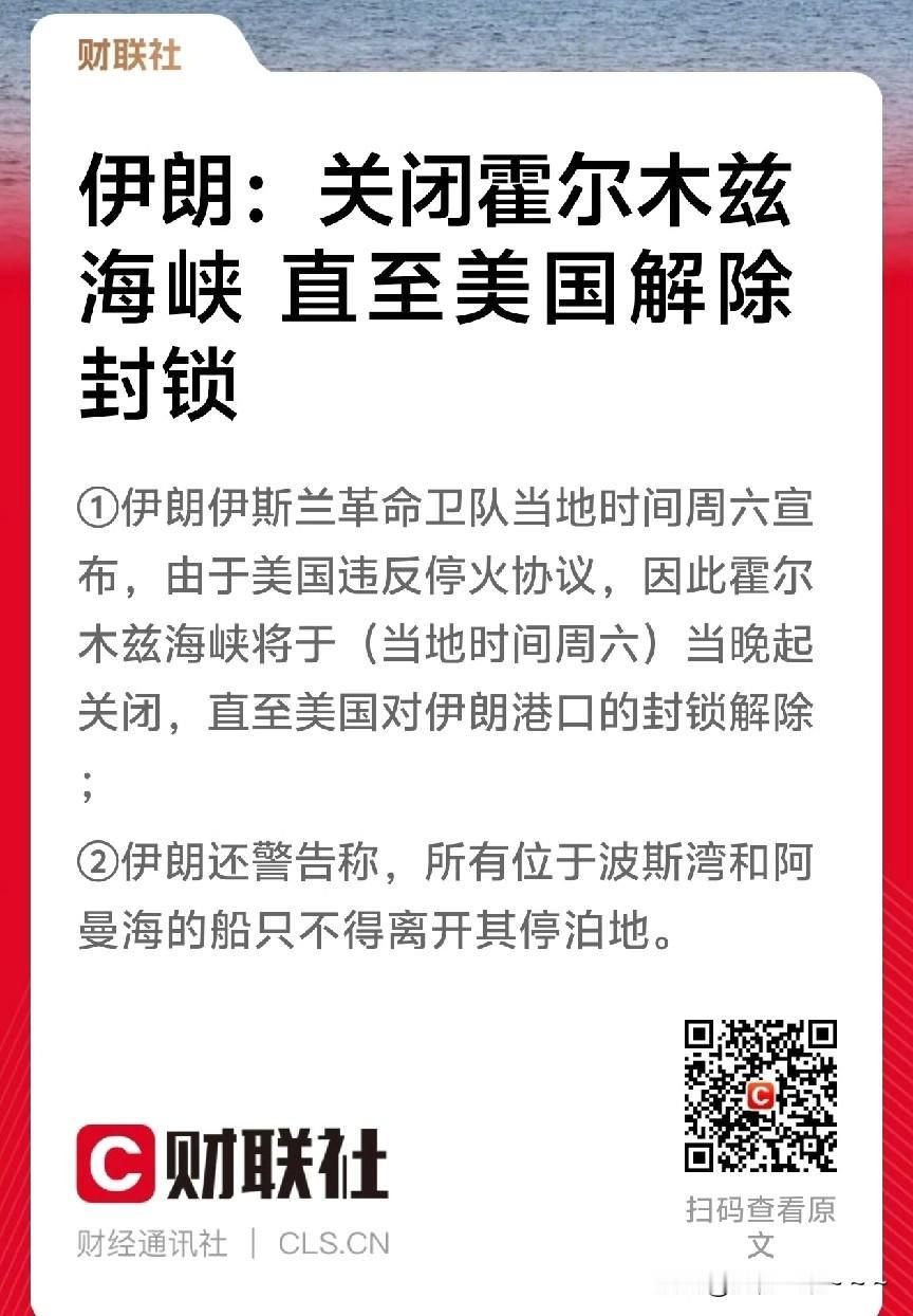 最新消息! 就在刚刚,伊朗革命卫队发布消息称:伊朗从周六晚上开始封锁霍尔木兹海峡,直到美国海军完全解除海上封锁。 此前,美国想通过经济制裁和金融工具打击伊朗,同时在军事部署上要加大部署对霍尔木兹海峡进行封锁以及想排雷开辟新的通道。 更惯用的是,美国想在舆论上用“欺骗”的方式让伊朗放开霍尔木兹海峡的管控,导致伊朗对美国一点信任感也没有,所以现在局势也非常紧张,你封你的,我封我的。 伊朗美国霍尔木兹海峡