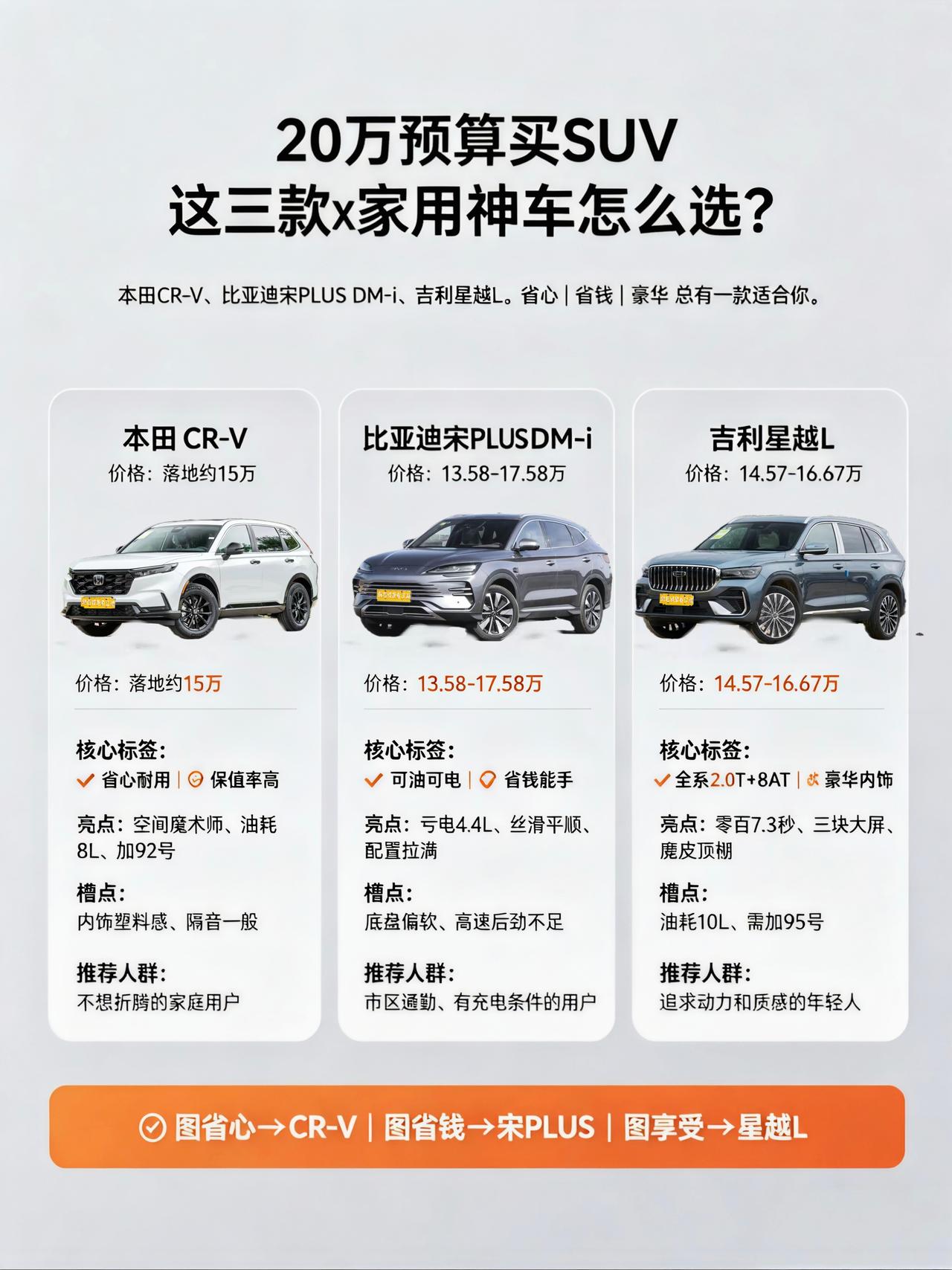 20万预算买SUV?这三款车各有绝活,看完不纠结! 最近后台不少朋友问:“预算20万左右,家用SUV怎么选?”这个价位卷得最厉害,国产、合资、新能源扎堆,确实容易眼花。 我结合试驾和身边朋友的真实反馈,盘点了三款口碑稳、各有侧重的车——本田CR-V、比亚迪宋PLUS DM-i、吉利星越L。三款车都适合家用,但性格完全不同,直接上干货。 1. 本田CR-V(燃油版):省心耐用的老牌选手 适合人群: 不想折腾、追求保值率、对新能源无感的朋友。 核心参数: 1.5T发动机+CVT变速箱,193马力,243N·m,WLTC综合油耗7.31L/100km,轴距2701mm。 优点: · 空间利用率高,后排坐三个成年人不挤,储物格多 · 油耗经济,市区8L左右、高速6L多,加92号油 · 保值率高,开三年亏得少 槽点: · 内饰塑料感强,车机反应慢 · 隔音一般,高速风噪胎噪明显 · 动力平顺但不跟脚,没推背感 个人看法: CR-V像个老实人,没什么惊艳的地方,但挑不出大毛病。把车当纯工具、不想折腾的话,闭眼买没问题。 2. 比亚迪宋PLUS DM-i:可油可电的省钱能手 适合人群: 市区通勤多、家里能装充电桩、想省油钱的朋友。 核心参数: 1.5L插混系统+E-CVT,电机最大功率145kW,亏电油耗4.4L/100km,纯电续航75km起,轴距2765mm。 优点: · 用车成本低,有充电条件的话日常当电车开 · 平顺安静,电机驱动起步丝滑 · 配置丰富,大屏、360影像、L2辅助驾驶都给齐了 槽点: · 底盘偏软,过烂路晃悠感明显,后排易晕车 · 高速再加速能力一般 · 优惠少,基本原价卖 个人看法: 这是典型的“市区神车”,每天通勤几十公里的话,一年省好几千油钱。但常年跑高速或山路的话,底盘和动力会让你有点难受。 3. 吉利星越L:配置拉满的国产卷王 适合人群: 在意内饰质感、动力、智能化体验,对品牌不执着的朋友。 核心参数: 全系2.0T发动机+8AT变速箱,238马力,350N·m,零百7.3秒,WLTC综合油耗7.8L/100km,需加95号油,轴距2845mm,车机为Flyme Auto系统。 优点: · 内饰越级,三块大屏、麂皮顶棚、座椅通风加热 · 动力强,加速爽快,高速超车有信心 · 空间大,后排腿部空间比CR-V还宽裕 槽点: · 油耗偏高,市区10L左右,还得加95号油 · 品牌保值率不如本田 · 新车机流畅度提升,但长期稳定性待观察 个人看法: 星越L是那种“坐进去就不想出来”的车,配置和质感给得太足了。不在乎油钱和保值率的话,它绝对最值。 最后总结 · 图省心保值:本田CR-V,闭眼入不出错 · 图省钱、市区通勤多:比亚迪宋PLUS DM-i,有充电条件真香 · 图享受、要动力要质感:吉利星越L,国产SUV良心之作 三款车我都试过,没有绝对好坏,只有适不适合你。周末带上家人挨个去试驾,让后排坐一坐,你心里就有答案了。【来自懂车帝车友圈】