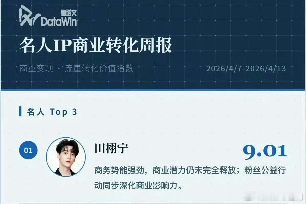田栩宁德塔文认证商业价值断层TOP1,商务带货实力一骑绝尘,各大品牌销量屡创佳绩。粉丝紧随偶像步伐积极投身公益,以爱践行社会责任,人美心善双向奔赴,实力与人品兼具,尽显顶流担当与正向影响力。