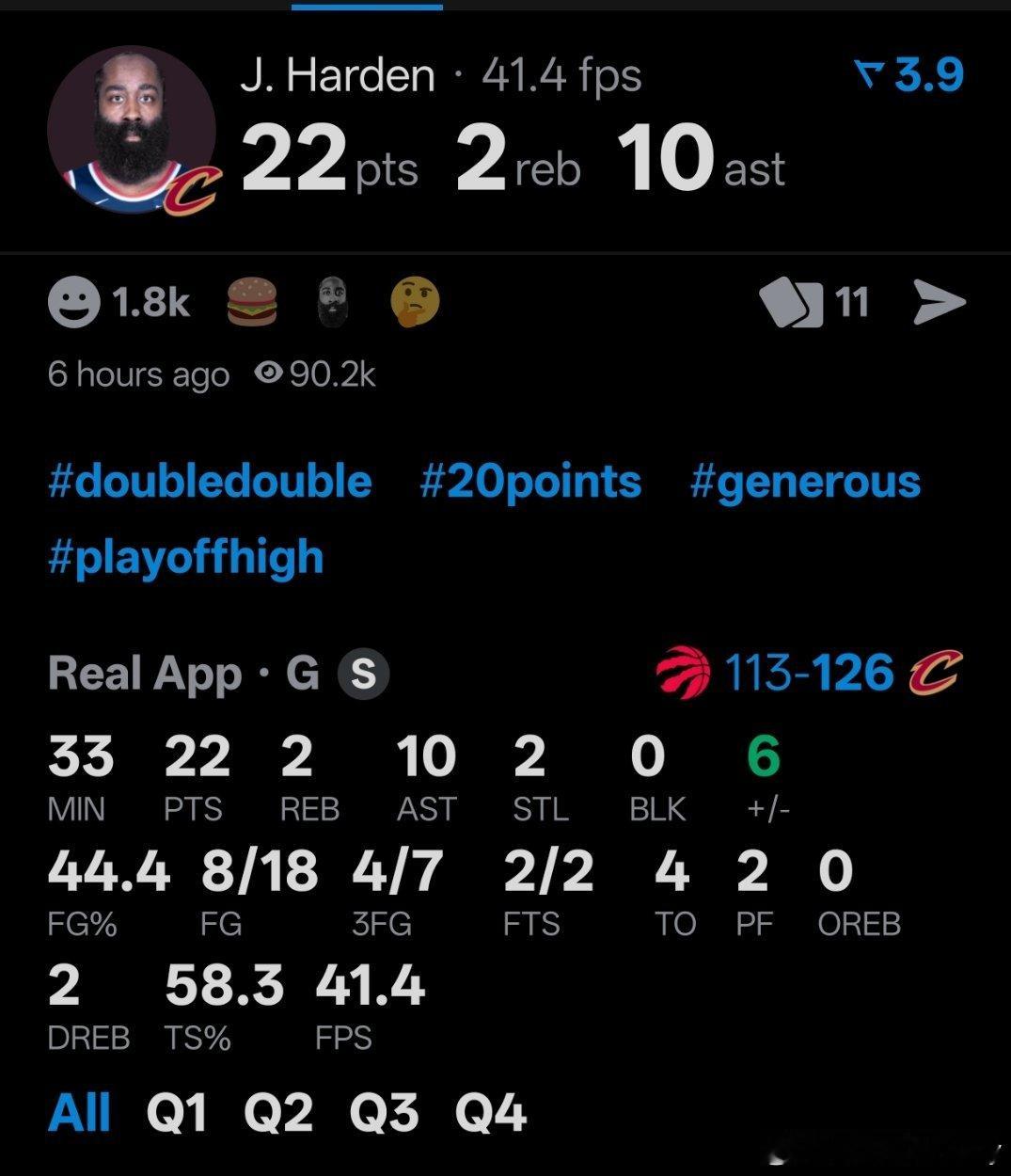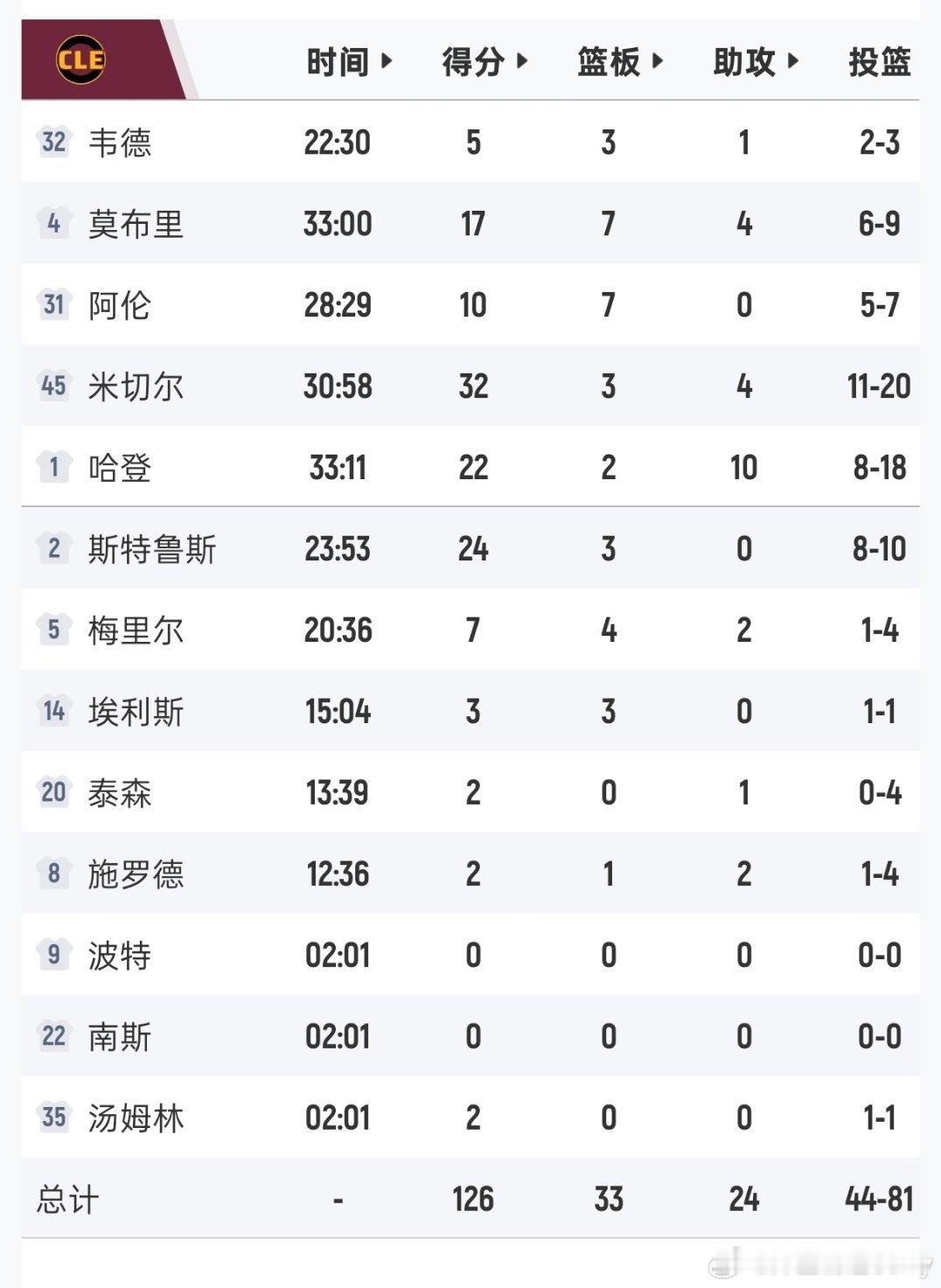 米切尔32分,斯特鲁斯24分,哈登22分10助攻。巴雷特24分,巴恩斯21分。