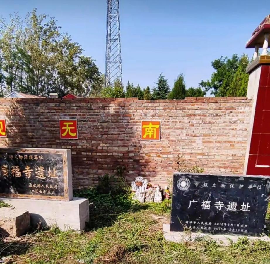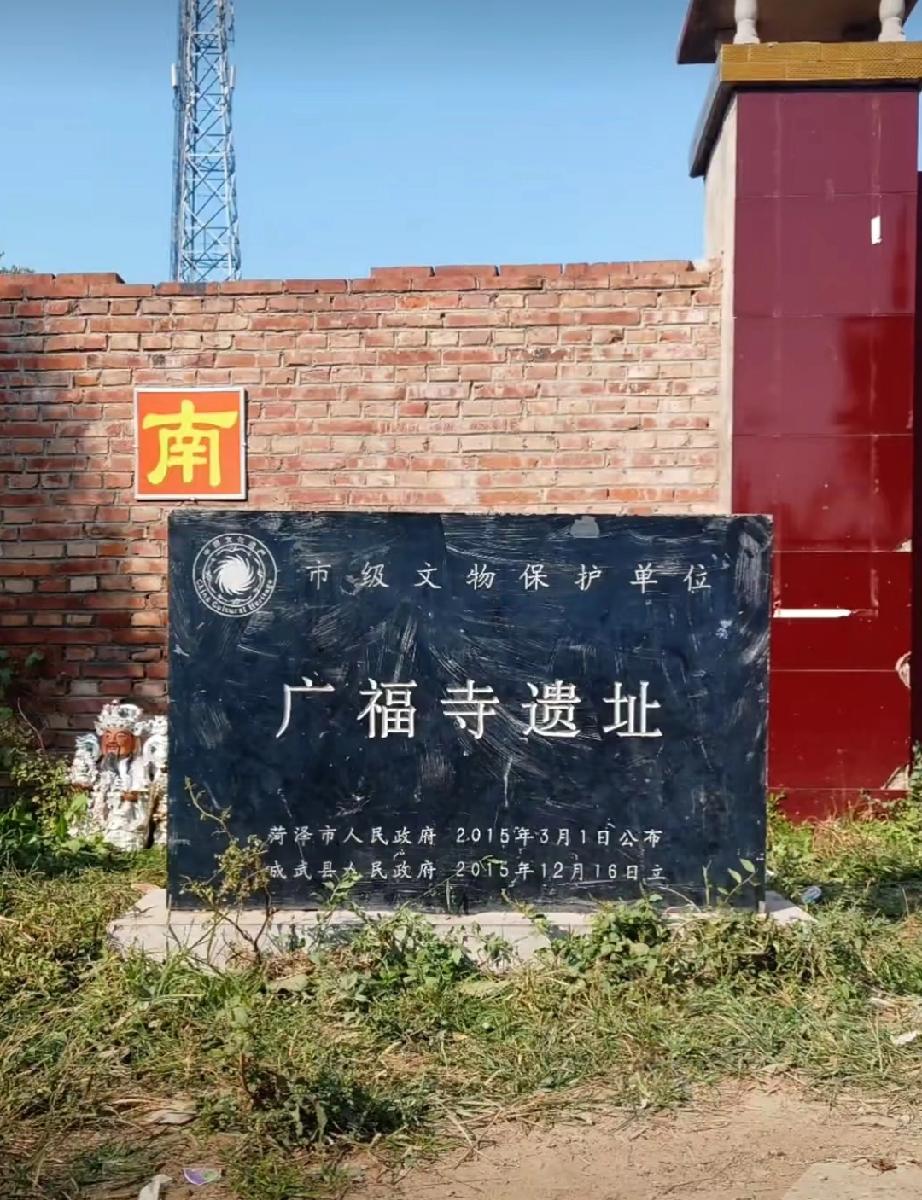 菏泽市广福寺 成武县大田集镇桃花寺村内,是一处具有金、元、明、清多代历史遗存的佛教遗址。 始建于金大定五年,明清时期多次重修,后仅存残殿,70年代改建为桃花寺中学,2006年重建,2007年列为县级文物保护单位,2015年被公布为市级文物保护单位。 有明清碑刻共8通,包括: 明弘治十八年(1505年)《重修广福寺记碑》 明万历年间(1573–1620)《重修广福寺记碑》 清康熙二十一年(1682年)《创建昆仑阁序碑》 清乾隆三十四年(1769年)《广福寺重修山门金塑天王记碑》 清嘉庆五年(1800年)《重修昆庐阁序碑》 清道光二十七年(1847年)《重修达摩祖师庙碑》 清同治十三年(1874年)《重修广福寺碑》 碑座“龟趺”一对、残碑数块、刻画石磙一对、残石柱一对、庙井一口。