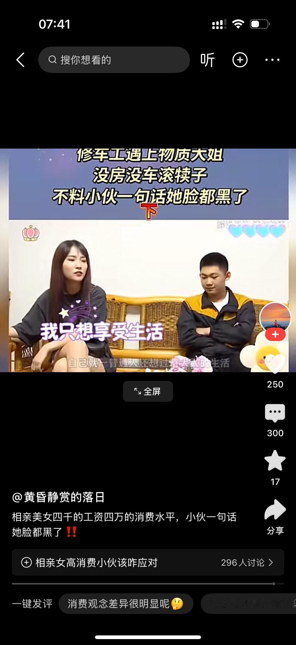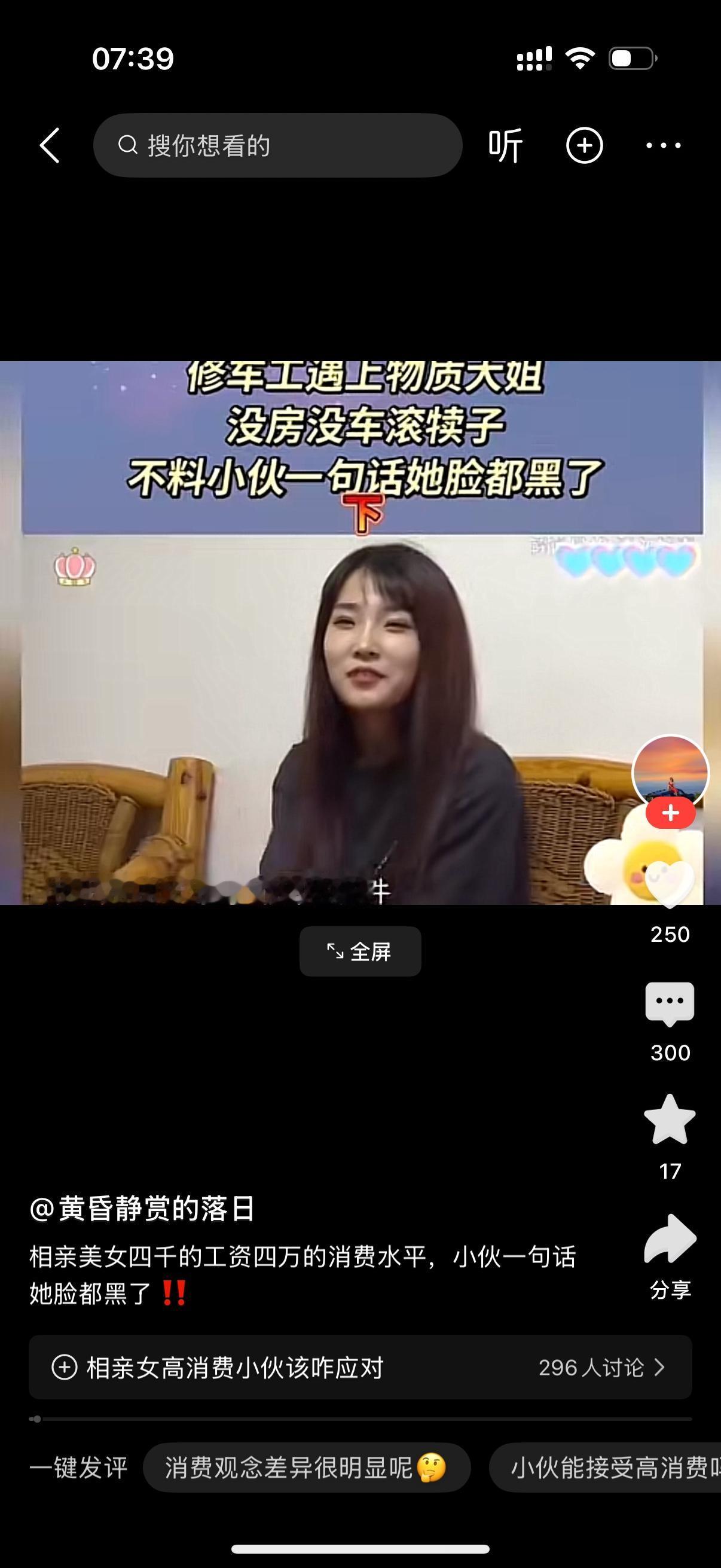 修车工和物质女相亲。物质女第一句话就是有房有车吗?修车工说暂时还没有。物质女接着问,那你有存款吗?男子说,10来万还是有的。物质女噗嗤一笑,10来万也叫存款?男子有点尴尬,反问,你呢?女人说我不存钱,我的观念就是该花就花,基本上是月光族。男子笑着说,你一分钱存款都没有,怎么有脸笑话我这个存10万的人?女子脸都绿了,怒吼,老娘美的很,找个100万的不成问题,你有什么资格说我?修车工说我修车去了,你继续做你的美梦吧。