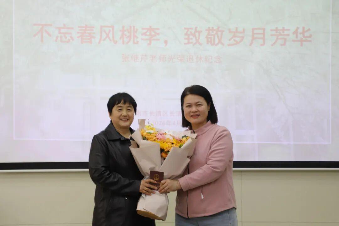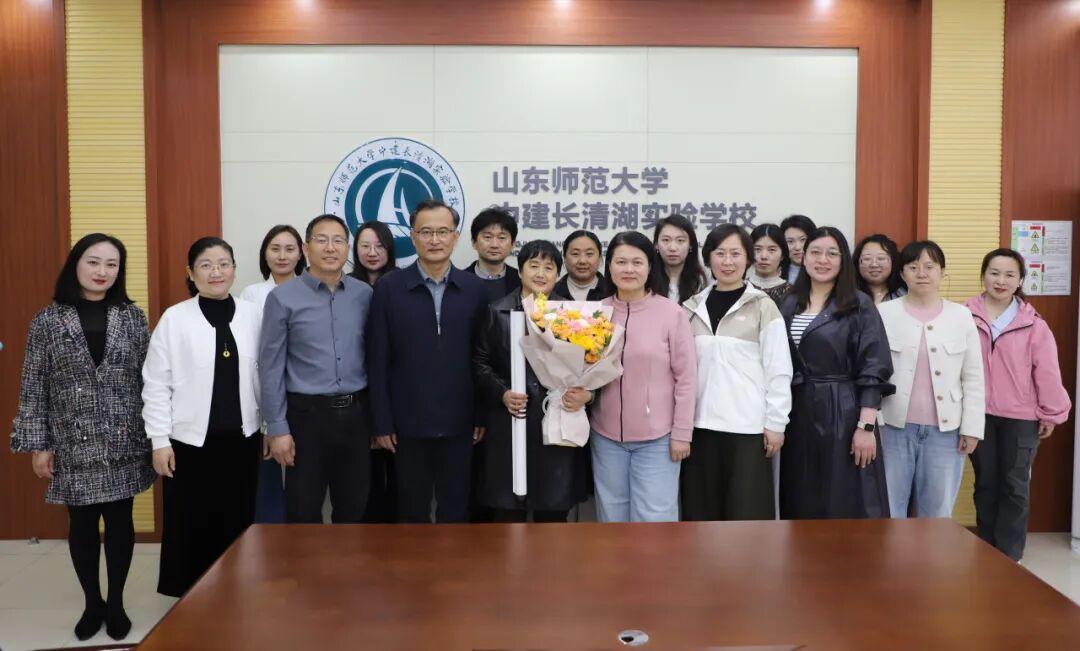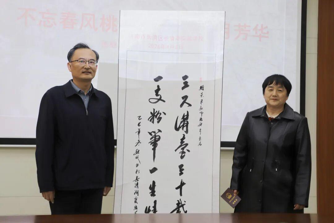 济南市长清区长清湖实验学校4月3日为张继芹老师举行荣休欢送仪式,小学部副校长孙洪艳致辞,校长徐君讲话并与副校长、小学部校长李国瑞为张老师送上饱含敬意的鲜花与精心准备的纪念书法作品。