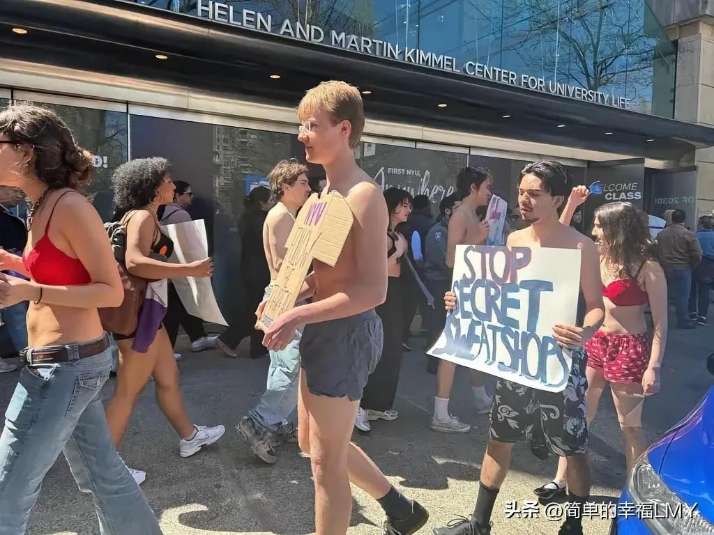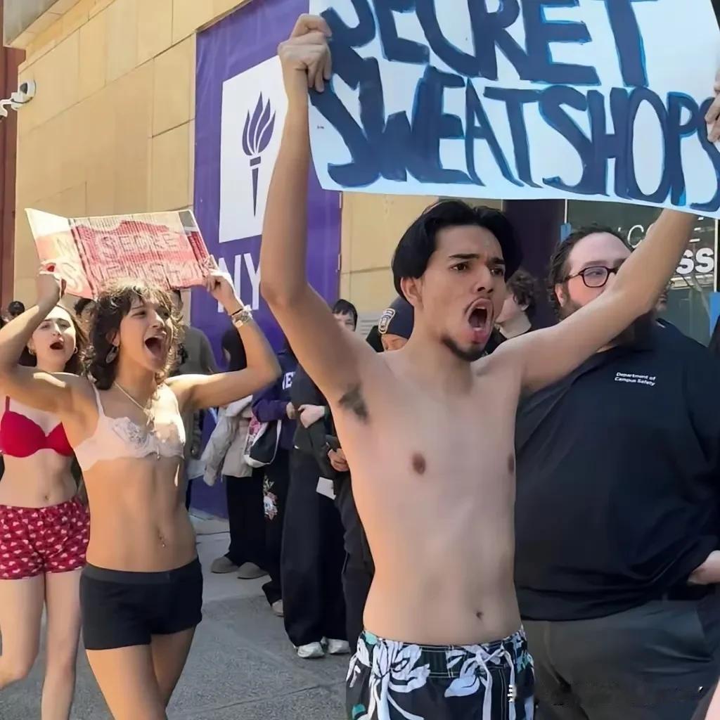 4月18日,纽约大学学生集体抗议血汗工厂,因为他们的衣服来自印度、巴基斯坦、越南、孟加拉国等国,这里的工人为西方品牌生产衣服鞋帽,但他们工资低下、工时过长,劳动权益受到严重侵犯。 当地时间4月18日,美国纽约大学校园内爆发了一场引人注目的学生集体抗议活动,一群年轻学子不再沉默,勇敢站出来,直指校园周边及校方采购的服饰背后,藏着触目惊心的血汗工厂黑幕。 用实际行动为远在异国的底层劳工发声,这场抗议不仅震动了整个校园,更撕开了西方时尚产业光鲜外表下的残酷真相。这场抗议的起因,直指纽约大学相关服饰、鞋帽产品的供应链。 学生们经过长期调查发现,学校售卖的校服、文创服饰以及合作品牌的周边产品,大多产自印度、巴基斯坦、越南、孟加拉国等东南亚、南亚国家。 而这些为西方大牌、高校定制产品代加工的工厂,完全是名副其实的血汗工厂,当地工人们承受着非人的待遇,劳动权益被肆意践踏,却只能在生存边缘苦苦挣扎。 在这些代加工工厂里,底层劳工的处境令人心酸。他们每天要工作十几个小时,远超正常工时,长时间超负荷劳作,连基本的休息时间都无法保障。 拿着微薄到难以糊口的工资,薪资水平远低于当地最低生活标准,辛苦劳作一个月,赚的钱甚至不够维持一家人的基本温饱。 工厂工作环境恶劣不堪,车间拥挤脏乱、安全设施缺失,没有合理的劳动保障,没有工伤赔偿,更没有工会为他们维护权益,完全处于被剥削、被压榨的无助境地。 一边是西方高校、时尚品牌卖出高价产品,赚得盆满钵满,纽约大学一件普通卫衣售价就高达106美元,溢价惊人。 一边是代工厂工人被压榨到极致,用血汗换来的利润,全被西方资本方攫取,这种极度的不公,让纽约大学的学生们再也无法坐视不理。 他们走上校园街头,高举标语,高声呐喊,向校方提出明确且坚定的两大诉求:第一,校方必须全面、透明地公开所有合作代工厂的完整信息,不再隐瞒供应链真相,接受公众监督。 第二,立即停止采购、售卖任何来自血汗工厂的产品,彻底切断与剥削性代工厂的合作,拒绝成为压榨劳工的帮凶。 为了让更多人关注到这场不公,关注到血汗工厂工人的悲惨遭遇,一些女大学生更是鼓起莫大的勇气,脱掉上衣,以极具冲击力的方式表达抗议,她们情绪激动,眼神坚定,不顾外界眼光,只为唤醒更多人的良知,倒逼校方正视问题。 而现场众多男同学也第一时间站出来,紧紧站在这些勇敢女生身边,全力支持她们的抗议行动,手挽手、肩并肩,形成一股强大的青年力量,让这场抗议更具感染力,也让更多人看到了年轻学子的责任与担当。 长久以来,西方高校、知名品牌一直打着体面、高端的旗号,却始终刻意隐瞒产品供应链的黑暗真相,对海外代工厂的血汗剥削视而不见。 他们享受着低成本代工带来的巨额利润,却对劳工的苦难漠不关心,用一套看似合规的行为准则敷衍了事,即便面对质疑,也始终回避、隐瞒,不肯公开完整供应链信息,本质上就是默许血汗工厂的存在,默许这种非人道的剥削持续发生。 纽约大学的学生们,并非一时冲动的抗议,而是对这种不公现象的彻底反抗。他们清楚,自己身上穿的校服、手里买的周边,每一件都沾满了底层工人的血汗,资本方赚得盆满钵满,却无人为这些工人发声。 作为接受高等教育的年轻人,他们不愿成为资本的附庸,不愿对这种不公视而不见,即便抗议方式引发争议,即便面临校方的压力,也依旧选择勇敢站出来,为远在异国、毫无话语权的劳工们争取一丝公道。 这些年轻学子用行动证明,良知从未缺席,正义从未缺席。他们敢于撕开西方品牌的虚伪面具,敢于直面校方的敷衍搪塞,敢于用自己的方式对抗资本的冷漠与剥削,这份勇气值得敬佩。 反观纽约大学,面对学生的合理诉求,依旧用官方话术敷衍回应,声称产品遵循劳动标准,却始终不肯公开完整工厂信息,这种避重就轻的态度,恰恰印证了背后的问题。 西方资本一直标榜人权、公平,可在利益面前,所谓的人权不过是一句空话,对海外劳工的肆意压榨,早已戳破了他们的虚伪面具。 这场抗议还在持续,纽约大学的学生们用青春与勇气,为底层劳工发声,为公平正义抗争。他们的行动,不仅是对校方的施压,更是对所有西方品牌的警醒。 血汗工厂的黑幕藏不住,资本的剥削终将被揭露,每一个被践踏的劳动权益,都值得被正视、被维护!