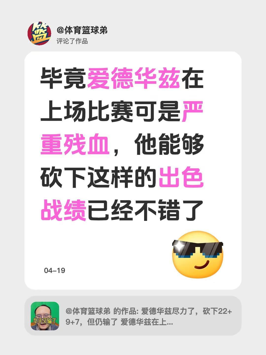 我评论了@体育篮球弟 的作品:毕竟爱德华兹在上场比赛可是严重残血,他能够砍下这样