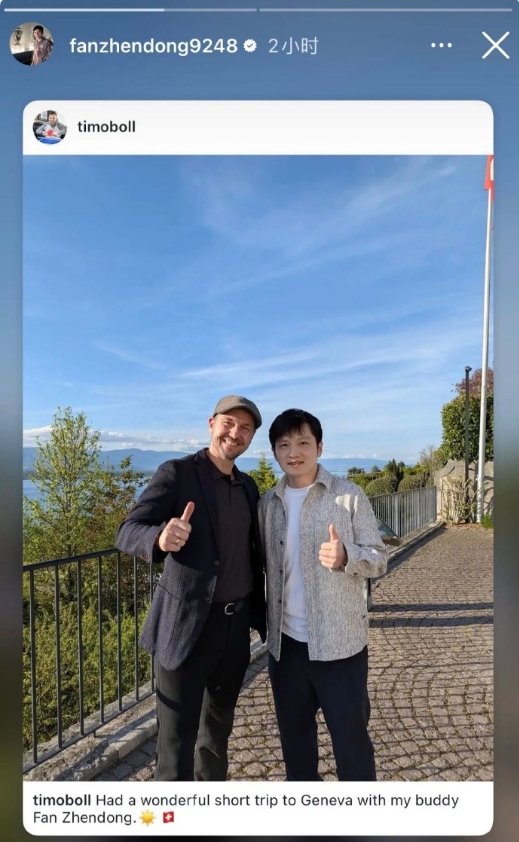 • 波尔配文:"阳光正好,和好兄弟樊振东一起在日内瓦度过一段超棒短途旅行"