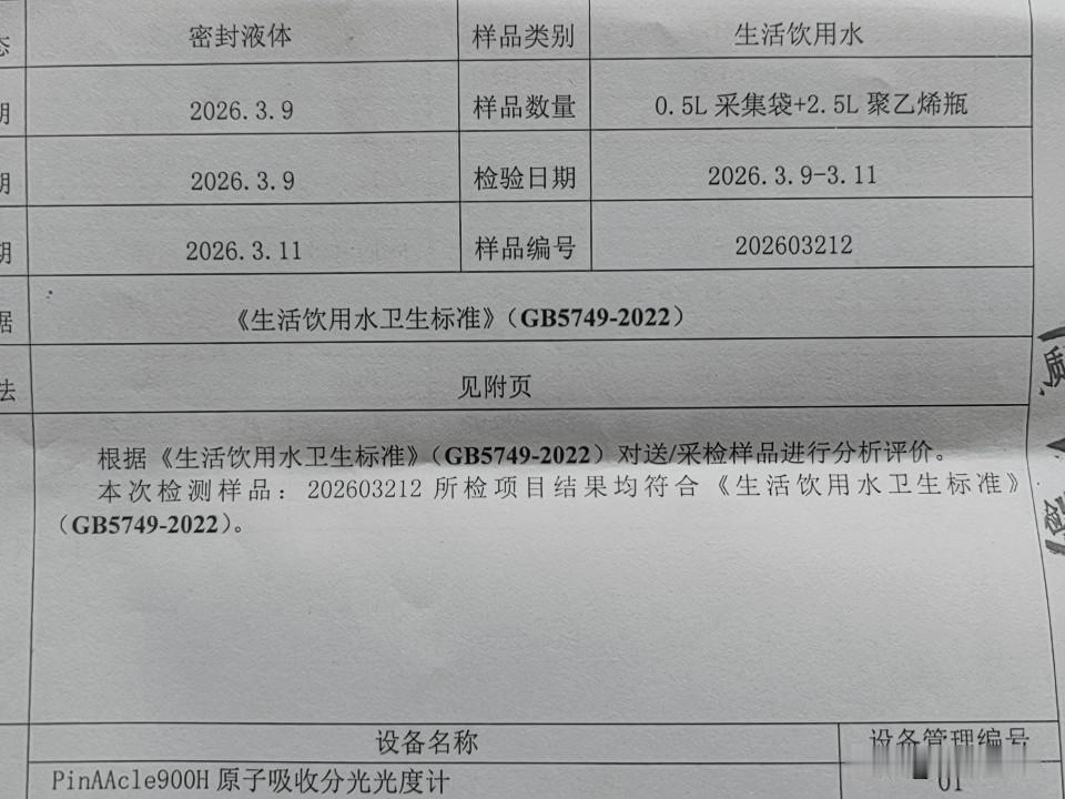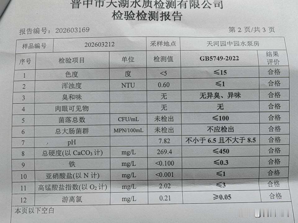 晋中市天湖水质检测有限公司在2026年出具的检测报告有效期至2029年6月29日 晋中高度重视人民生活饮用水的安全,自来水公司下设有水质检测专门公司,采用高级设备原子吸收风光光度计,紫外可见风光光度计,浊度仪,酸度计,对0.5升的采集带和2.5升聚乙烯瓶装的饮用水,进行严格的技术检测,共认定12个标准科目全部合格,这份报告针对的是天河园中园小区的饮用水质量。天河园中园和红星天铂是一个开发商先后开发的超级片区,过去,曾经被众人批评开发水平不怎么样,但现在,从物业各角度来看,这小区住的是让人比较放心和满意的。虽然并不完美,但是其他小区连他也远远不如。